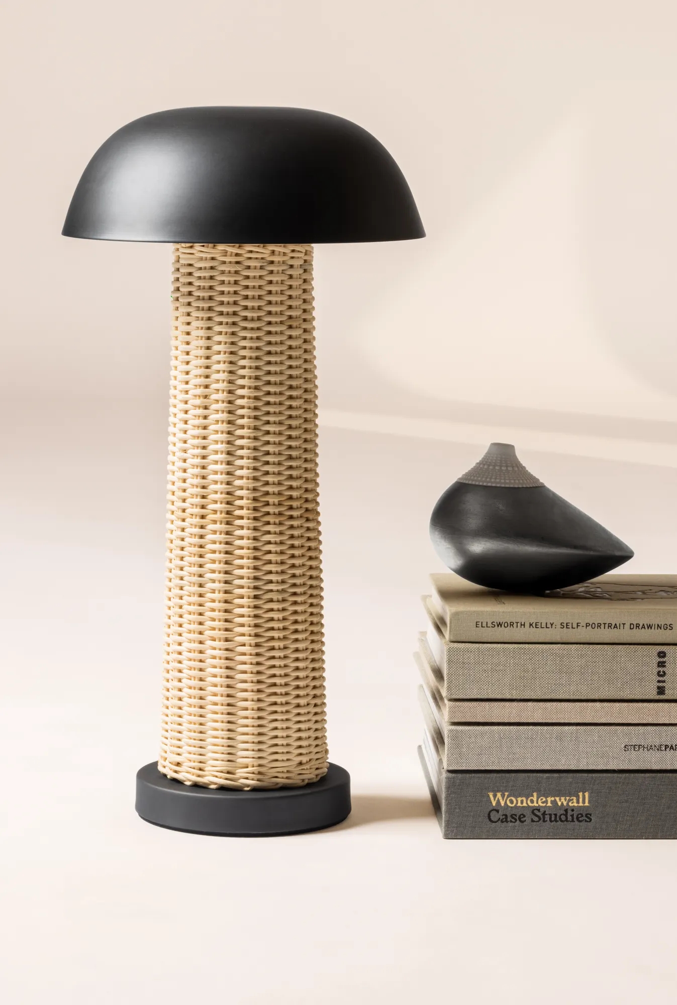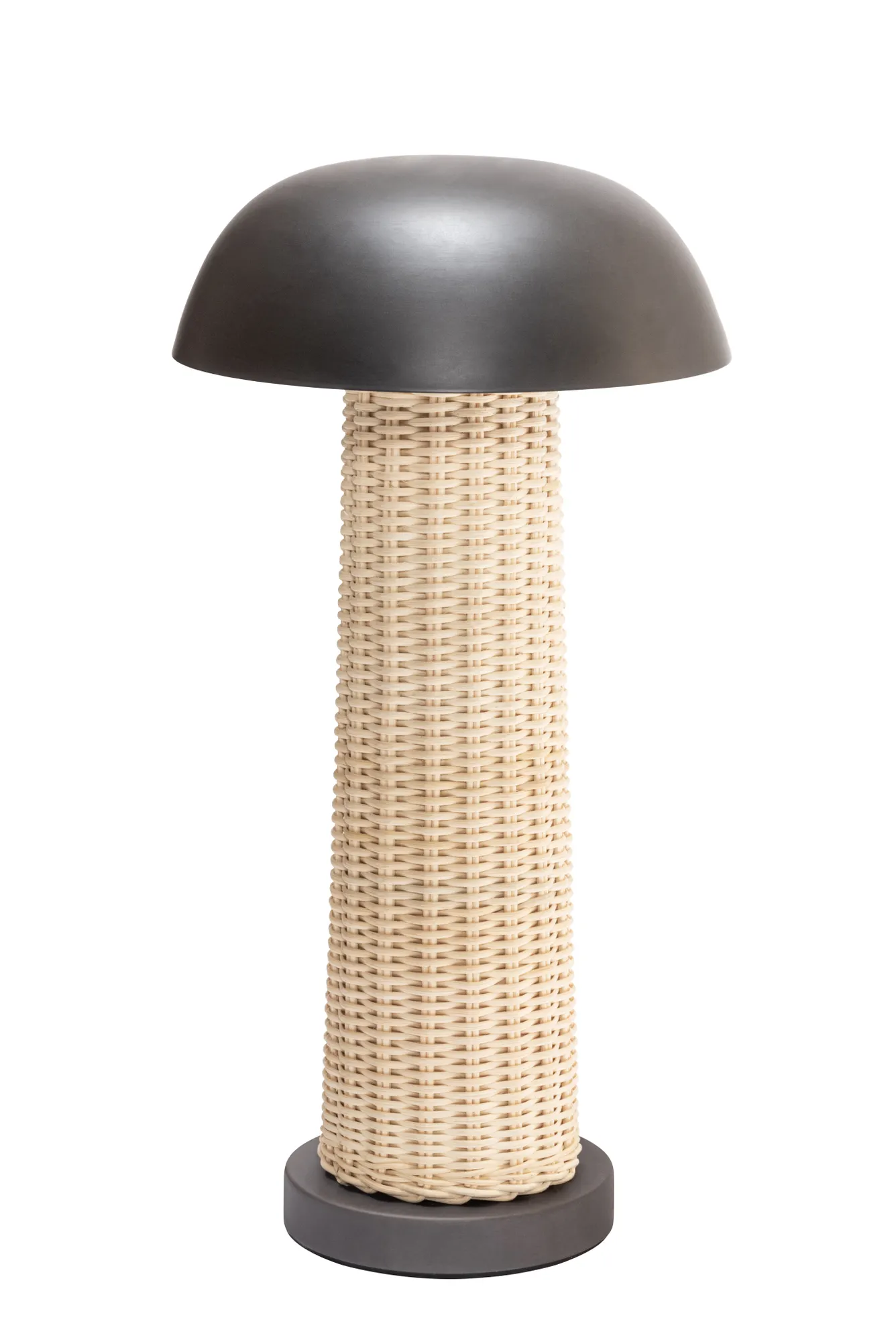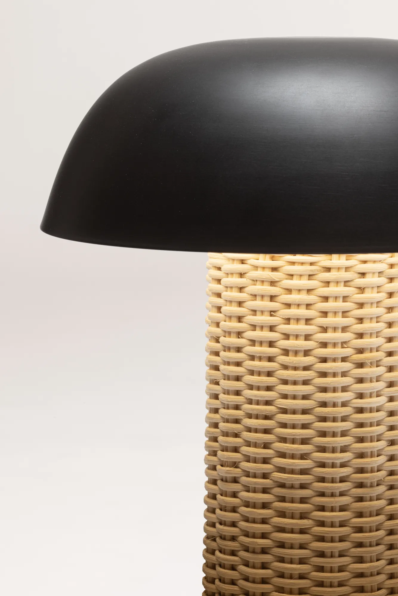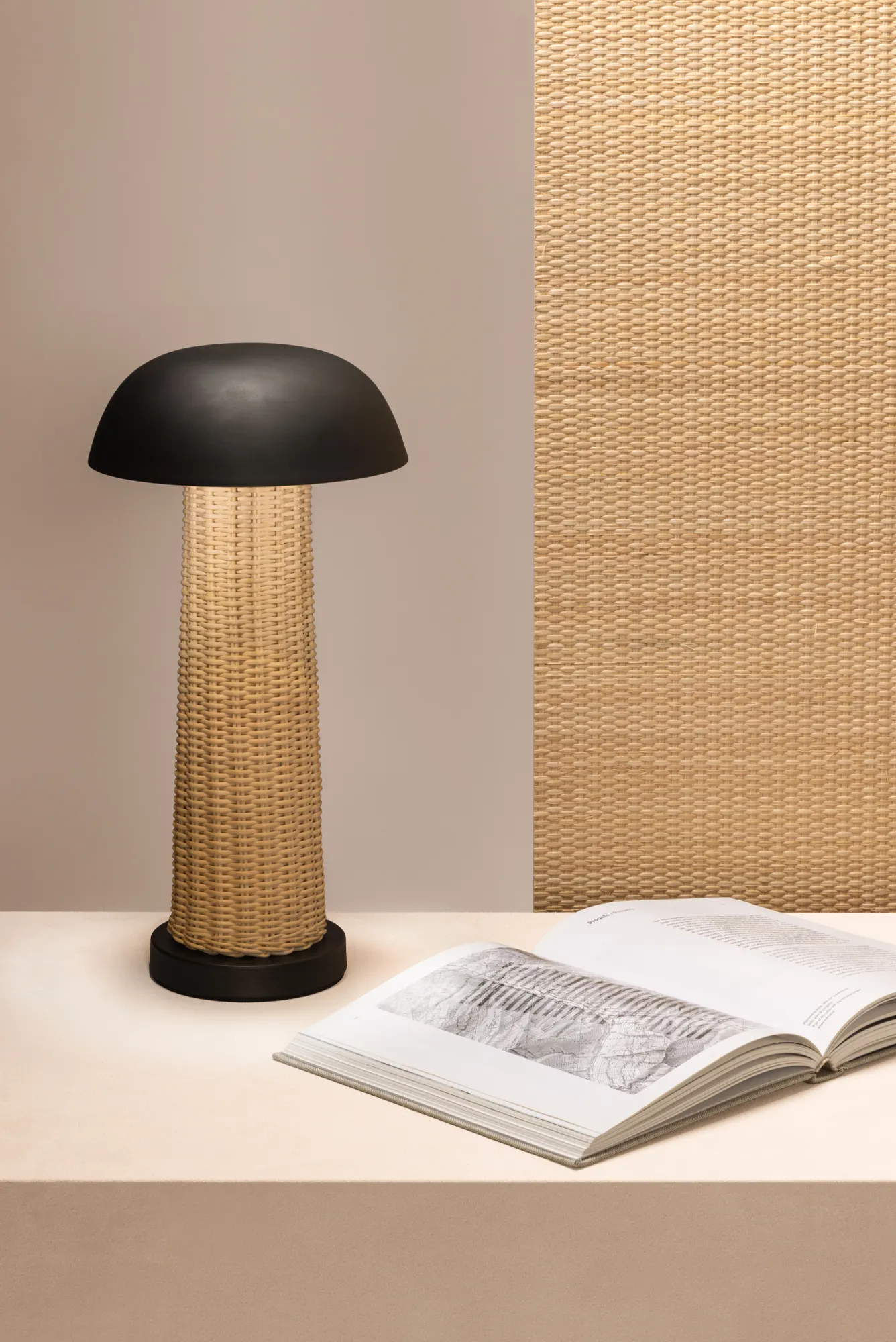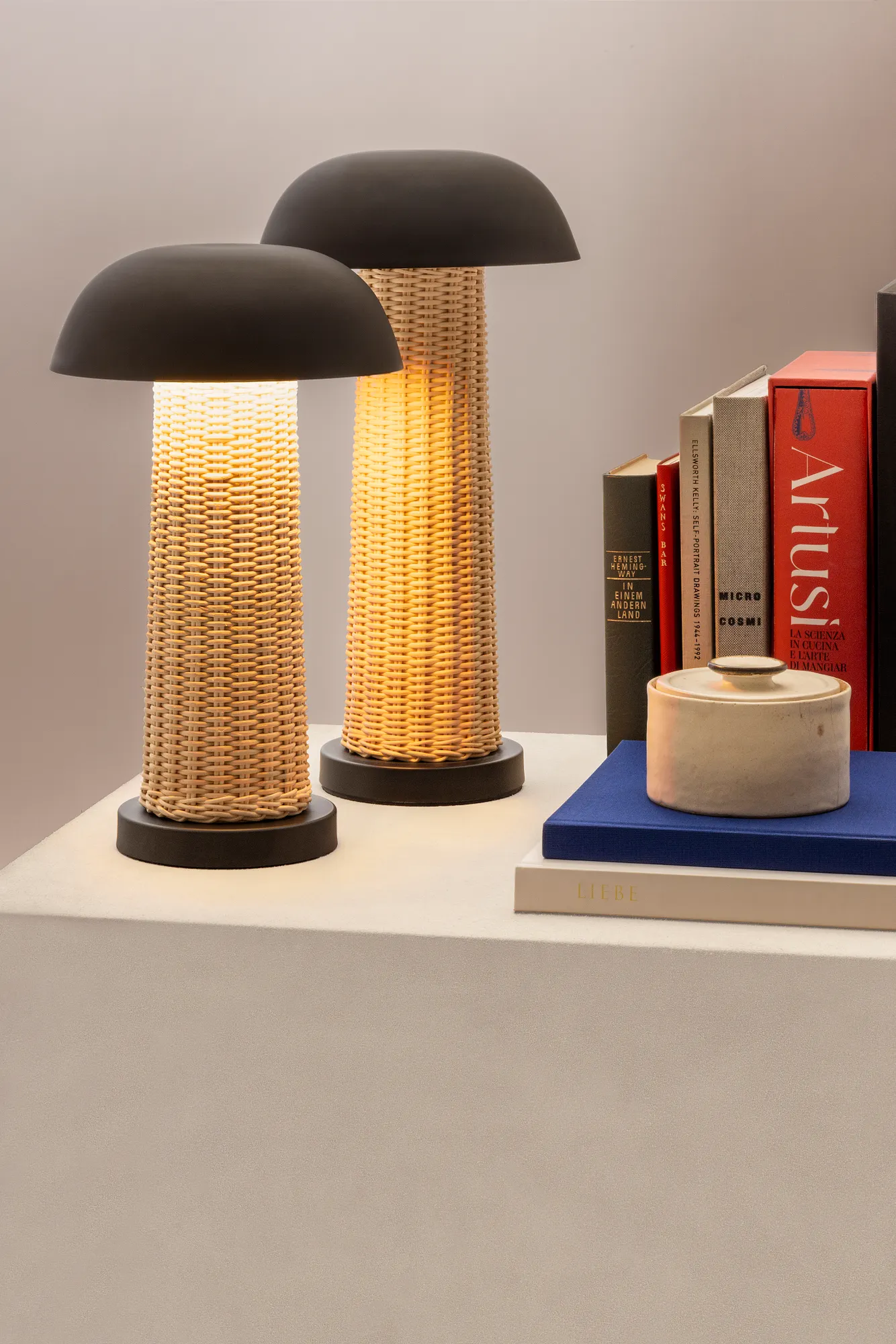 Boasting distinctive features that makes this lamp stand out, Duomo combines references to the lighting trends of the 1970s with clean, minimal lines and geometrical volumes, as well as unique materials, resulting in a sculptural luminous appearance. Featuring an iconic curved bronze lampshade and plinth, this lamp sits upon a base covered with woven rattan, which provides the piece with a lighter, informal feeling. This lamp casts a soft ambient light that's ideal for reading and lounging.