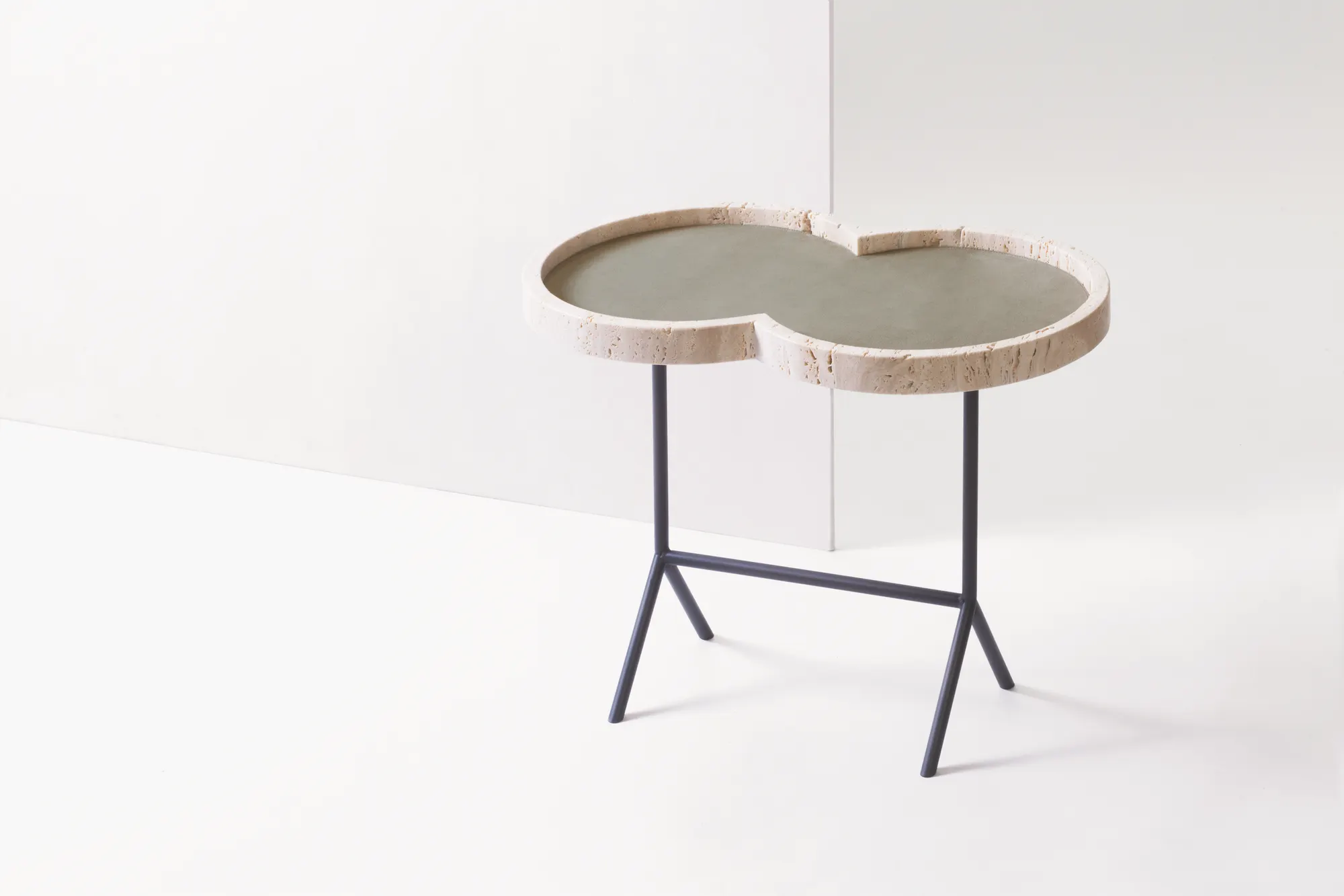 The solid top, made of travertine or leather covered wood, almost floats on the clean lines of the bronze base, creating an effect contemporary and natural at the same time, heavy yet light, mobile yet stationary. A distinctive and lyrical visual vocabulary that performs an exercise of true geometry in the air.