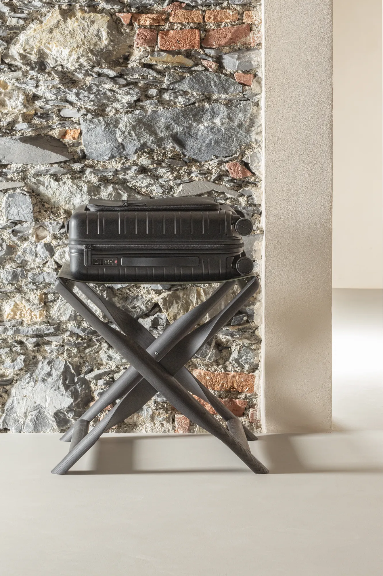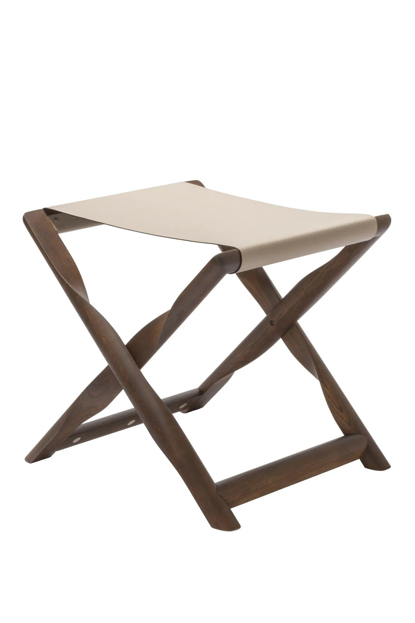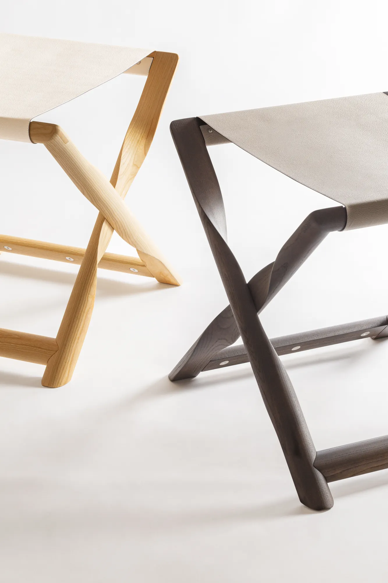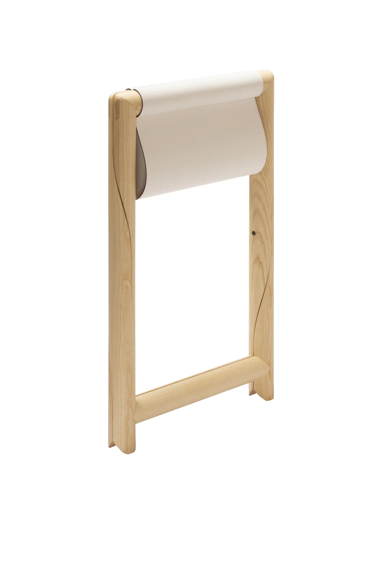 Sturdy oak folding structure with soft leather rest. Magnetic closing.