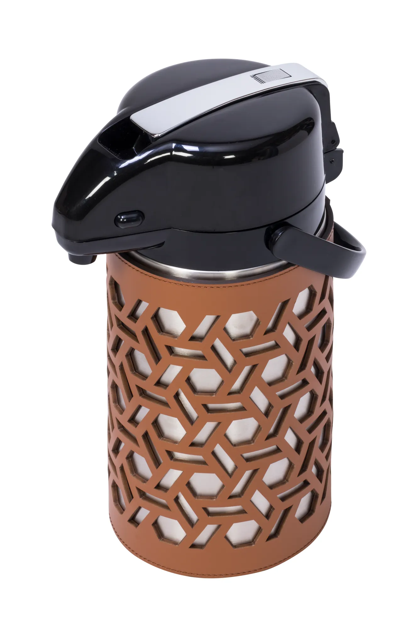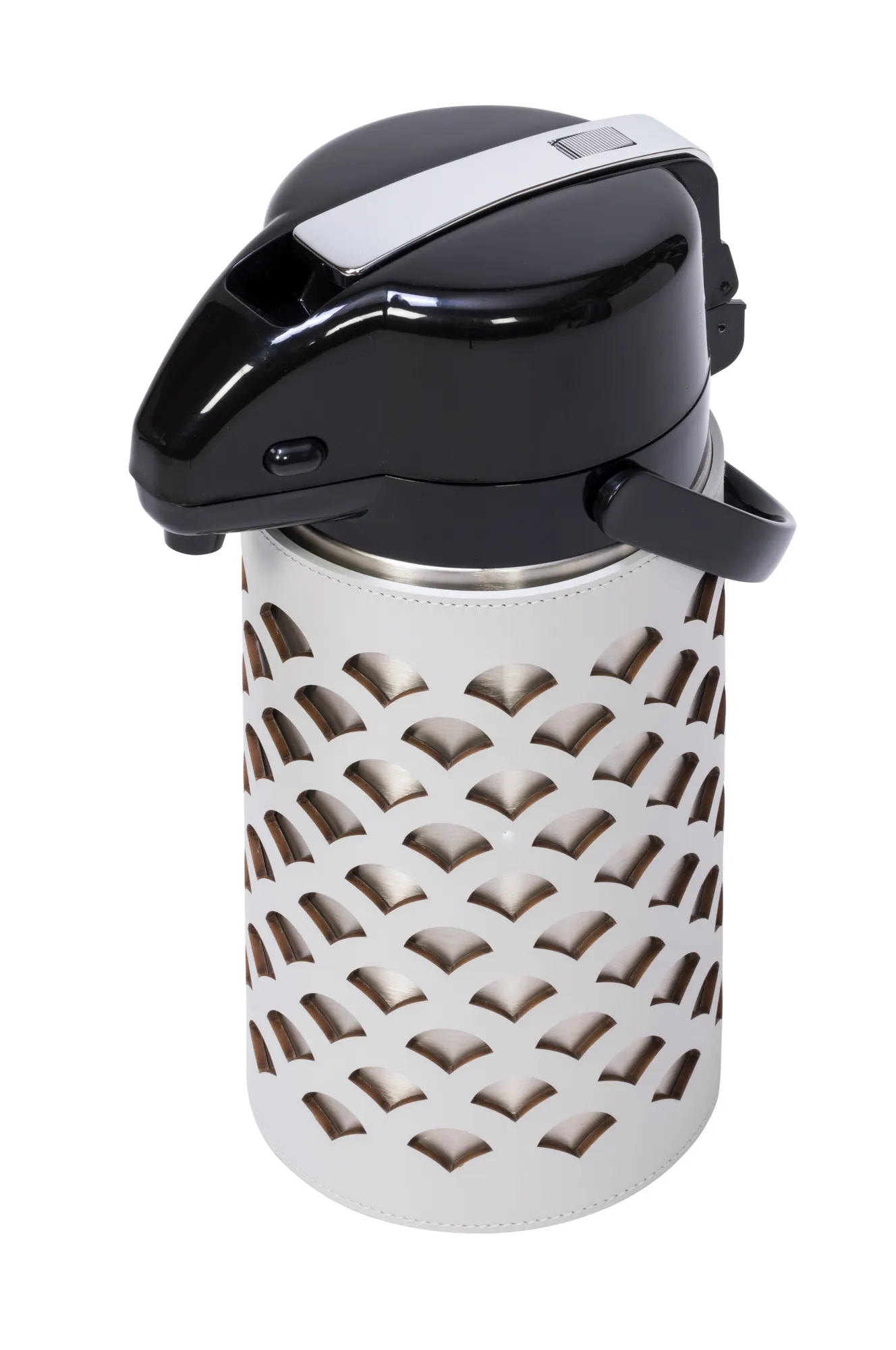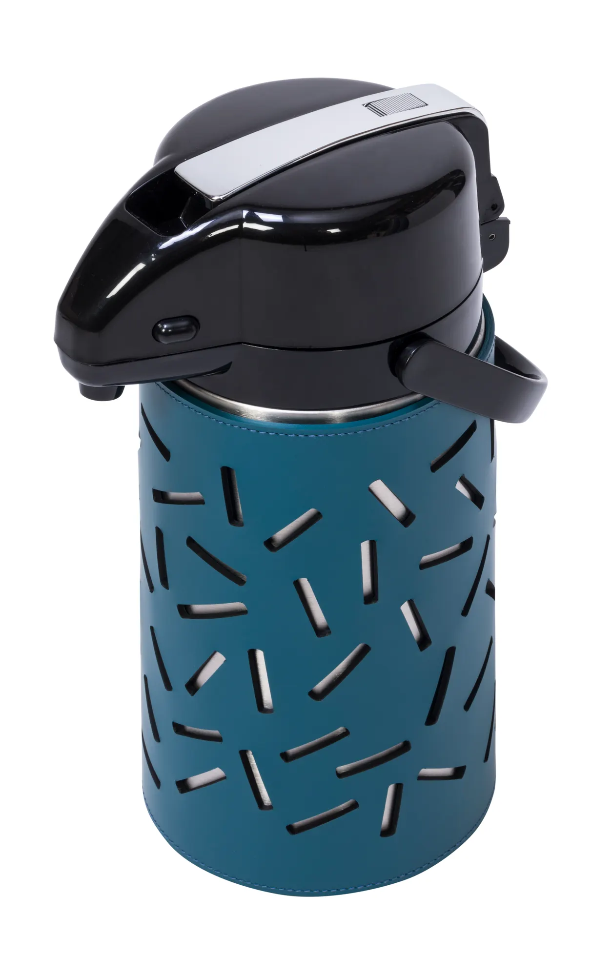 Insulated stainless steel airpot covered in finest regenerated leather structure with water-resistant and UV-resistant finish. It features a pour-through stopper and a removable head. Double wall stainless steel liner with vacuum. Head and handle in polished black PP, chrome plated lever and rotating base for multi-directional cup filling. Able to maintain hot or cold beverages' temperature for up to 24 hours. Provided with rotating base.