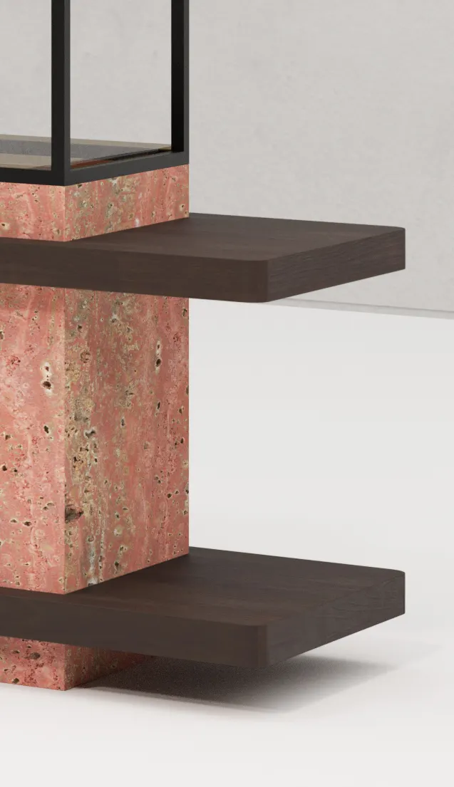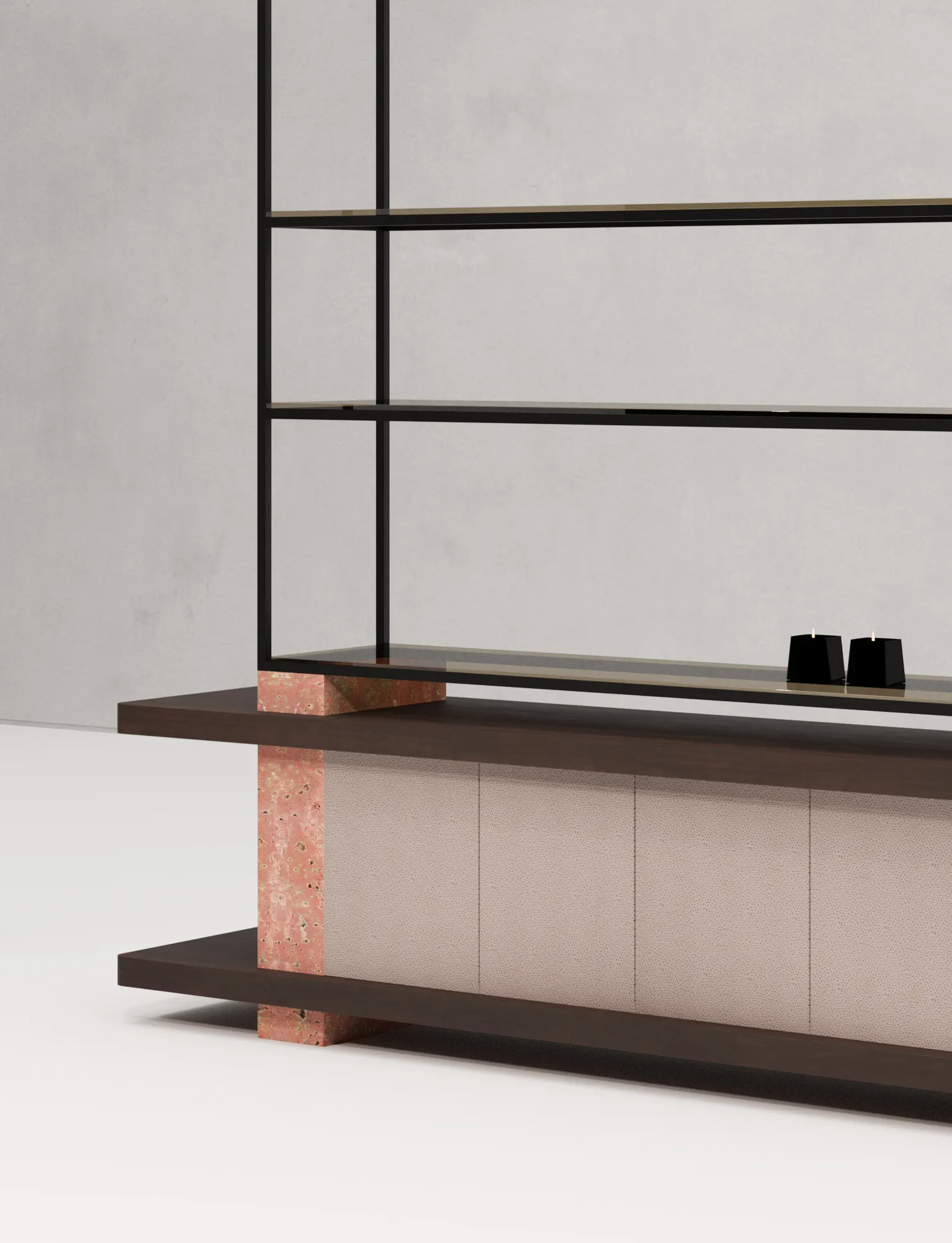 Partially leather-covered wood base with monolithic travertine side legs. Upper frame in burnished brushed bronze and bronze-coloured tempered glass shelves. Eventual drawers and/or doors are provided with a push-pull mechanism. Custom sizes available on request.