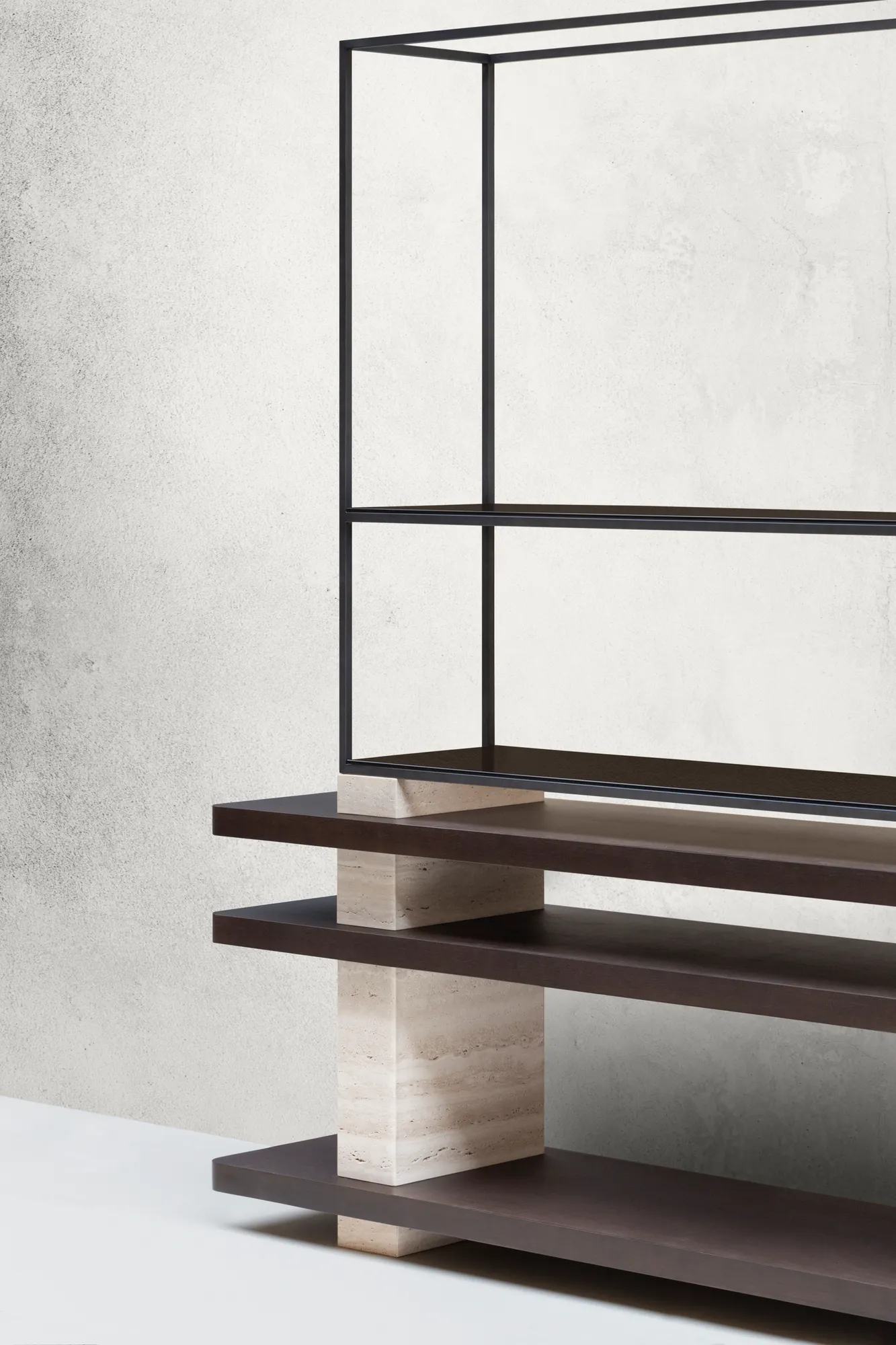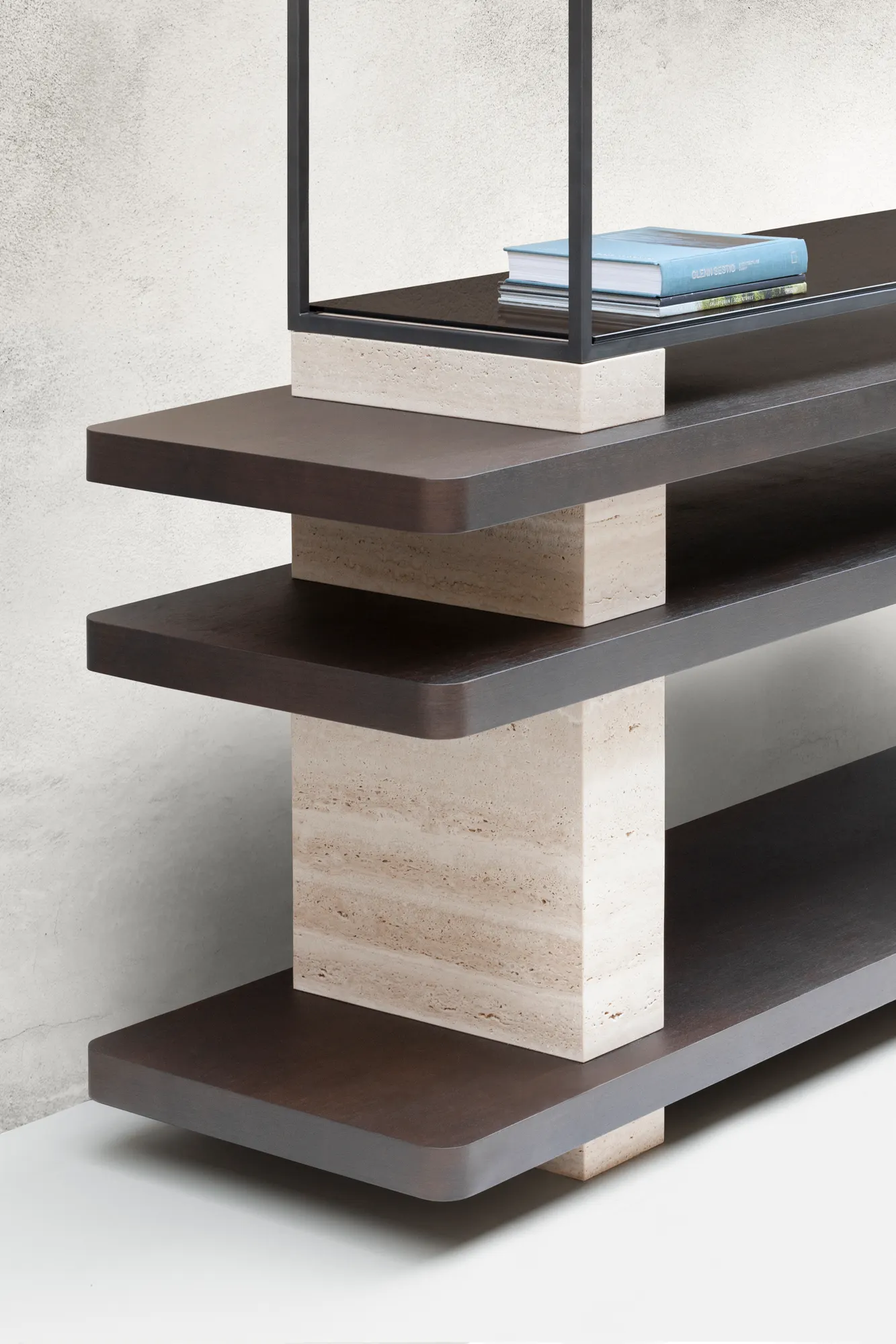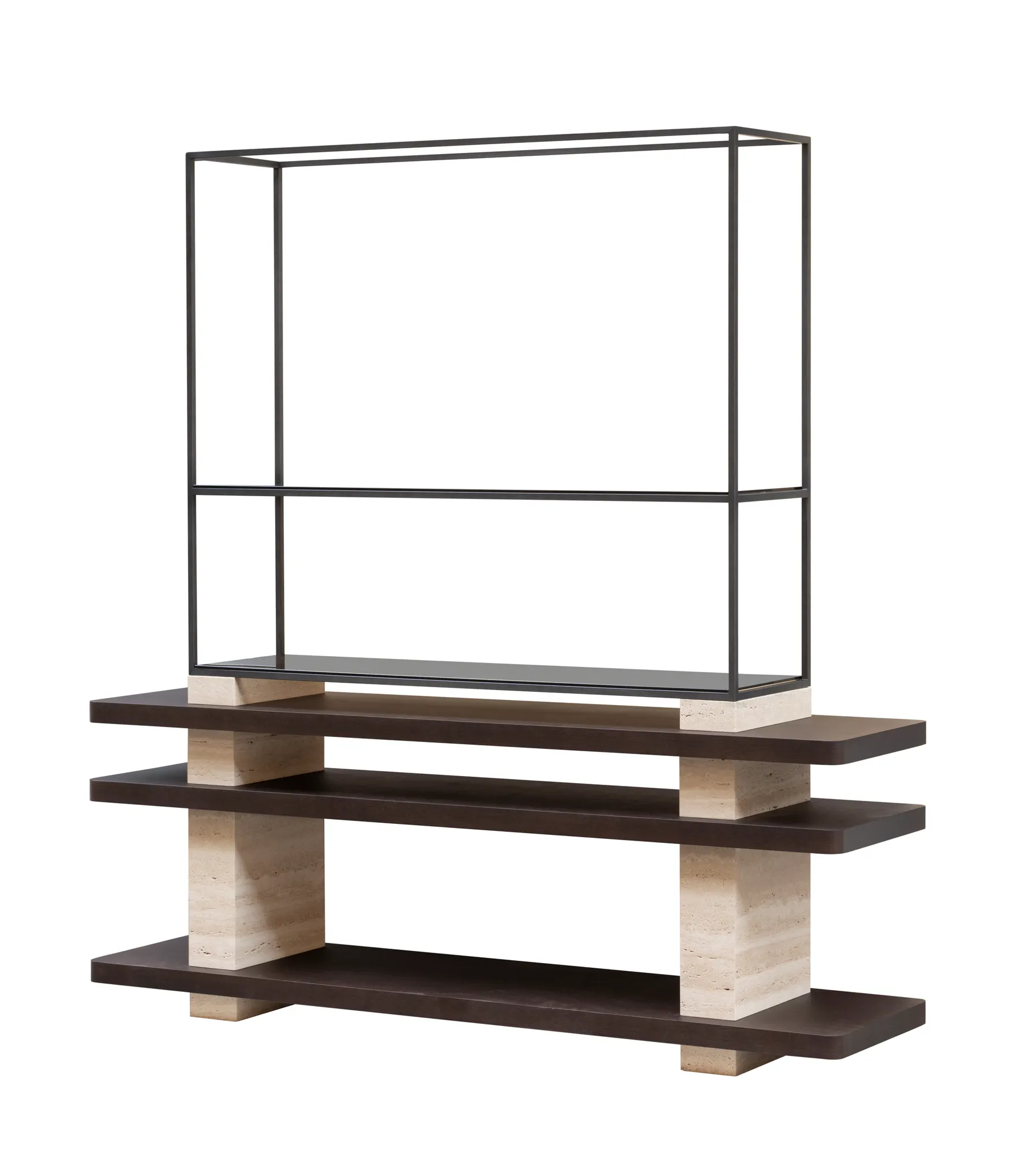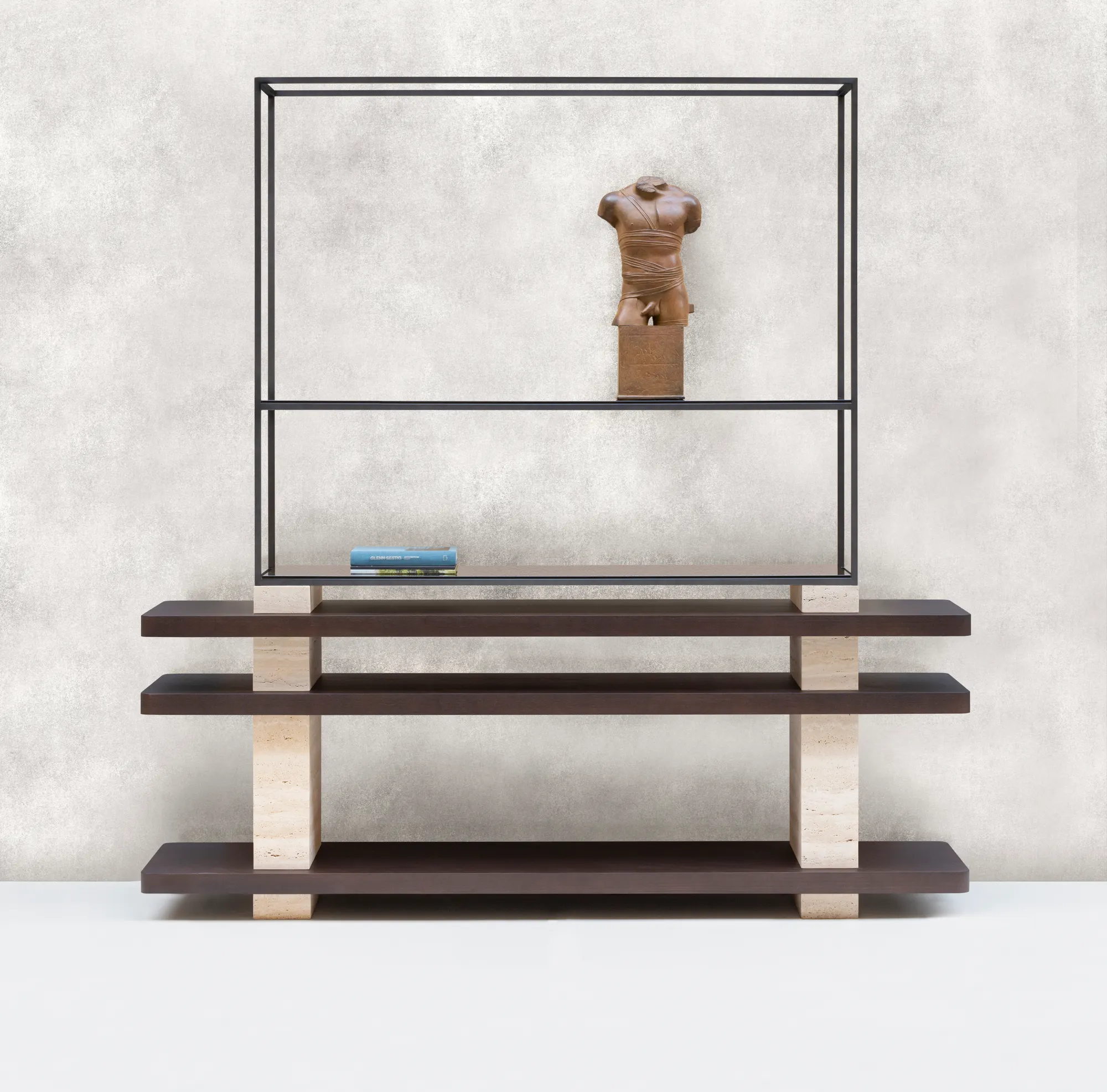 Partially leather-covered wood base with monolithic travertine side legs. Upper frame in burnished brushed bronze and bronze-coloured tempered glass shelves. Eventual drawers and/or doors are provided with a push-pull mechanism. Custom sizes available on request.