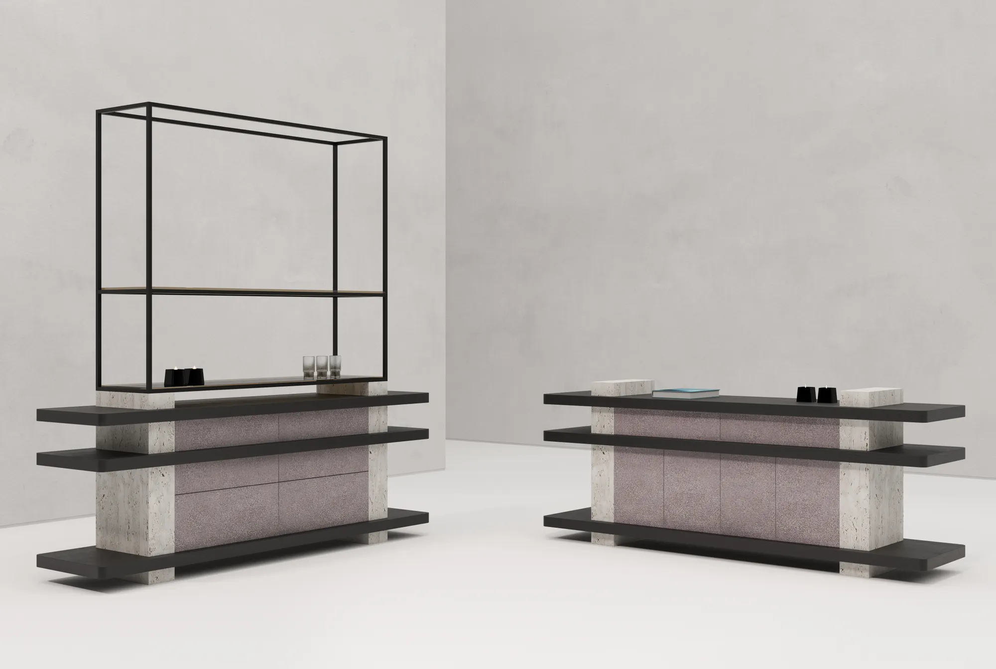 Partially leather-covered wood base with monolithic travertine side legs. Choose between two available wood finishes and five travertine colours. Custom sizes available on request.