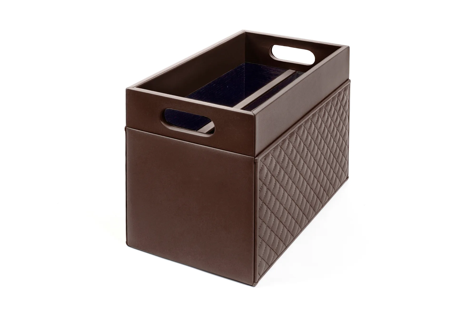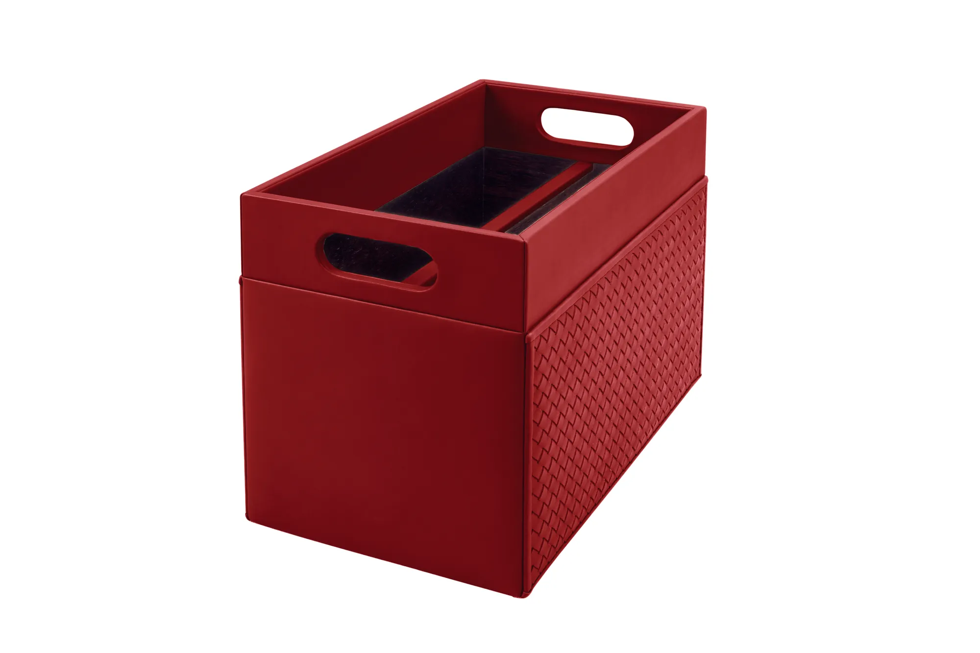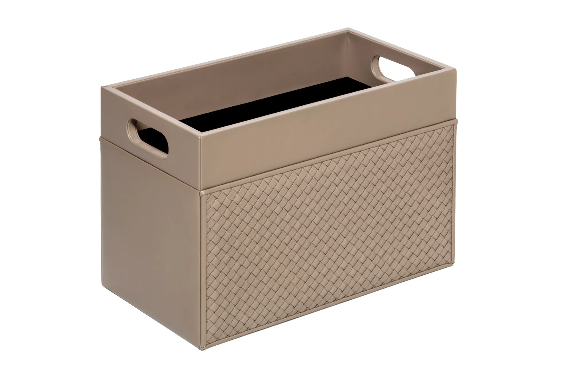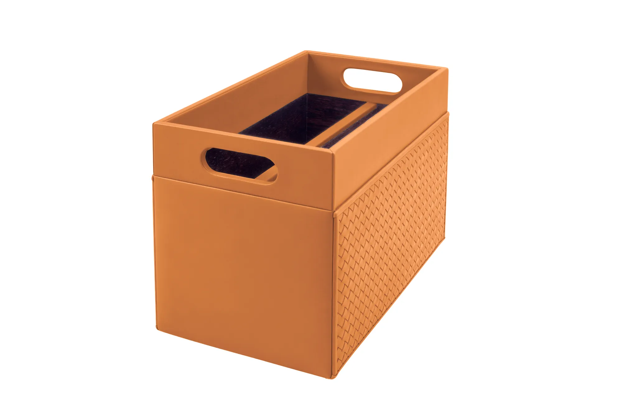 Leather magazine holder, handwoven leather on two sides, lining in varnished wood. It features a central divider.