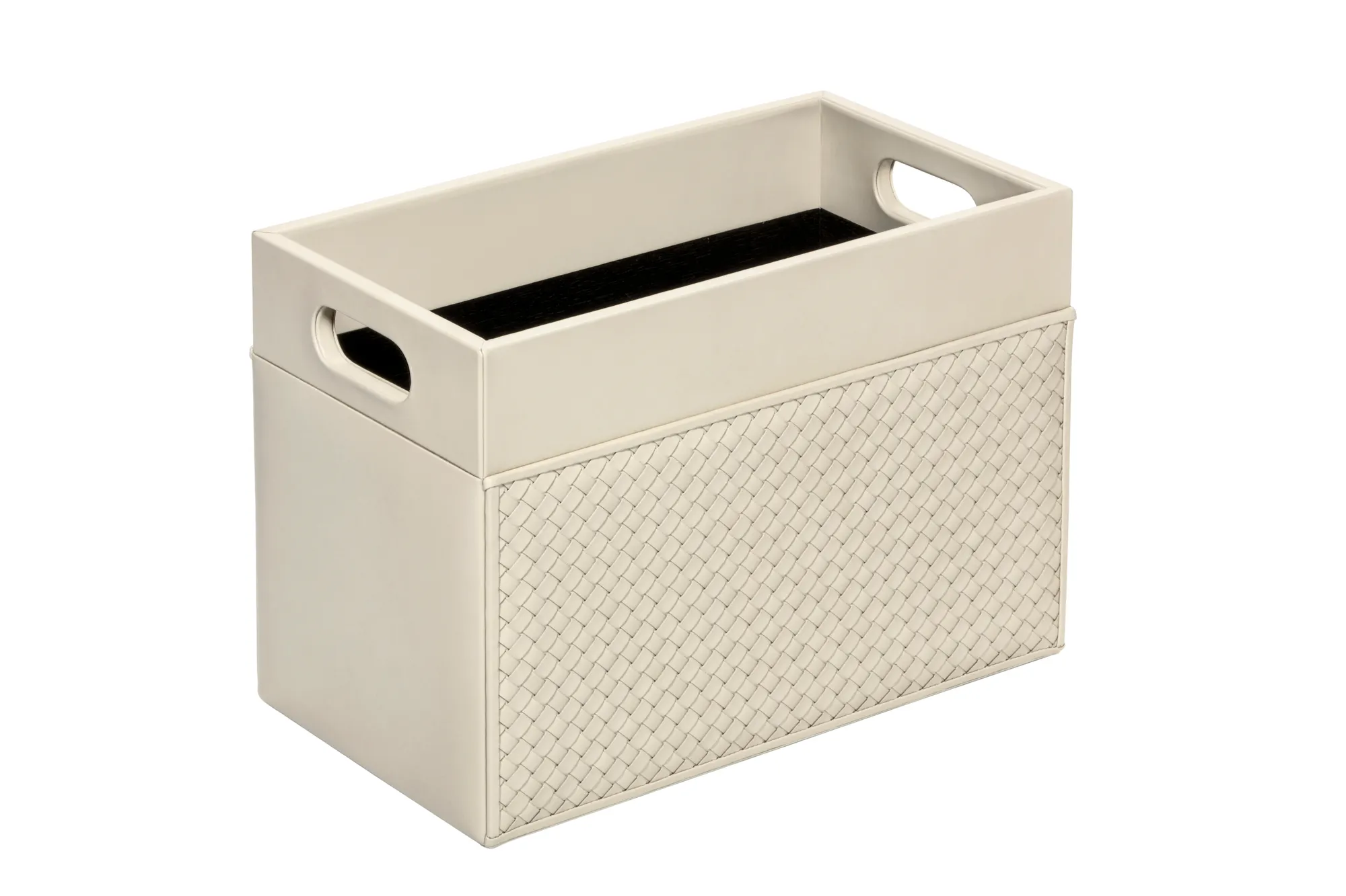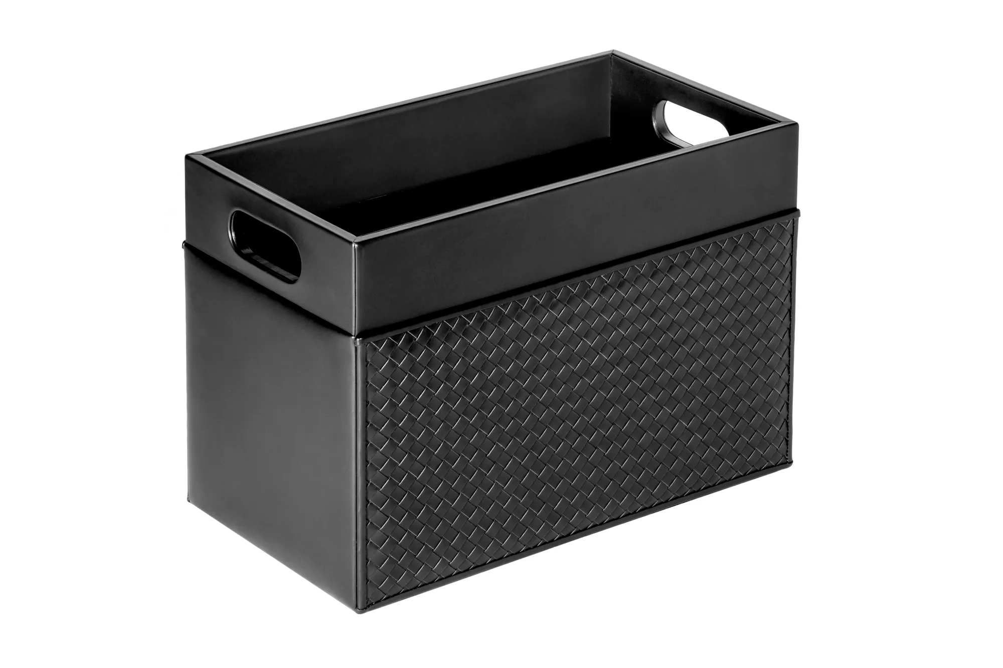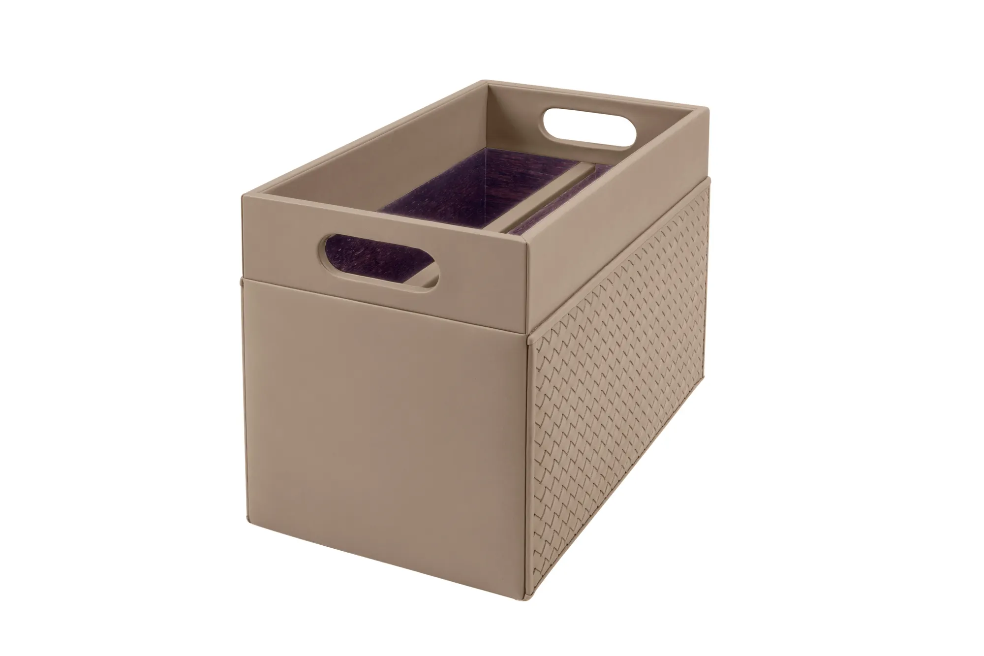 Leather magazine holder, handwoven leather on two sides, lining in varnished wood. It features a central divider.