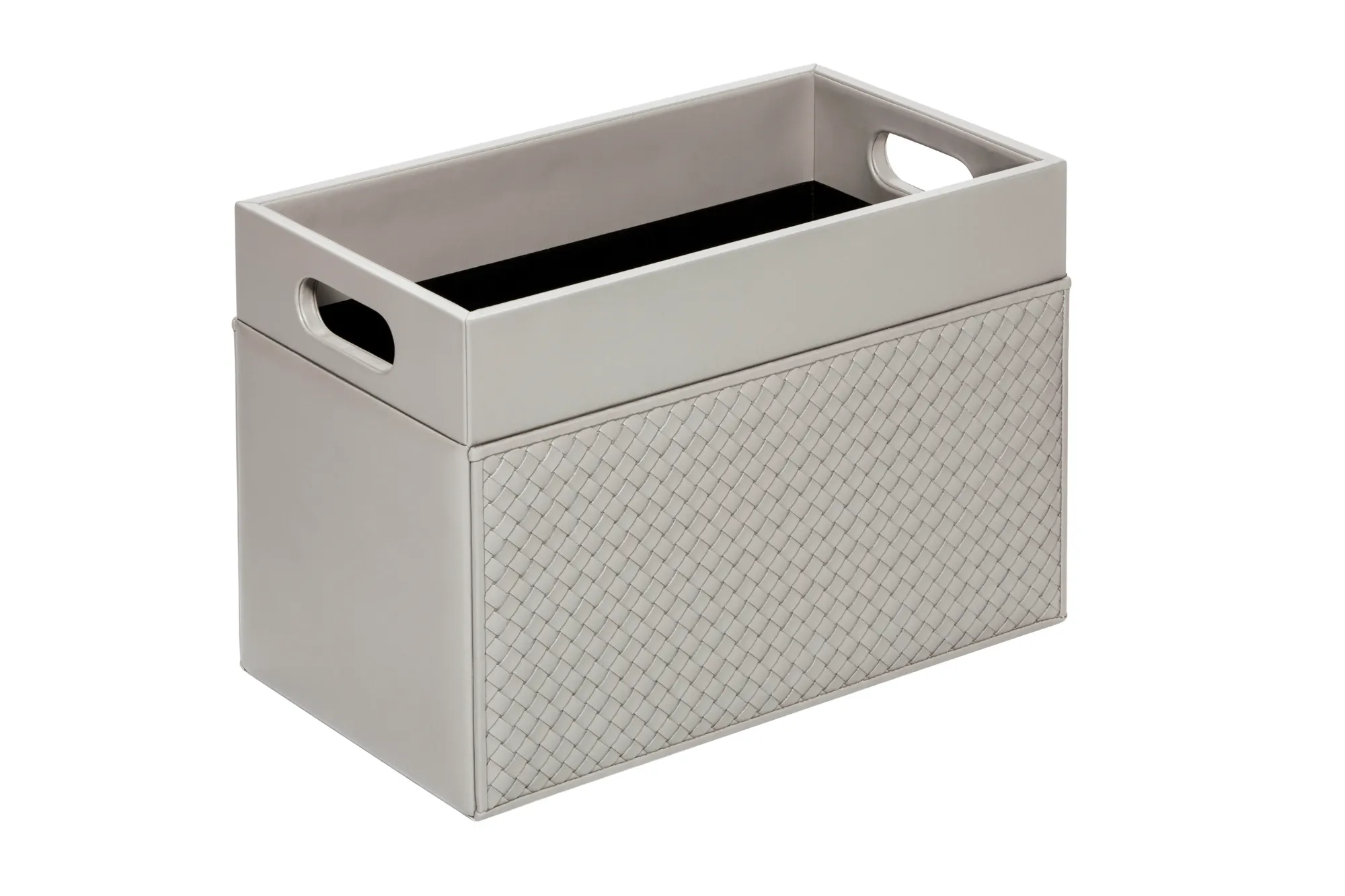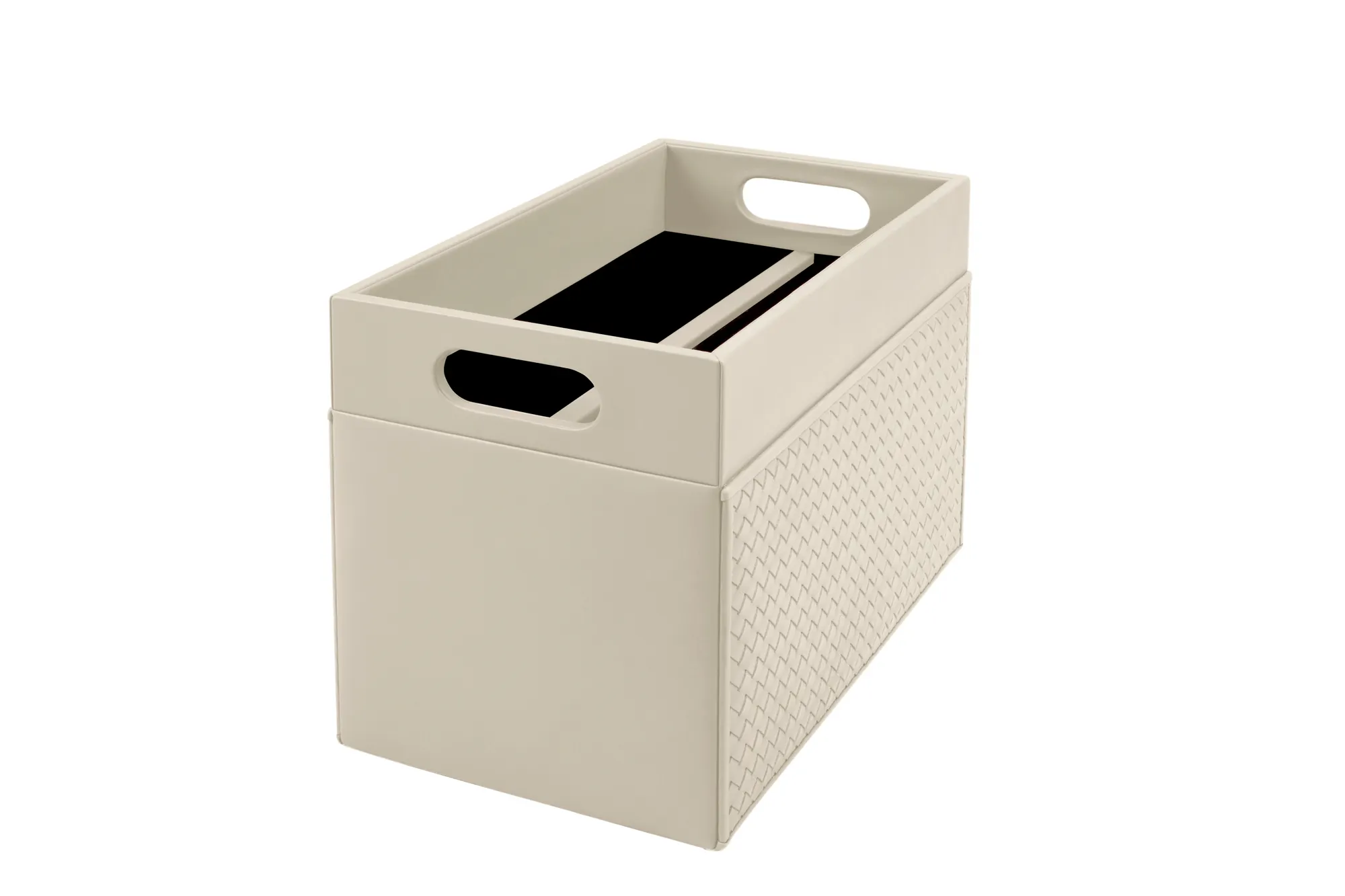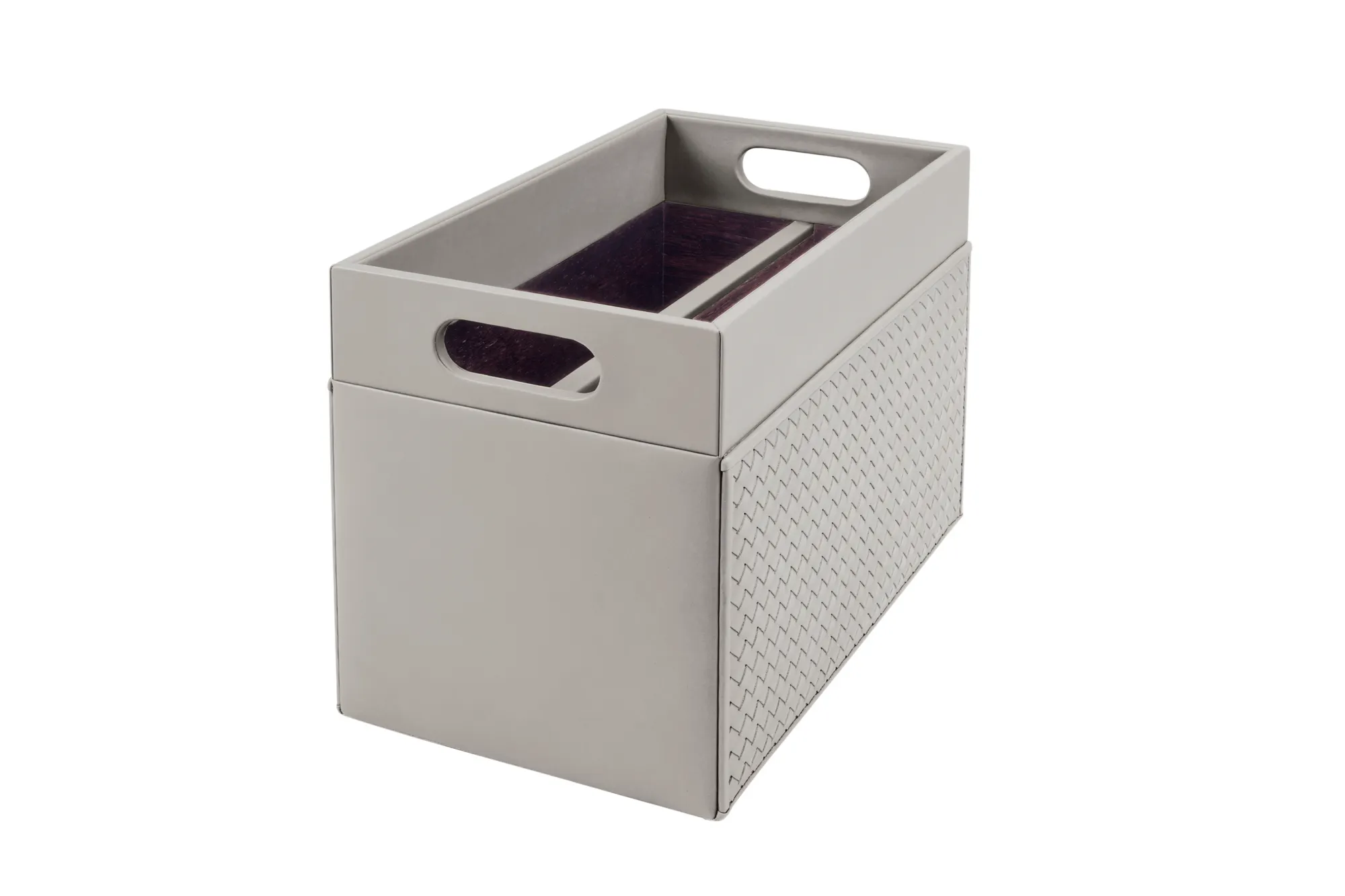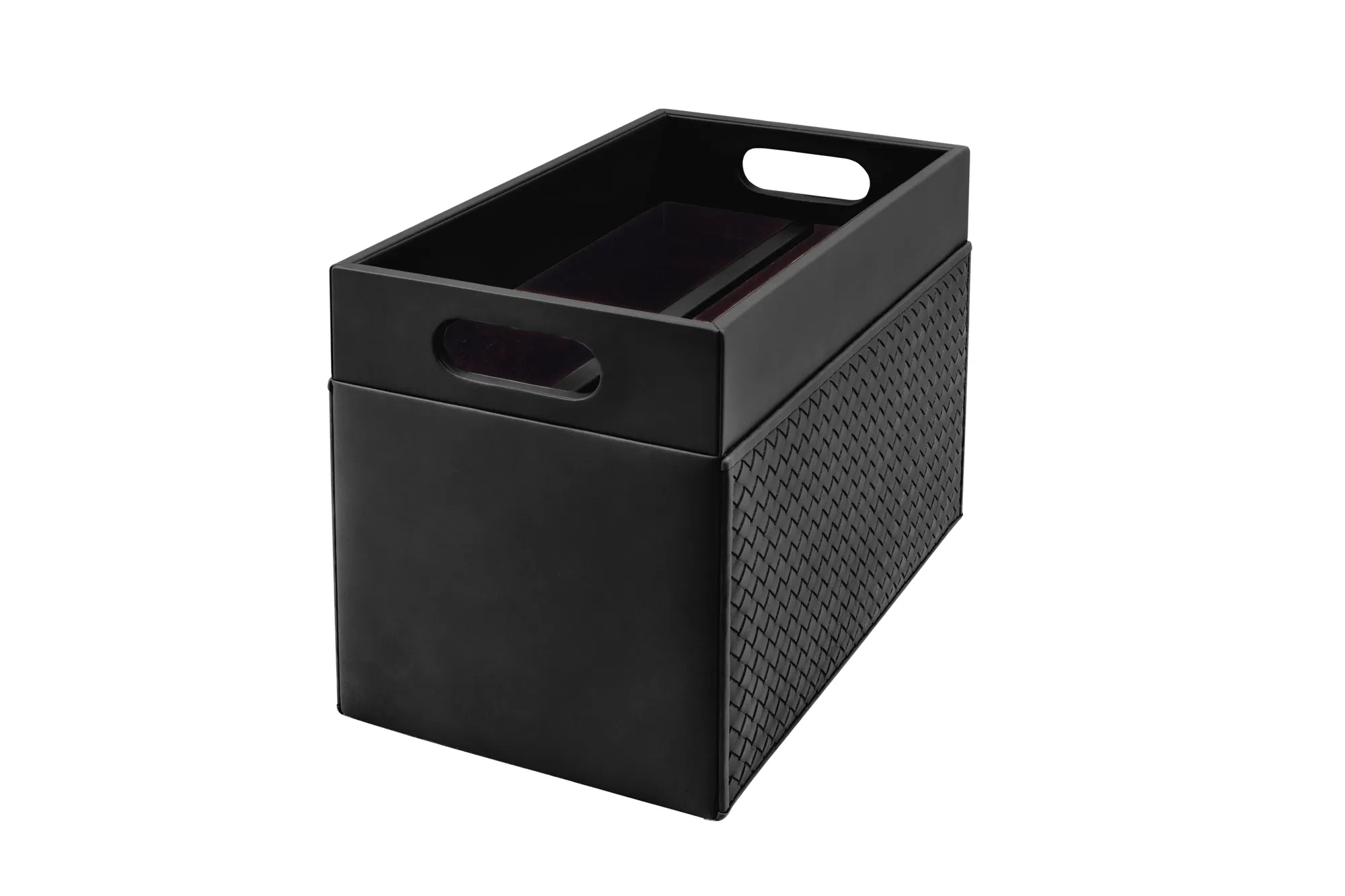 Leather magazine holder, handwoven leather on two sides, lining in varnished wood. It features a central divider.