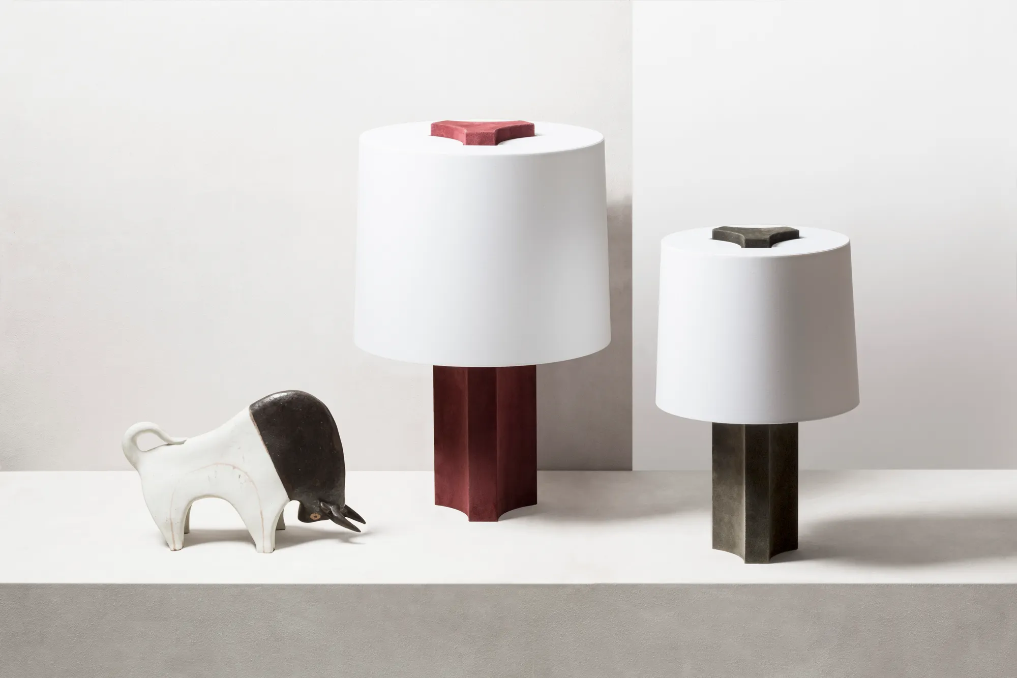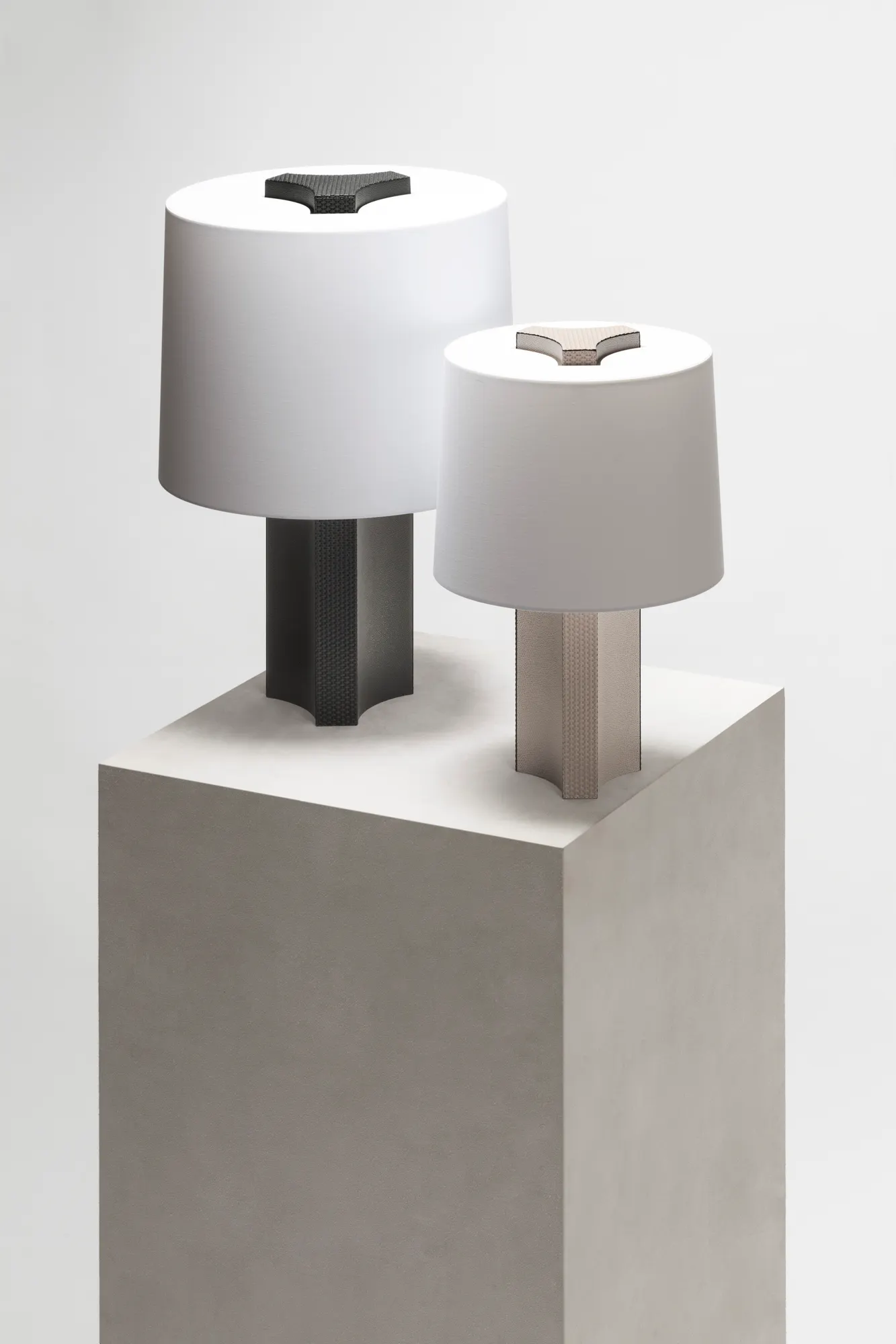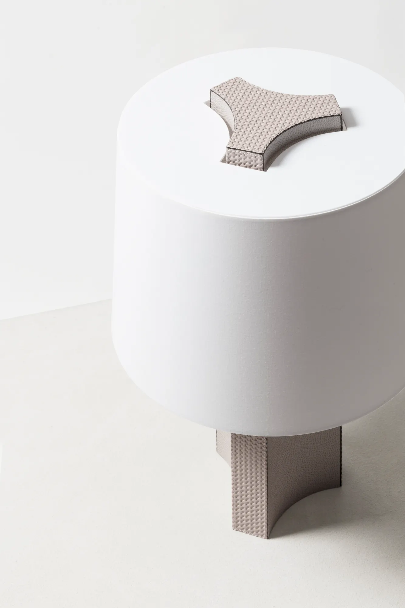 Leather-covered wood base with a fine linen lampshade. Being inspired to architectural elements typical of classical antiquity, such as the ancient Greek columns, this lamp boasts fine curves and edges that showcase eyecatching interplays of shadows when lit.