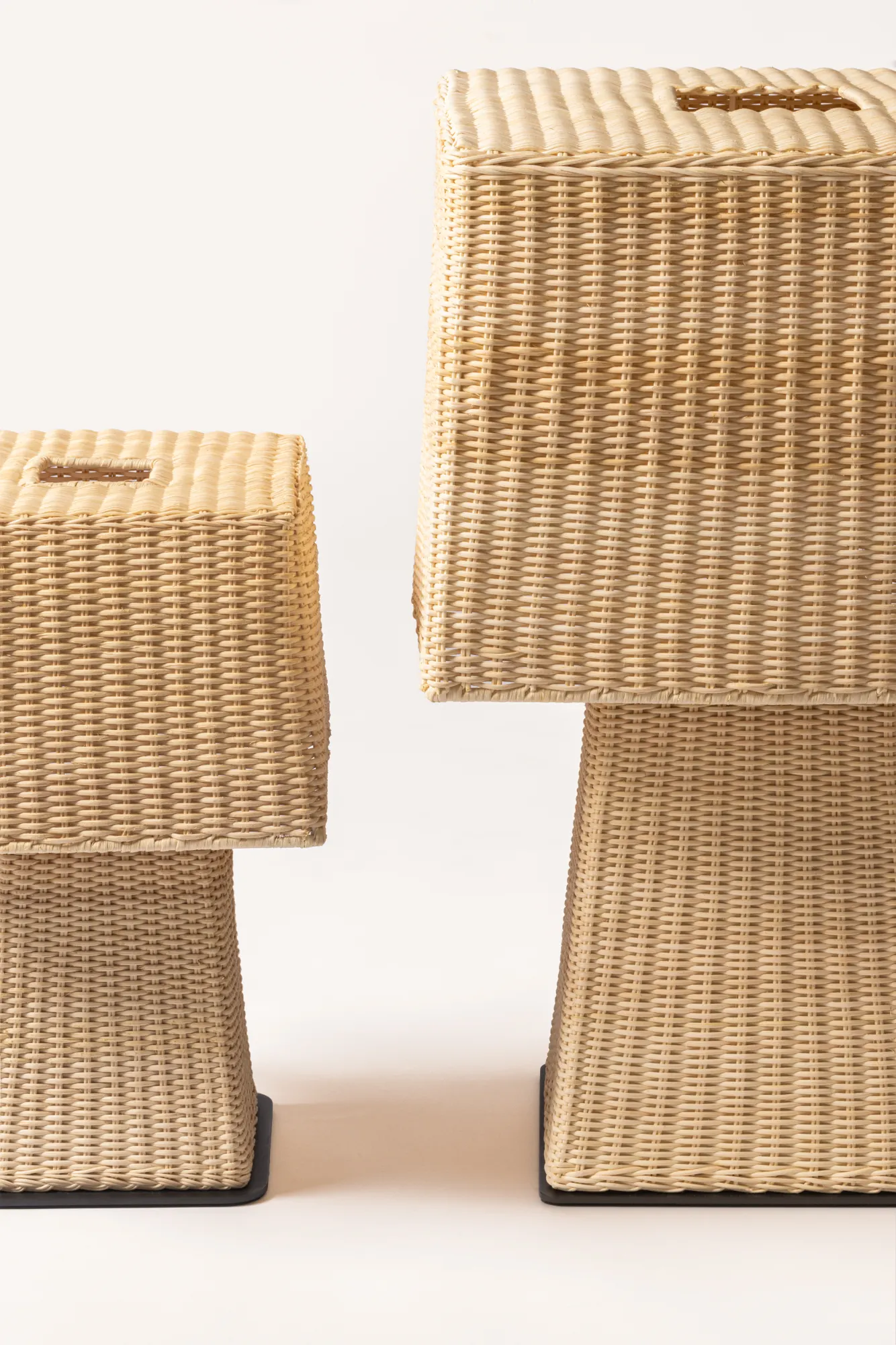 Eolie is a collection where the meticulous perfection of handmade weaving meets the flawless, elegant simplicity of pure forms and proportions. The woven rattan, with its warm natural nuances, boasts captivating light and dark effects and conveys a feeling of weightlessness, while the combination with an ideally heavy metal base brings forth a subtle interplay of contrasting yet complimentary textures.