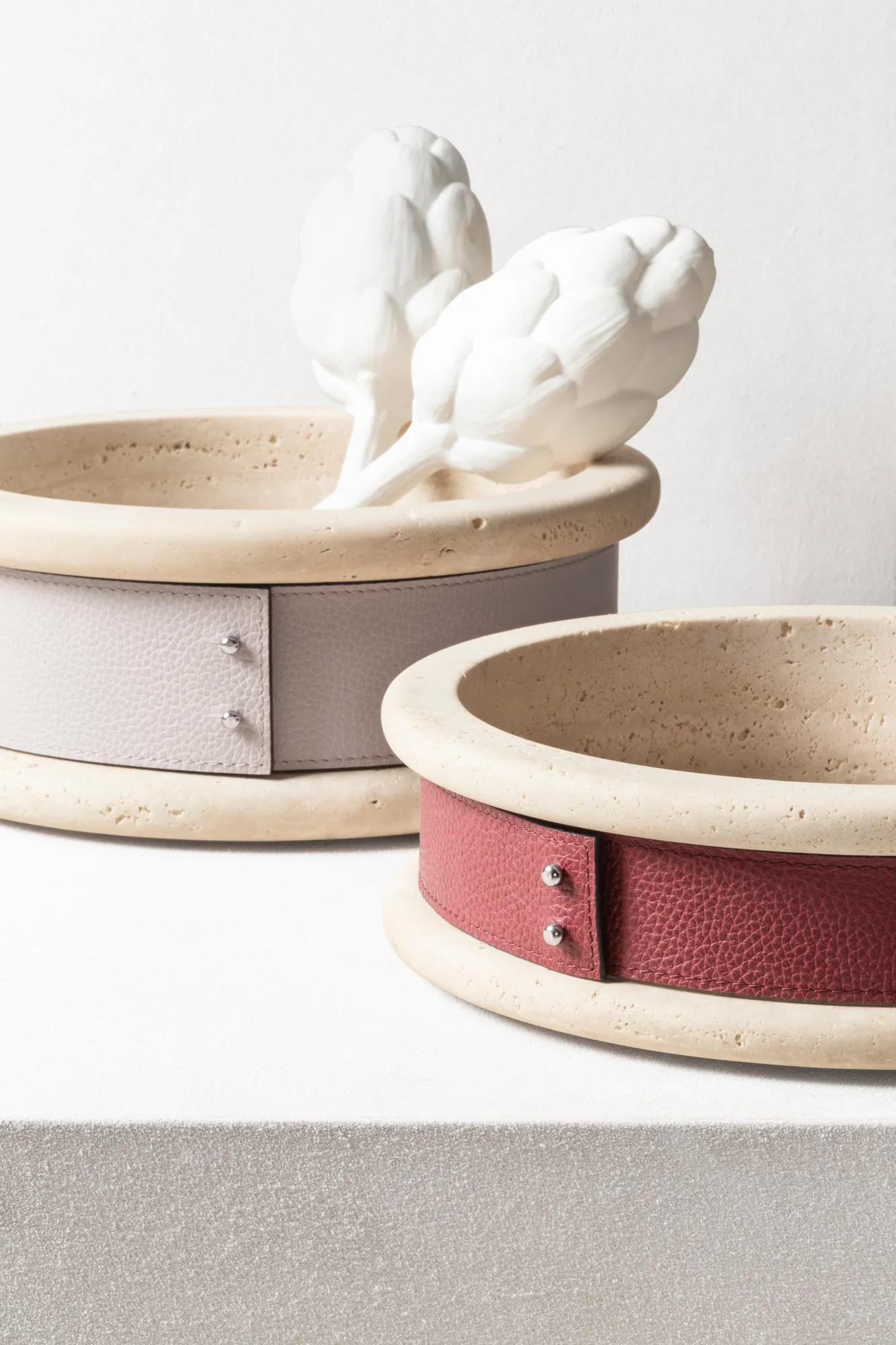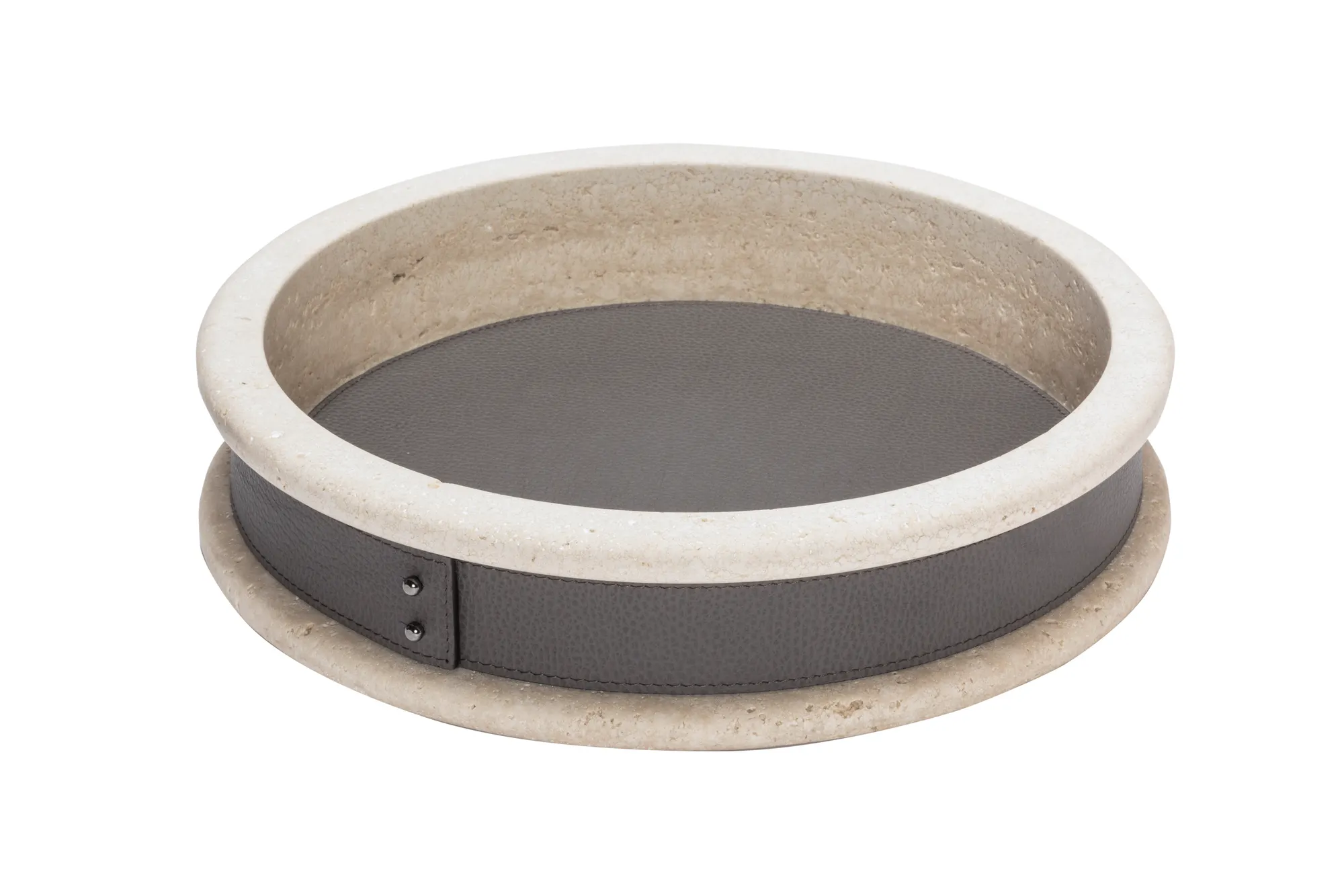 Marble structure with removable leather inner placemat and outer insert provided with chrome-plated buttons.