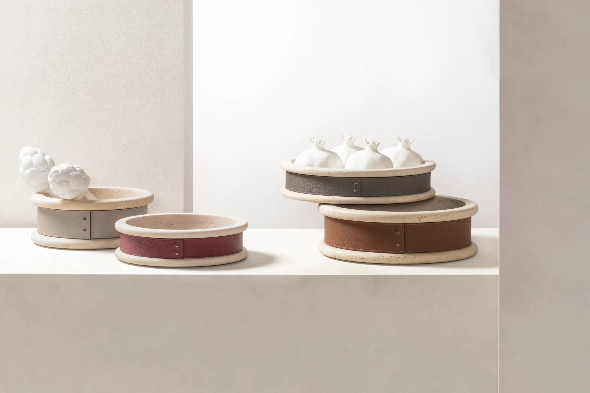 Marble structure with removable leather inner placemat and outer insert provided with chrome-plated buttons.
