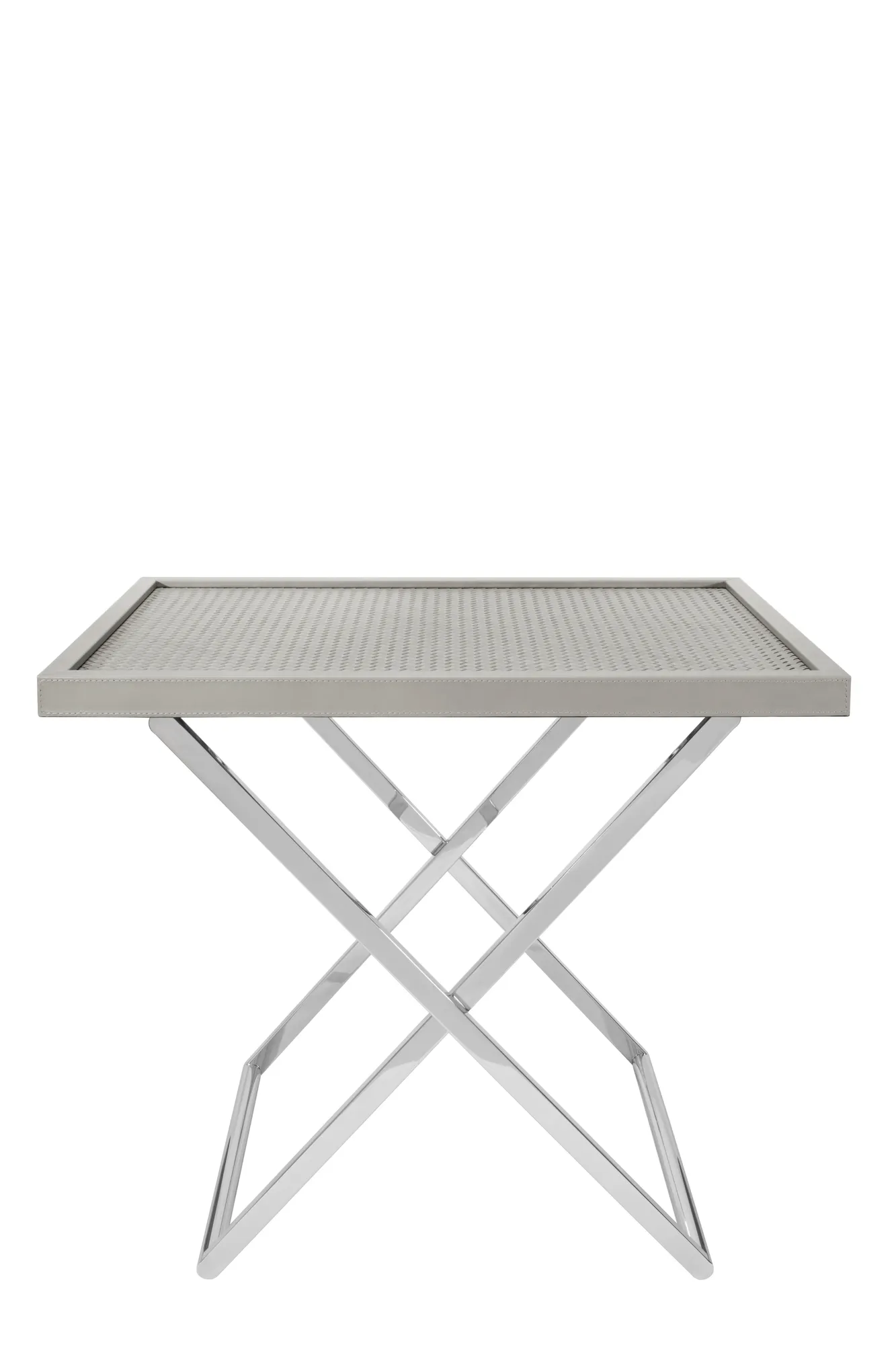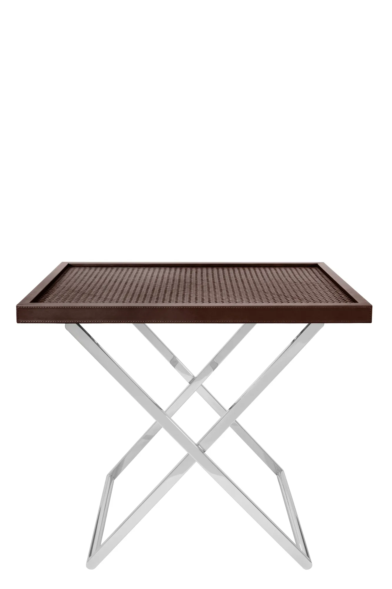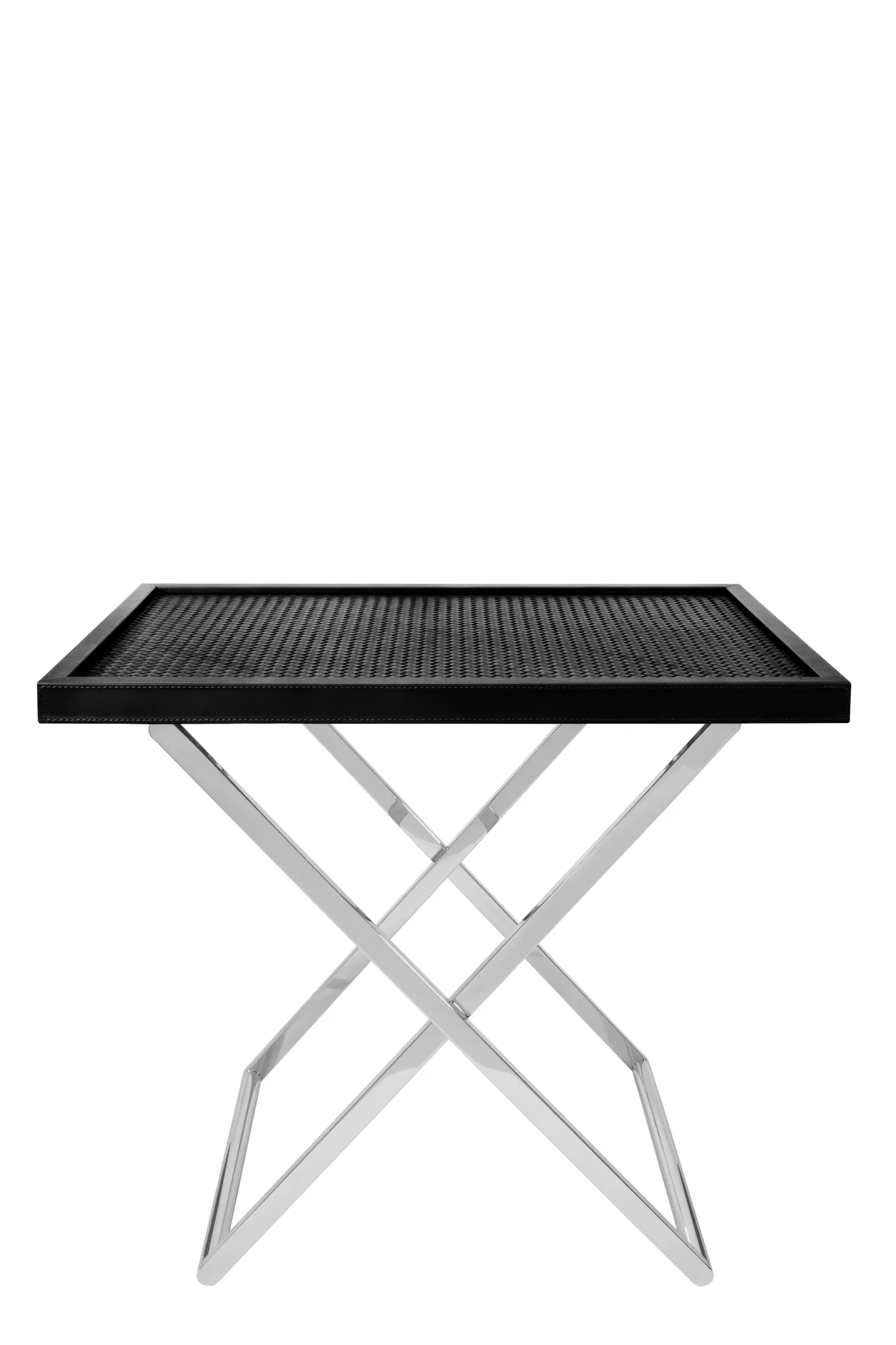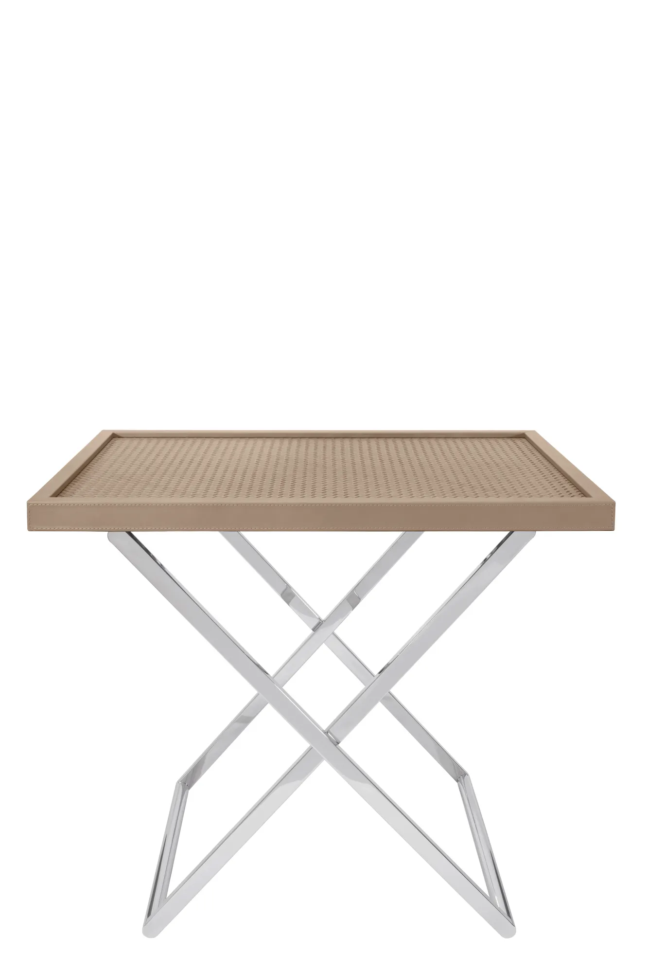 Side table with handwoven leather top. Chrome or gold metal legs with adjustable height.