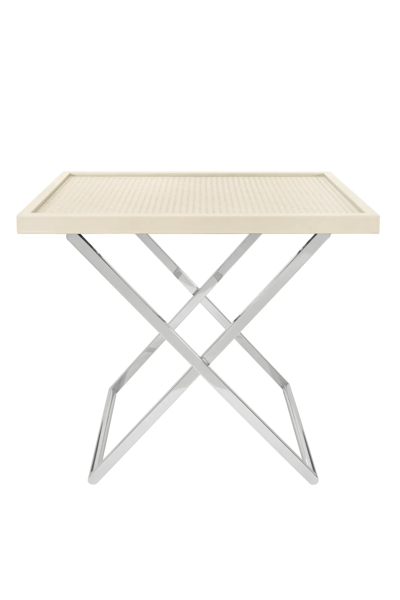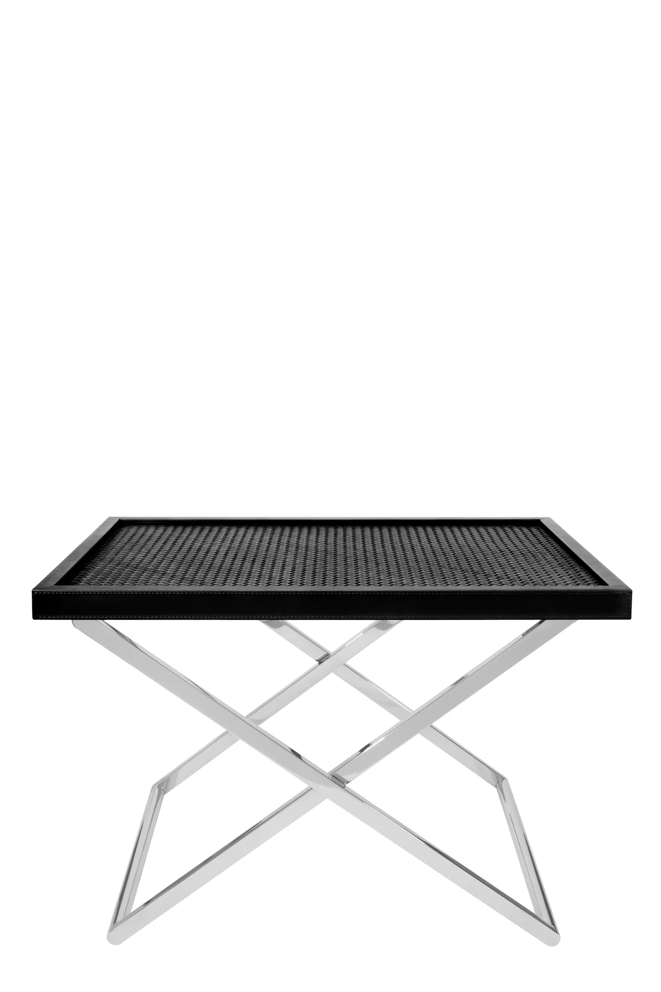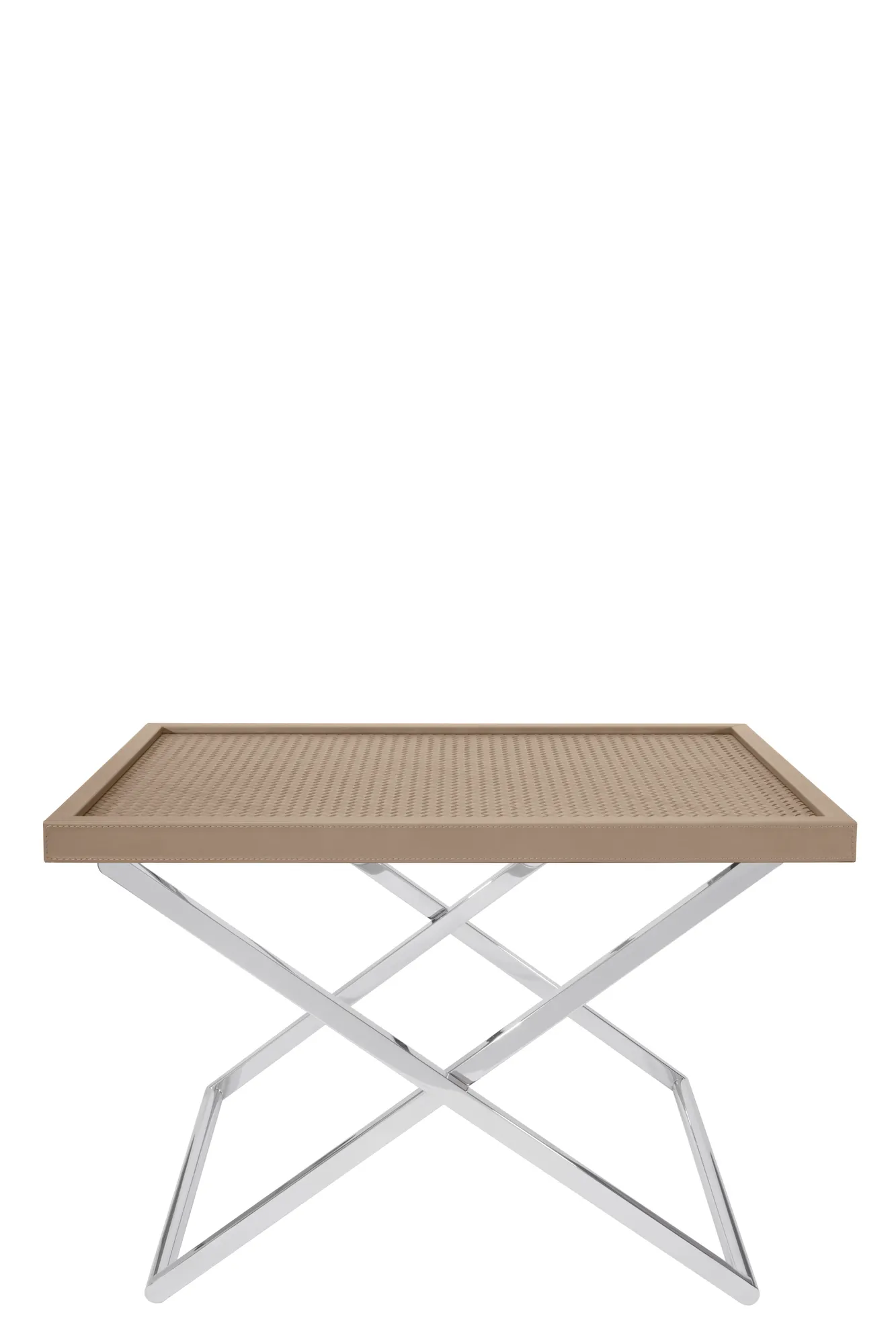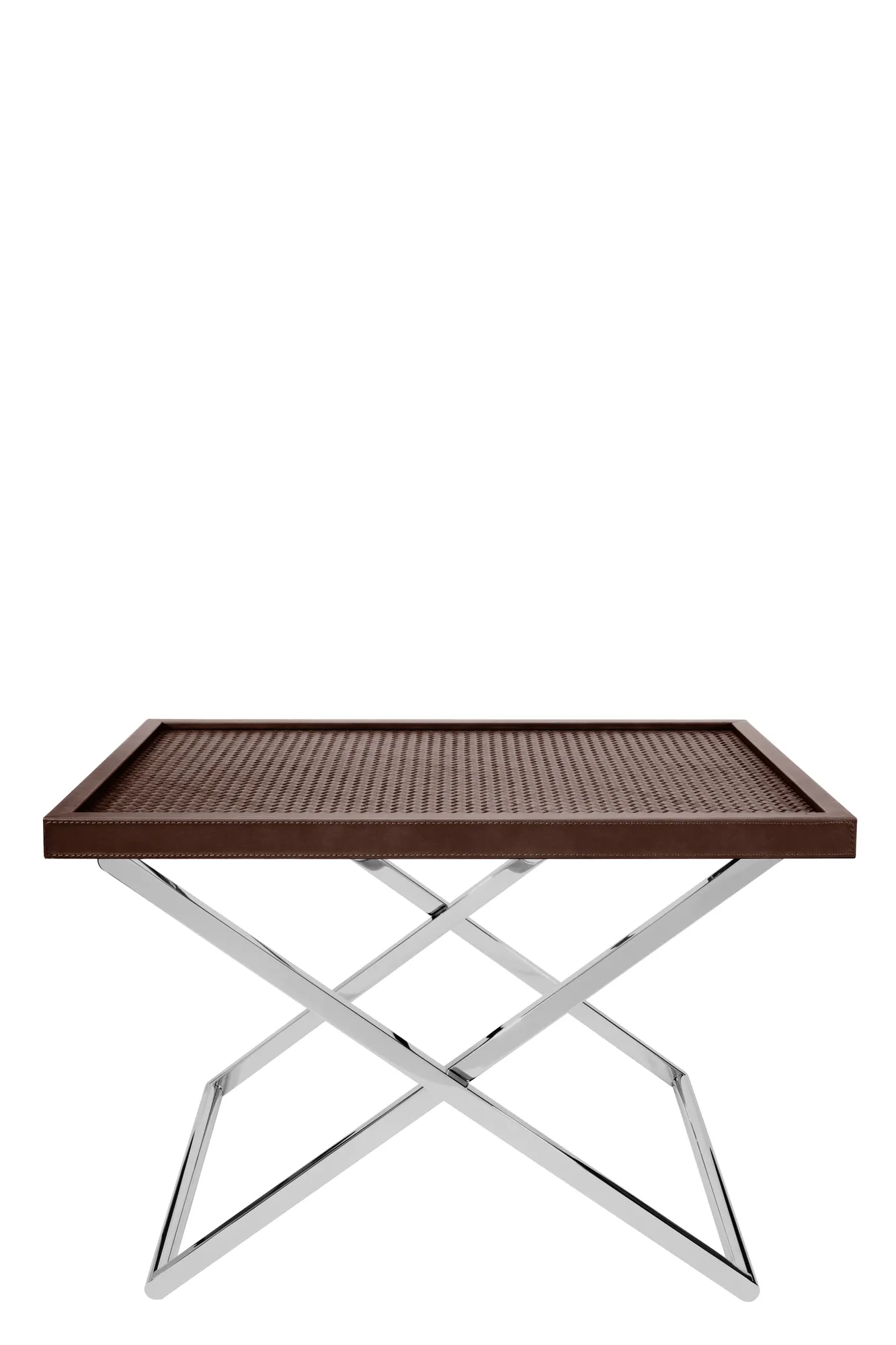 Side table with handwoven leather top. Chrome or gold metal legs with adjustable height.