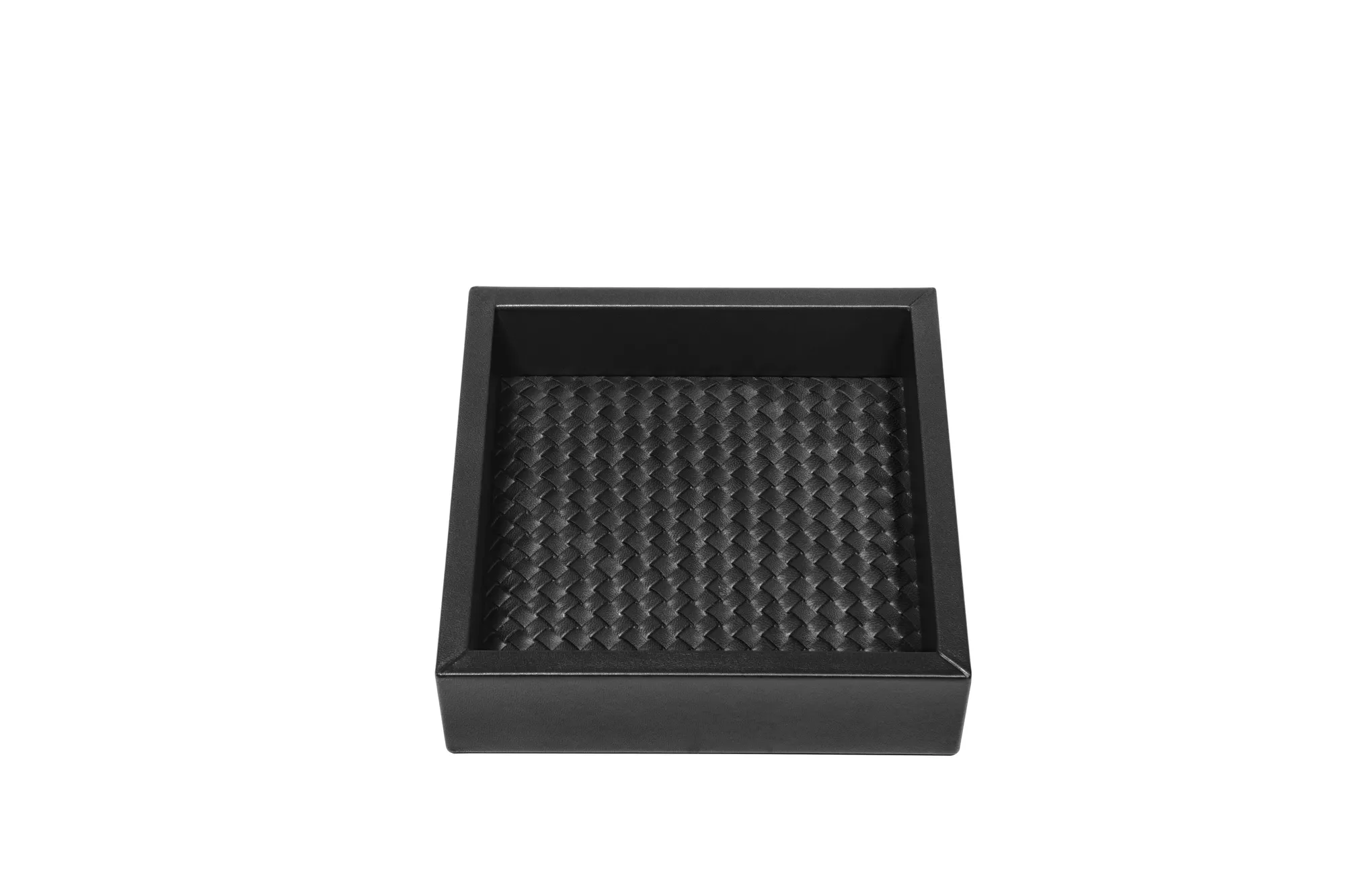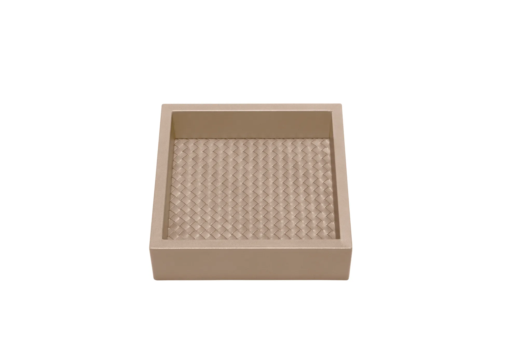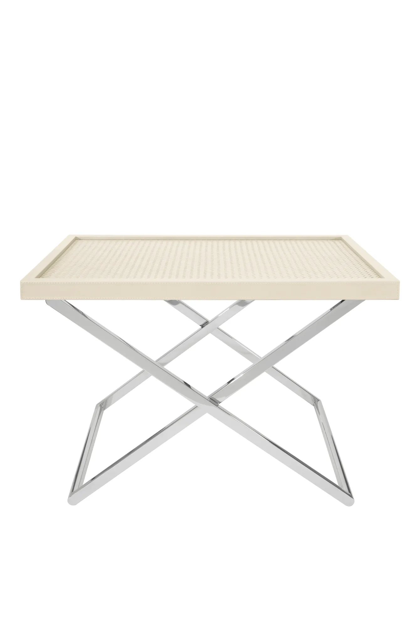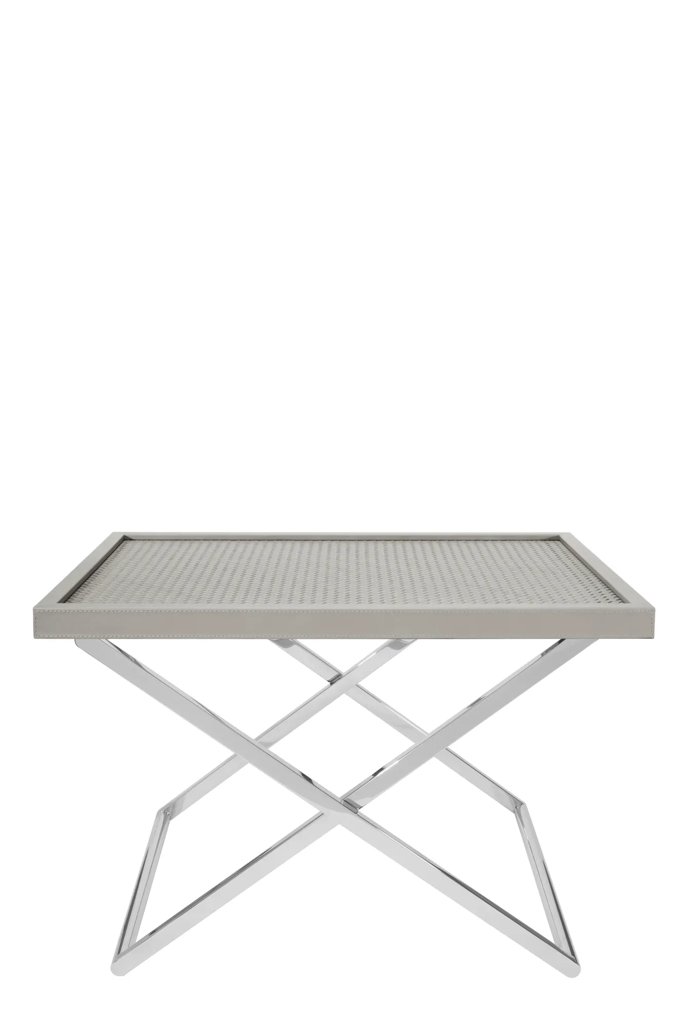 Side table with handwoven leather top. Chrome or gold metal legs with adjustable height.