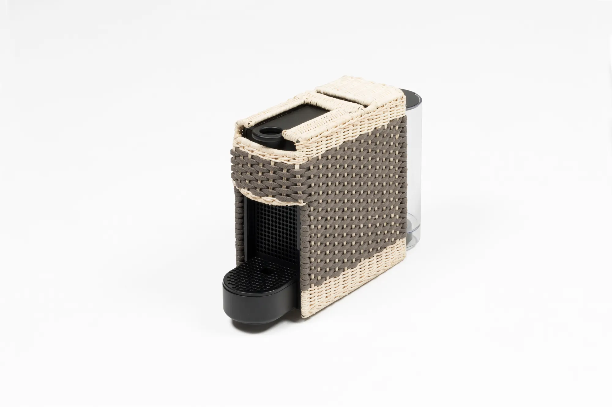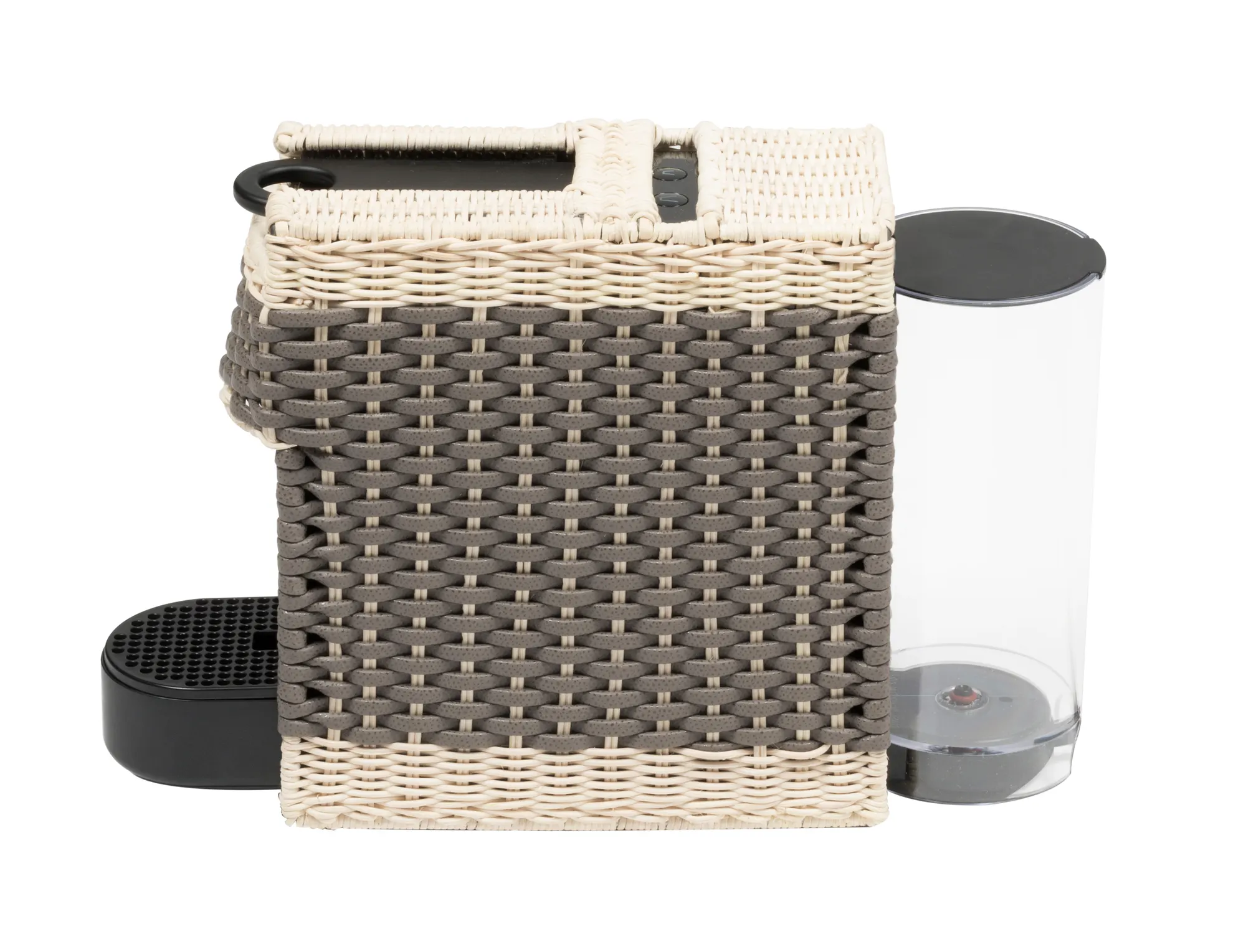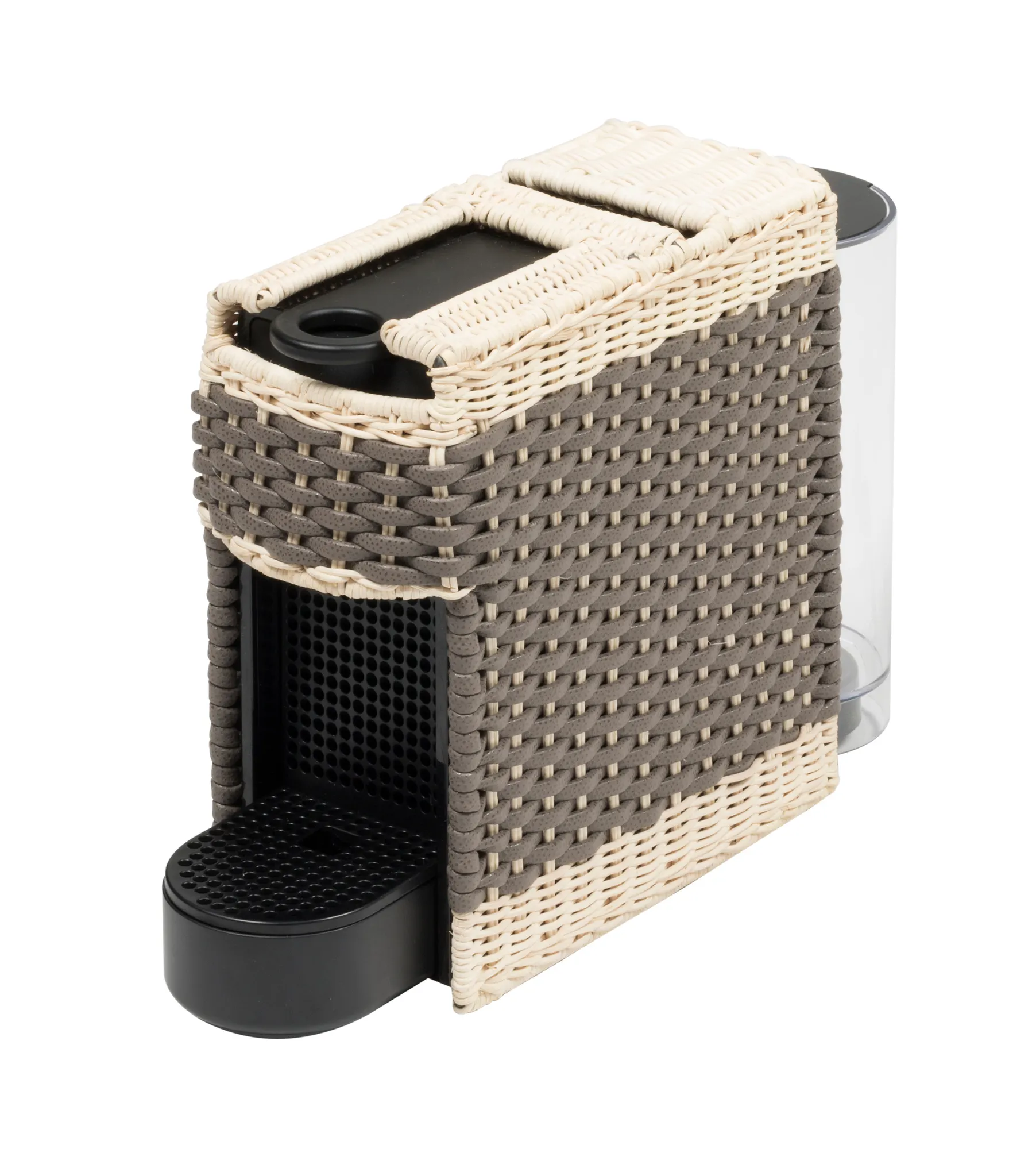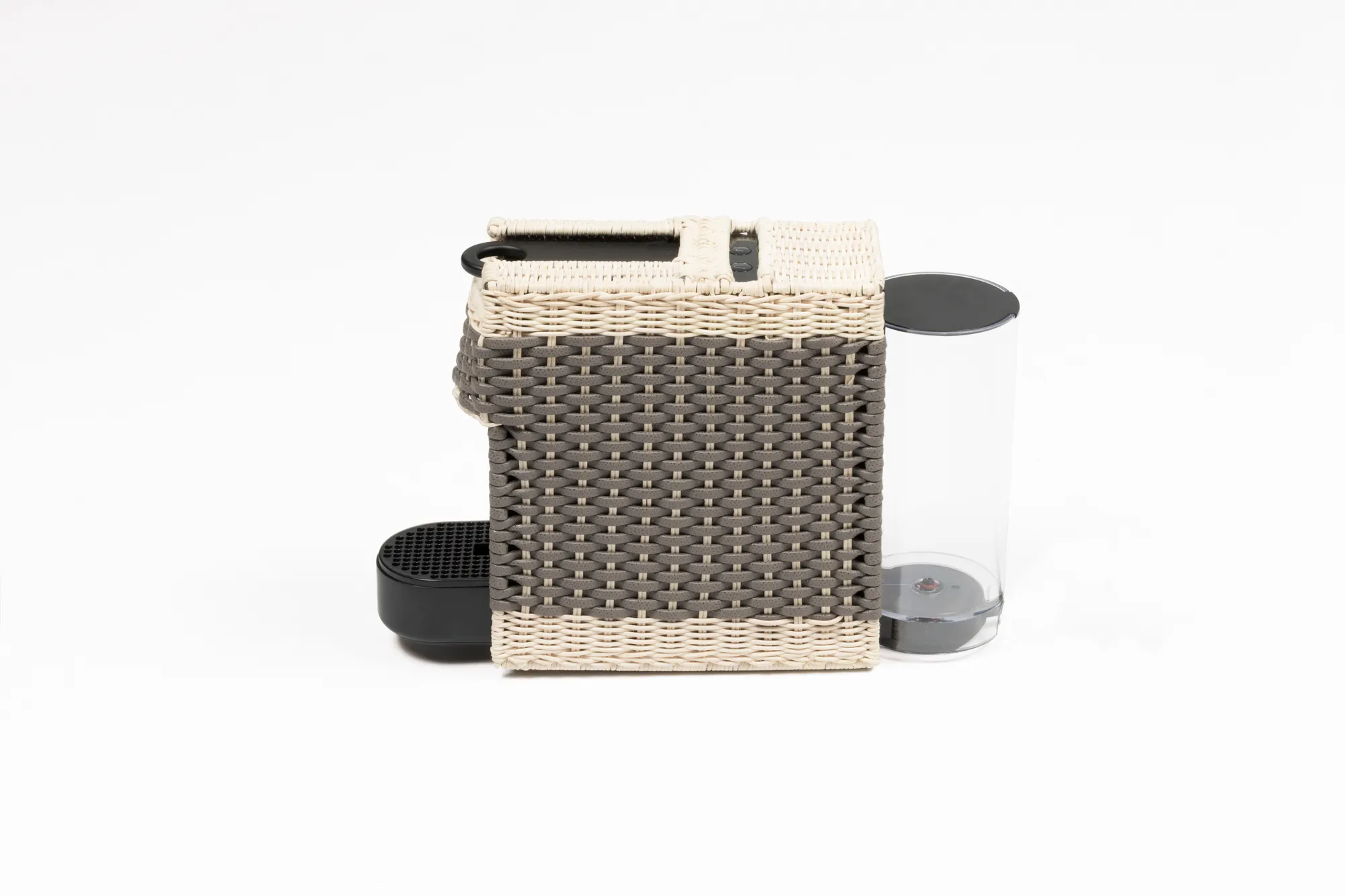Original Nespresso machine with a removable cover made in woven leather and rattan. It uses Nespresso classic capsules. Voltage available: 110V or 220V.