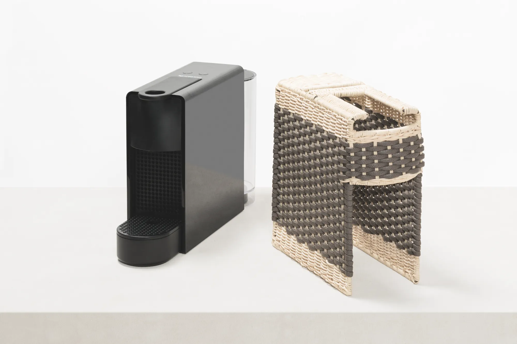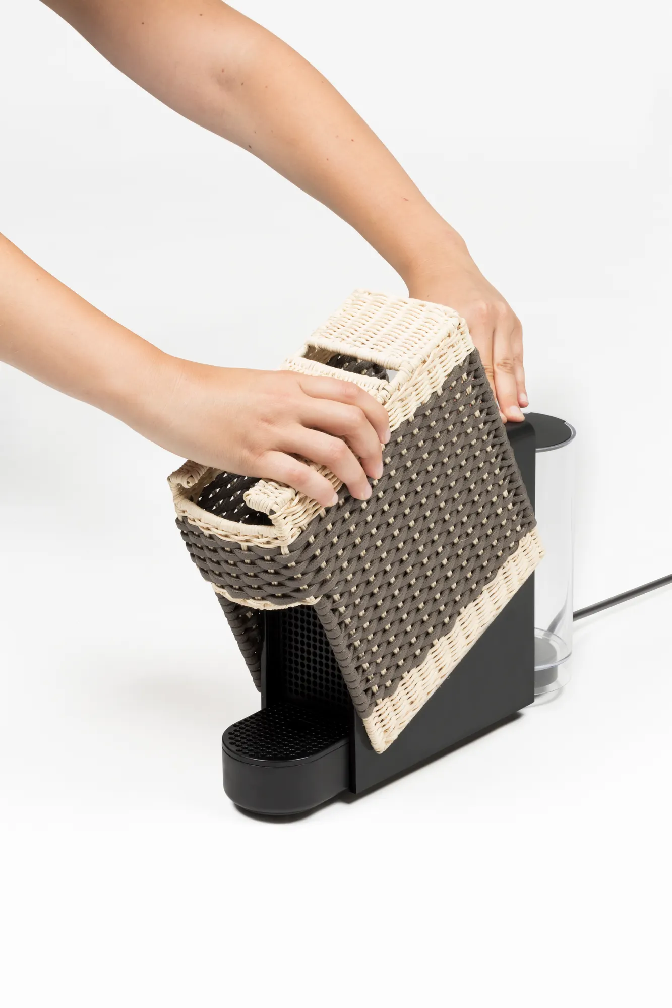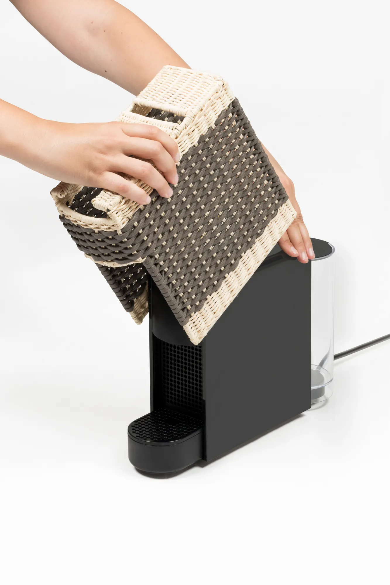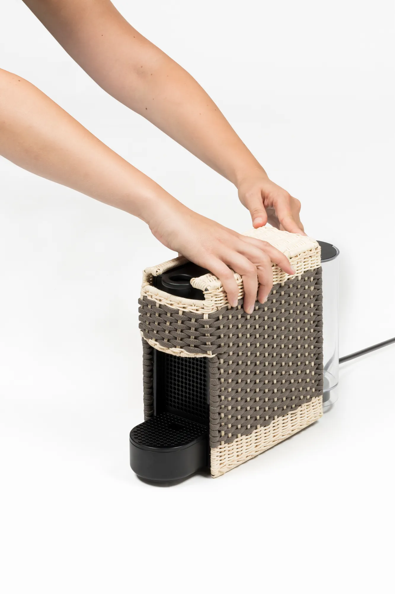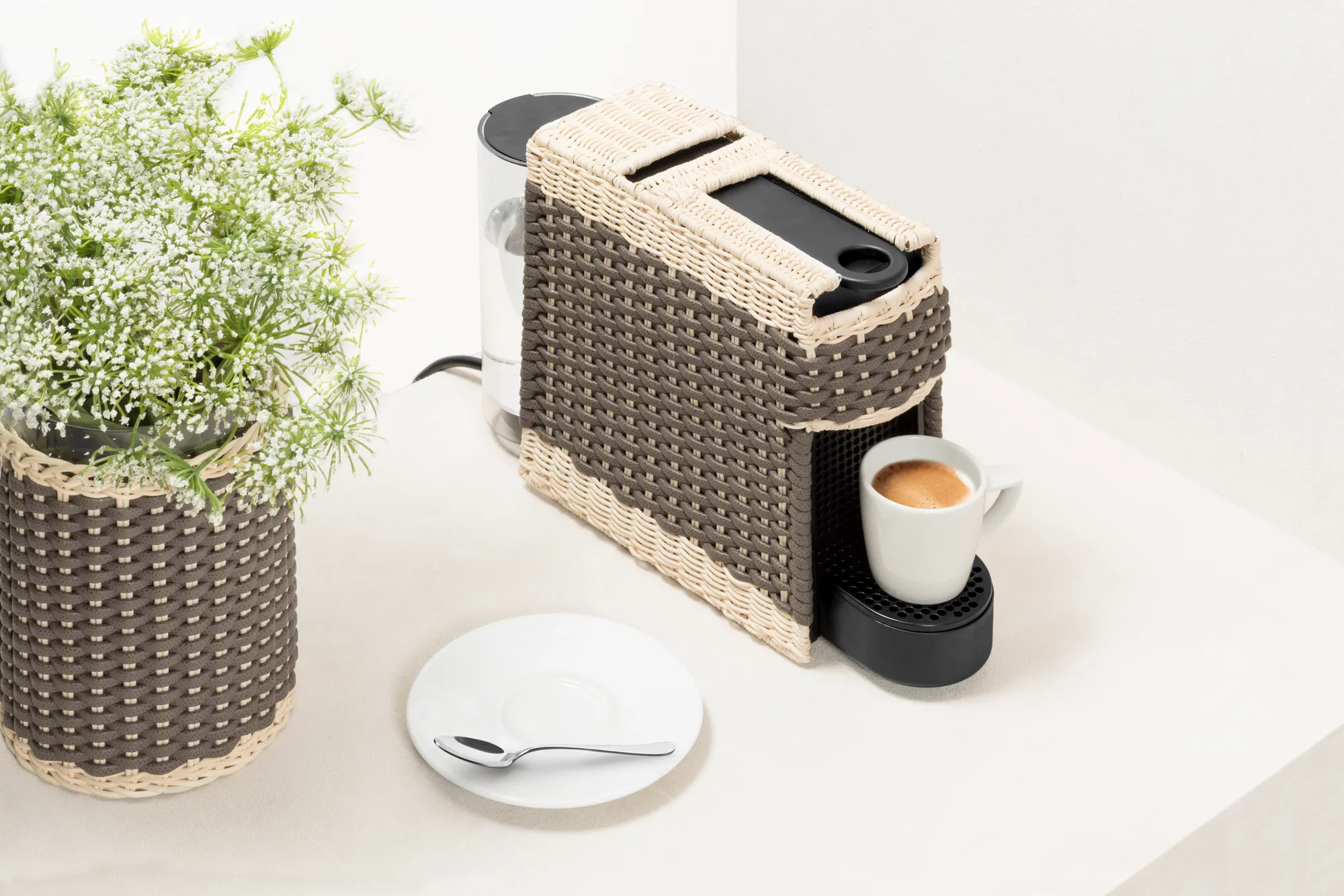 Original Nespresso machine with a removable cover made in woven leather and rattan. It uses Nespresso classic capsules. Voltage available: 110V or 220V.