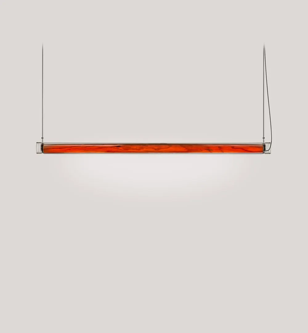 ESTELA HORIZONTAL THE CAPSULE OF LIGHT. Estela is a captivating capsule of light. In Estela, Mayice designed a clean, clear, single piece of borosilicate glass. Hand-blown by the accomplished artisan Eduardo Garuti, the glass envelopes a cylinder-like wood veneer diffuser. The wood veneer houses a dimmable LED light source, and a straight opening on one side emits downward light that is softened by the glass. Offering a seamless connection between both glass and wood, Estela is a radiant lamp with a celestial-like quality. Similar to Dune, Estela’s natural imperfections, a characteristic of hand-blown glass, add to its warmth and elegance
