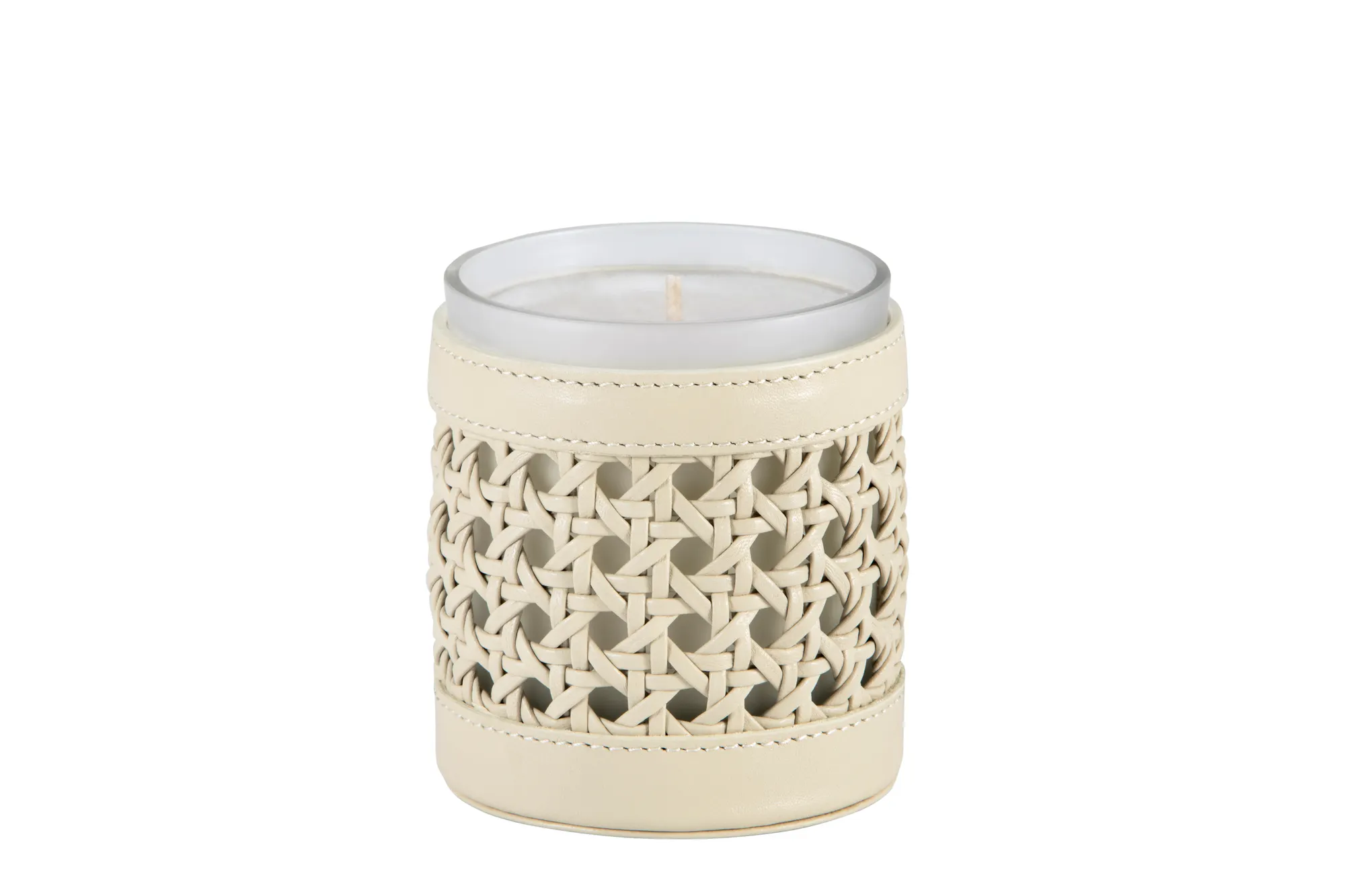 Candle holder, hand-braided leather, with removable scented candle.