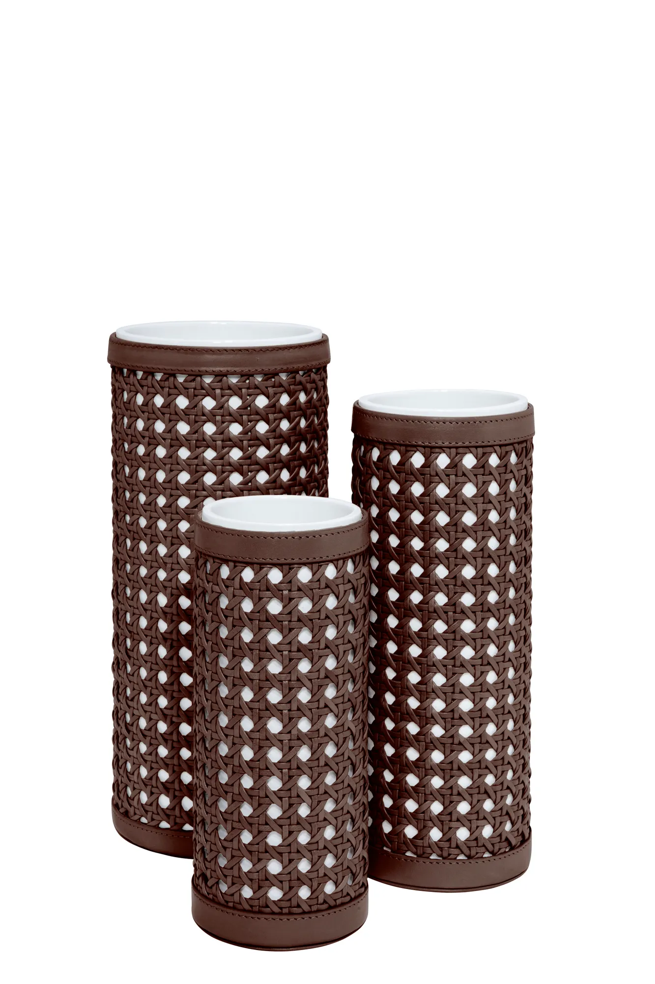 Ceramic vase, removable quilted diamonds padded leather cover.