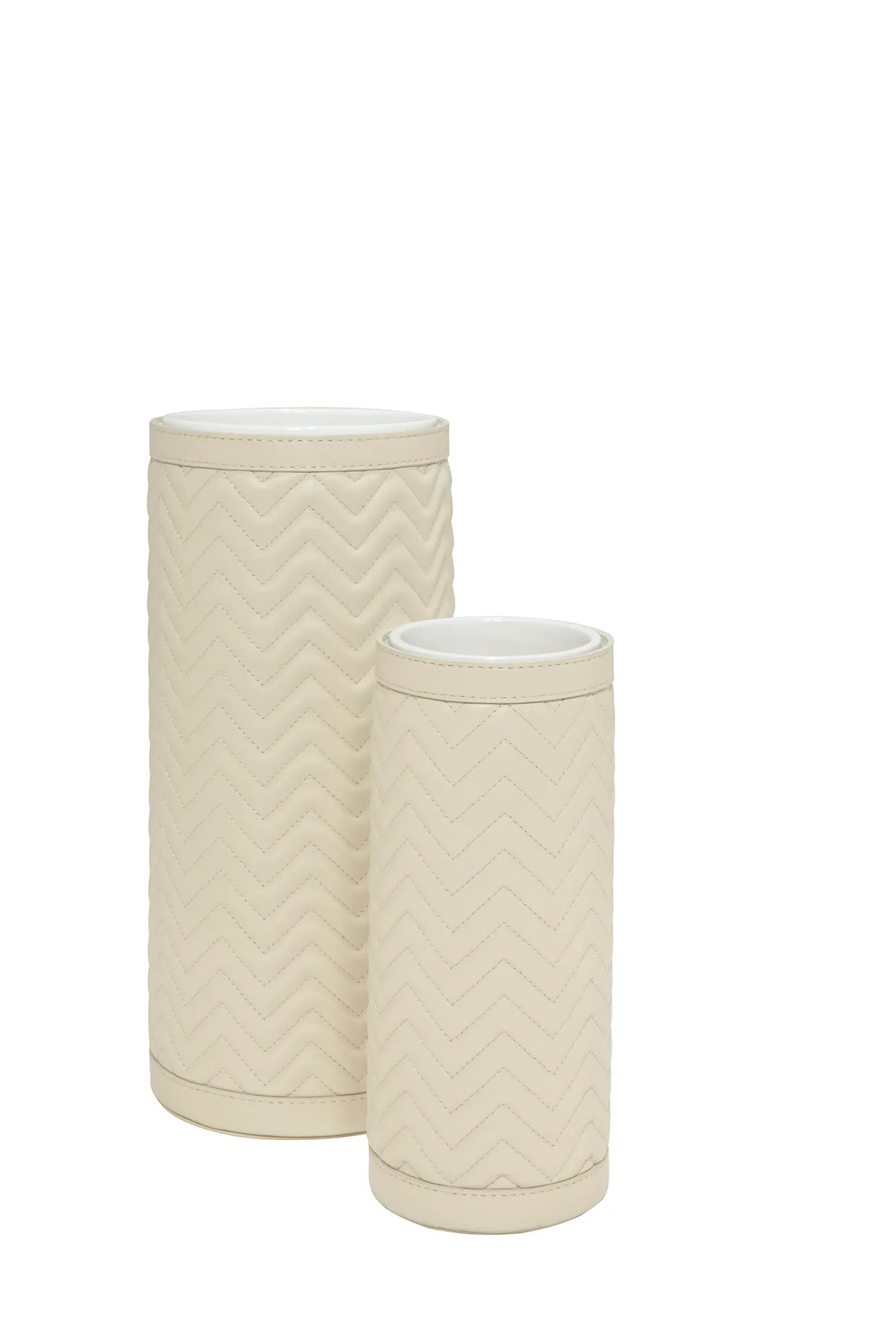 Ceramic vase, removable quilted herringbone padded leather cover.