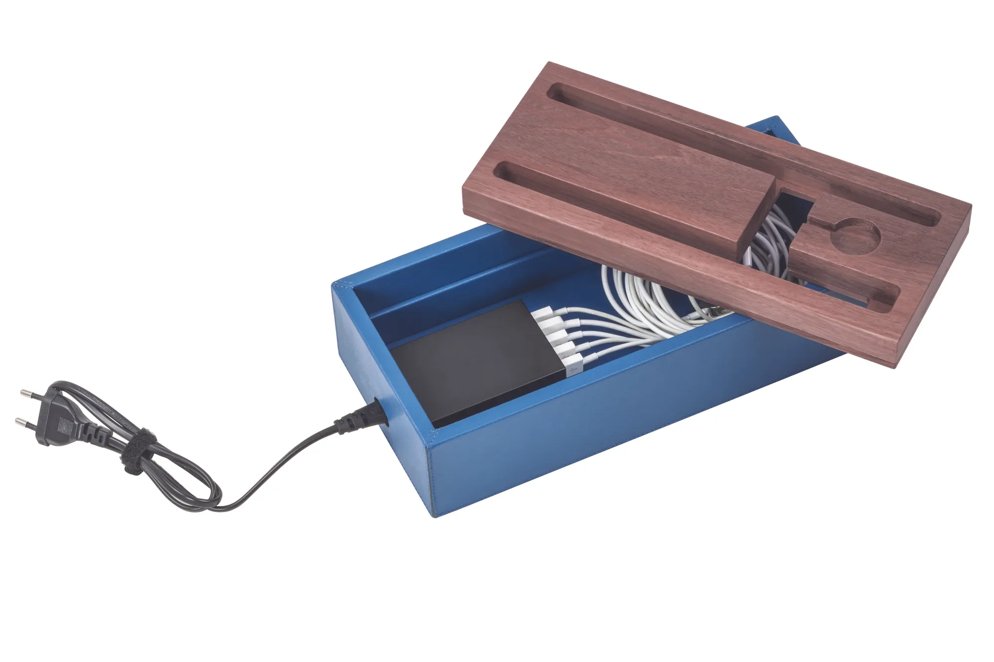 Multi device charging station. This multi device charging station hosts a high quality 5-Port USB charger able to recharge 5 devices simultaneously and provides a comfortable view. Solid walnut cover on a leather covered wooden structure.