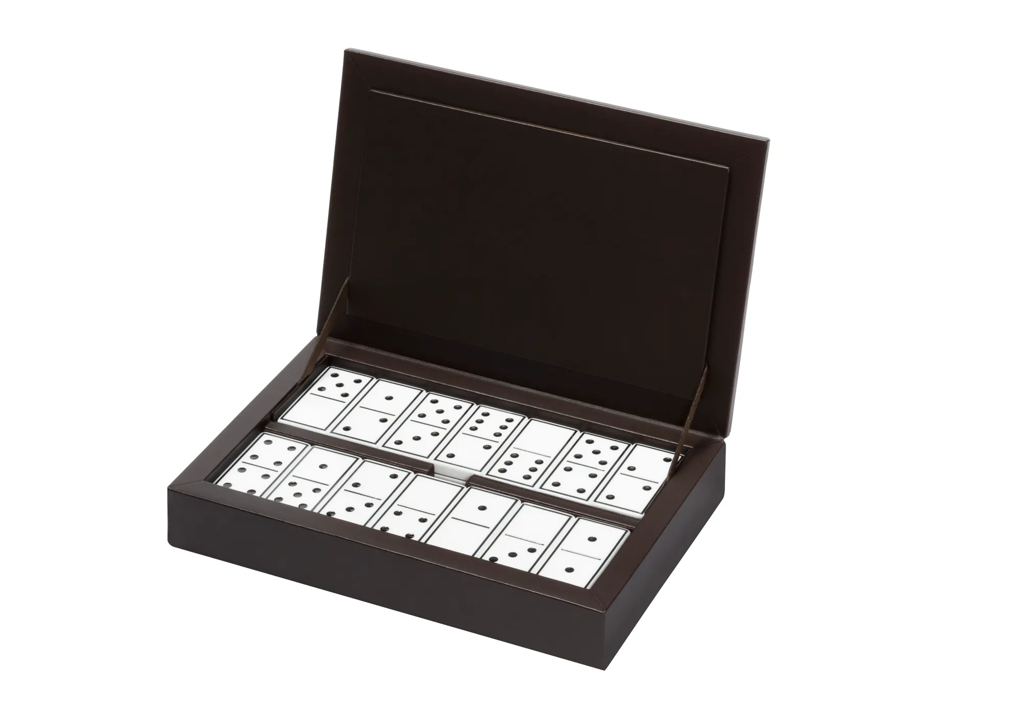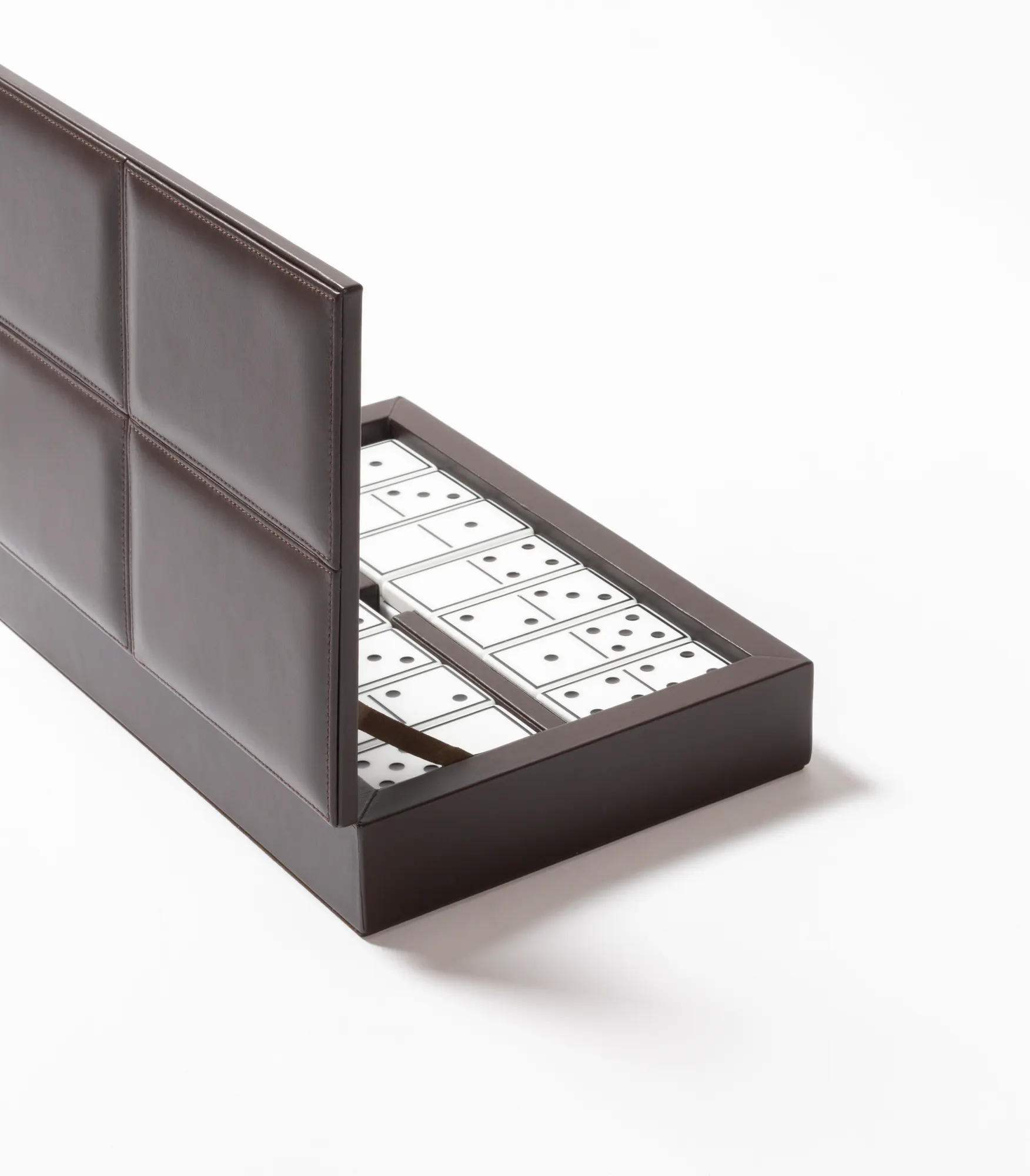Leather box with stitched padded leather lid. Set equipped with highly resistant glossy plexiglass domino pieces: choose between black or white finish.