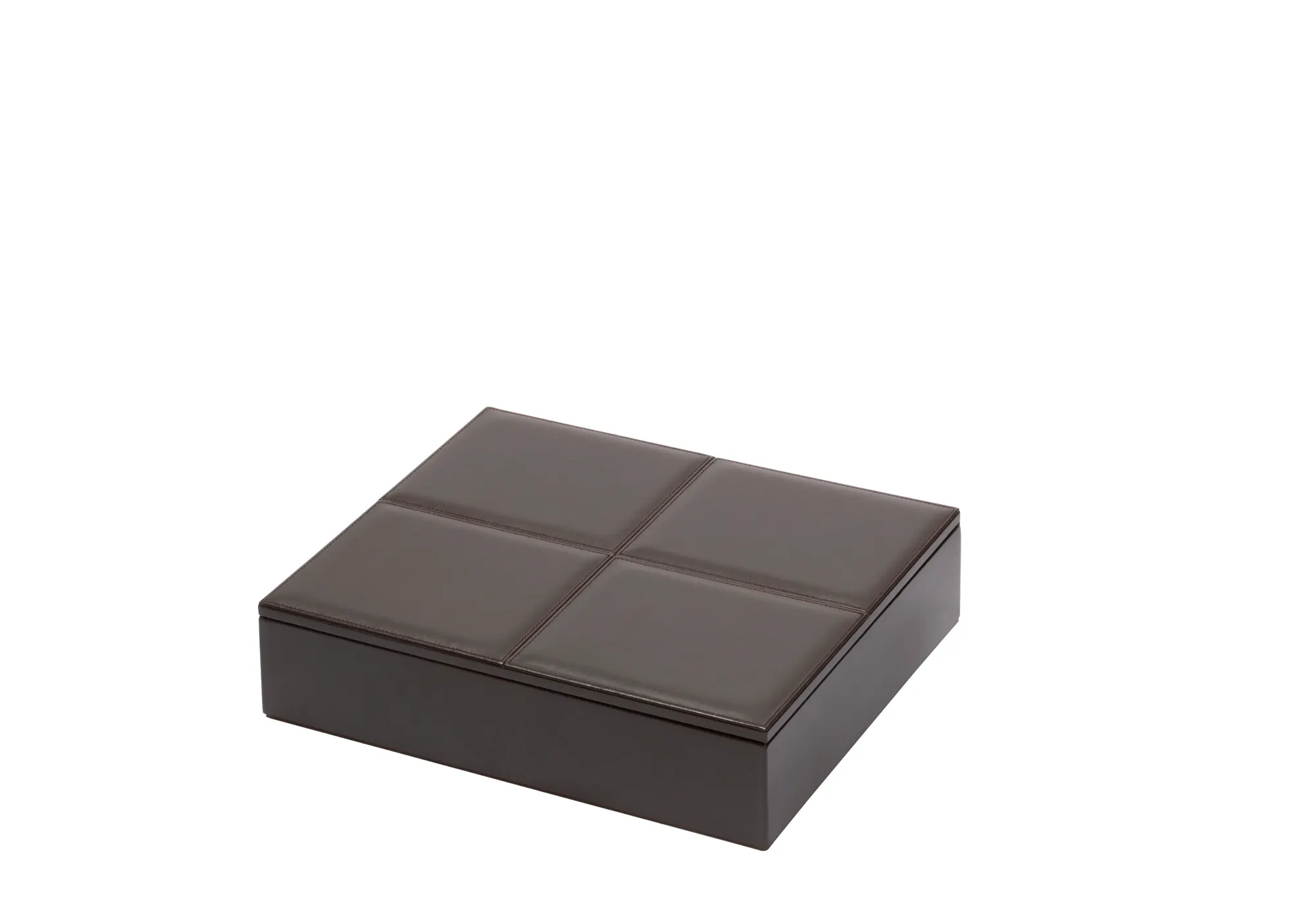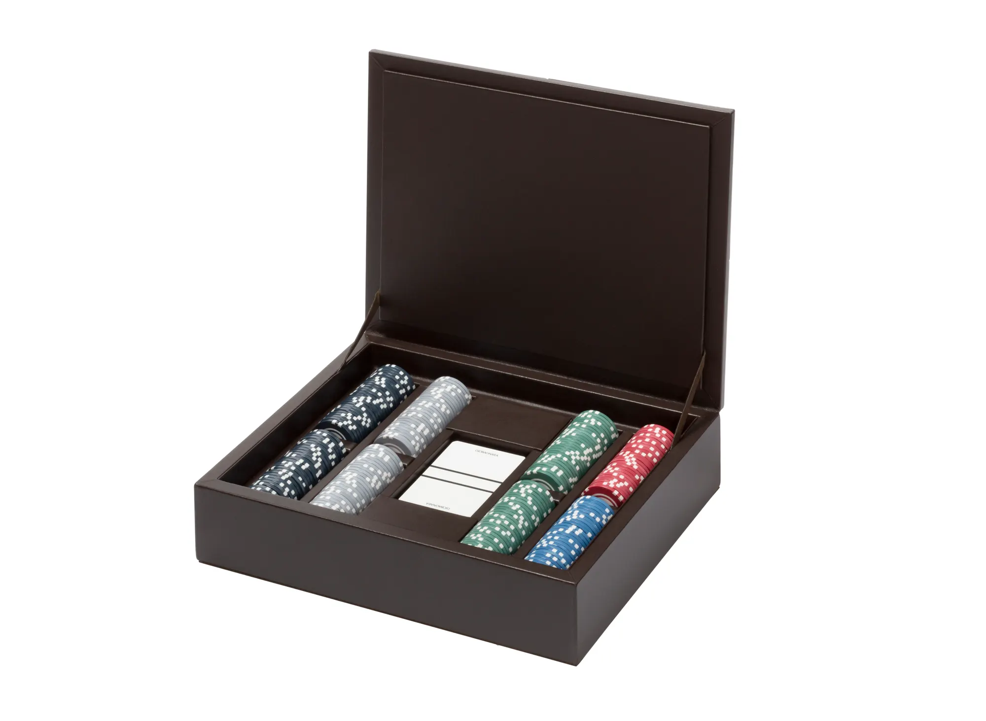 Leather box with stitched padded leather lid. Includes a deck of high quality playing cards and ceramic poker chips with 5 denominations.