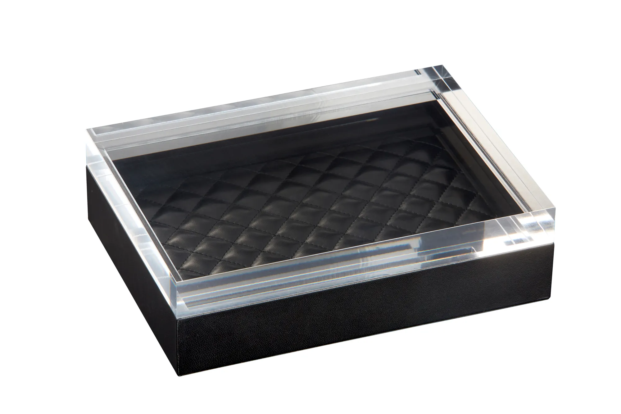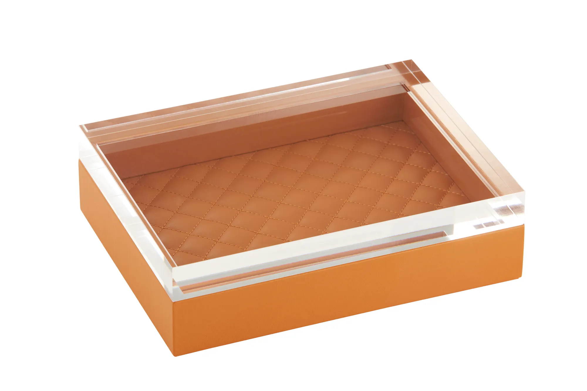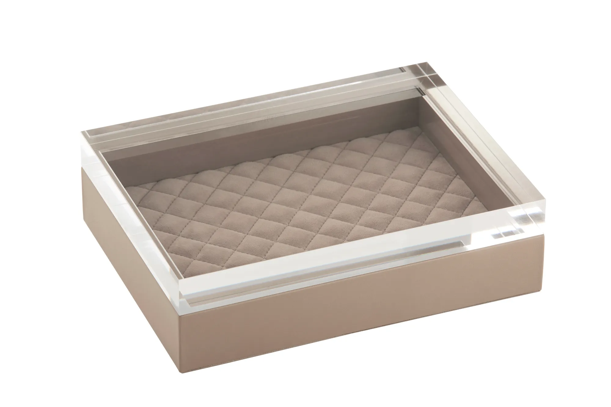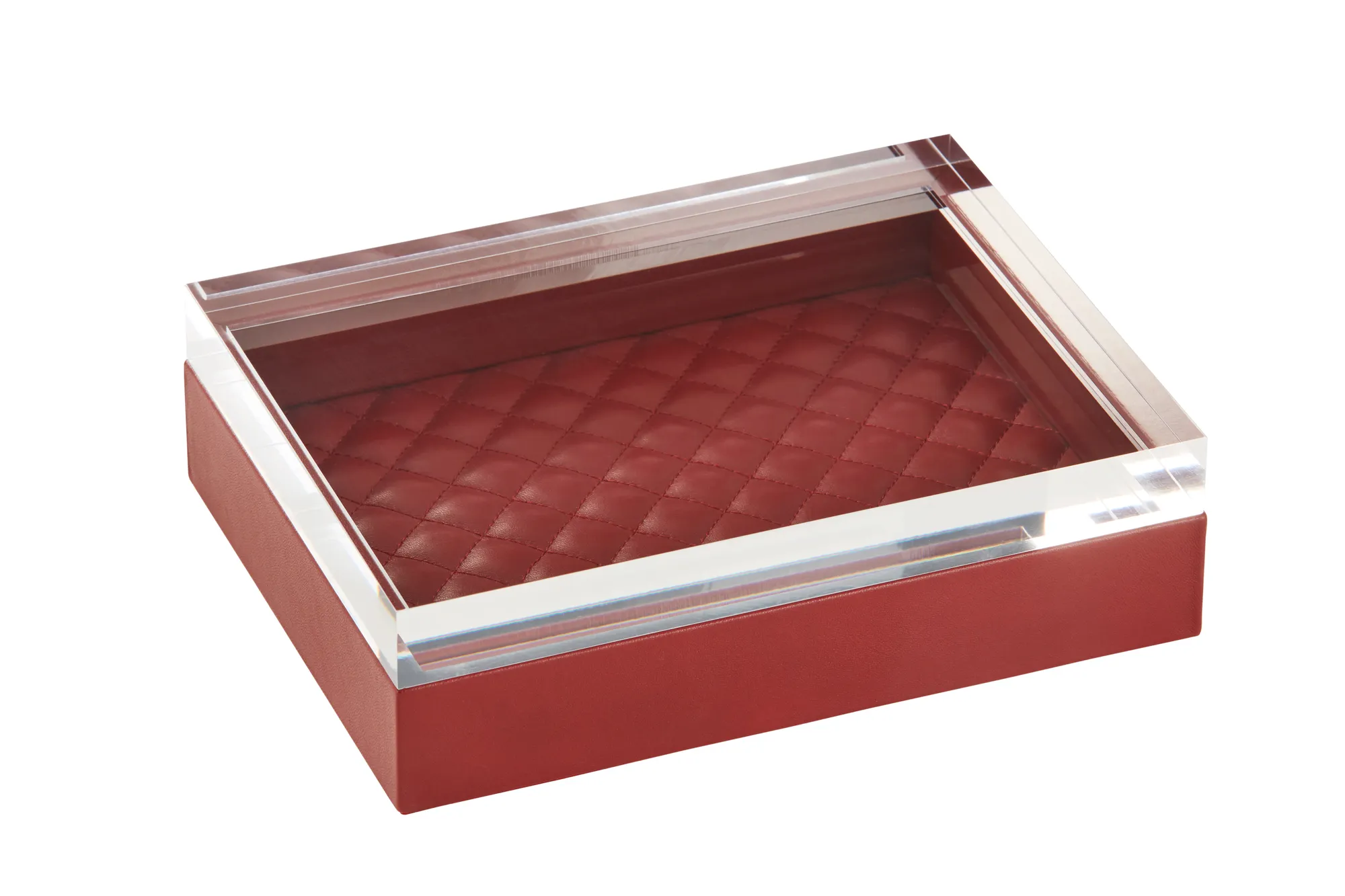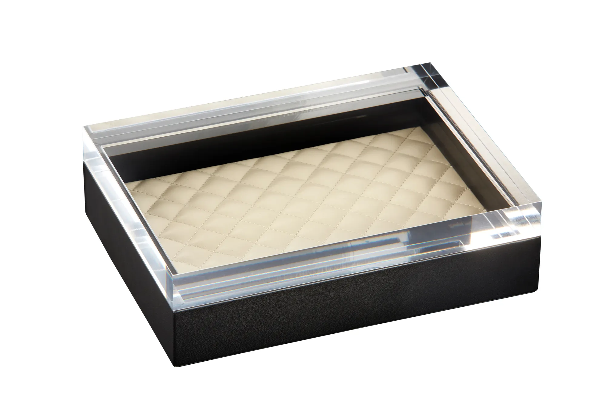 Leather box with acrylic lid, quilted diamonds padded lining.