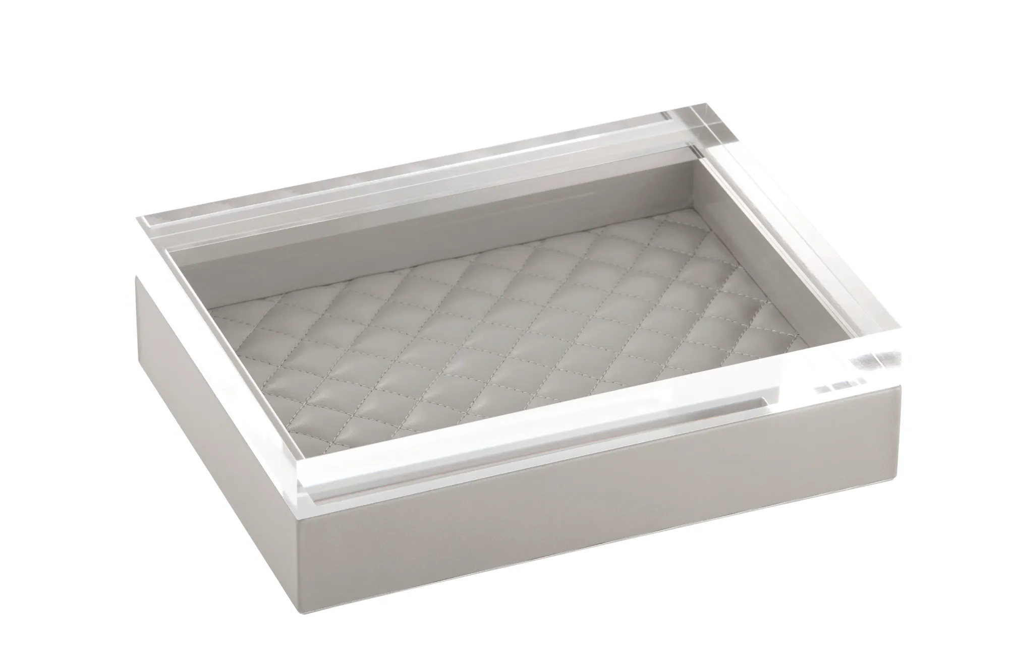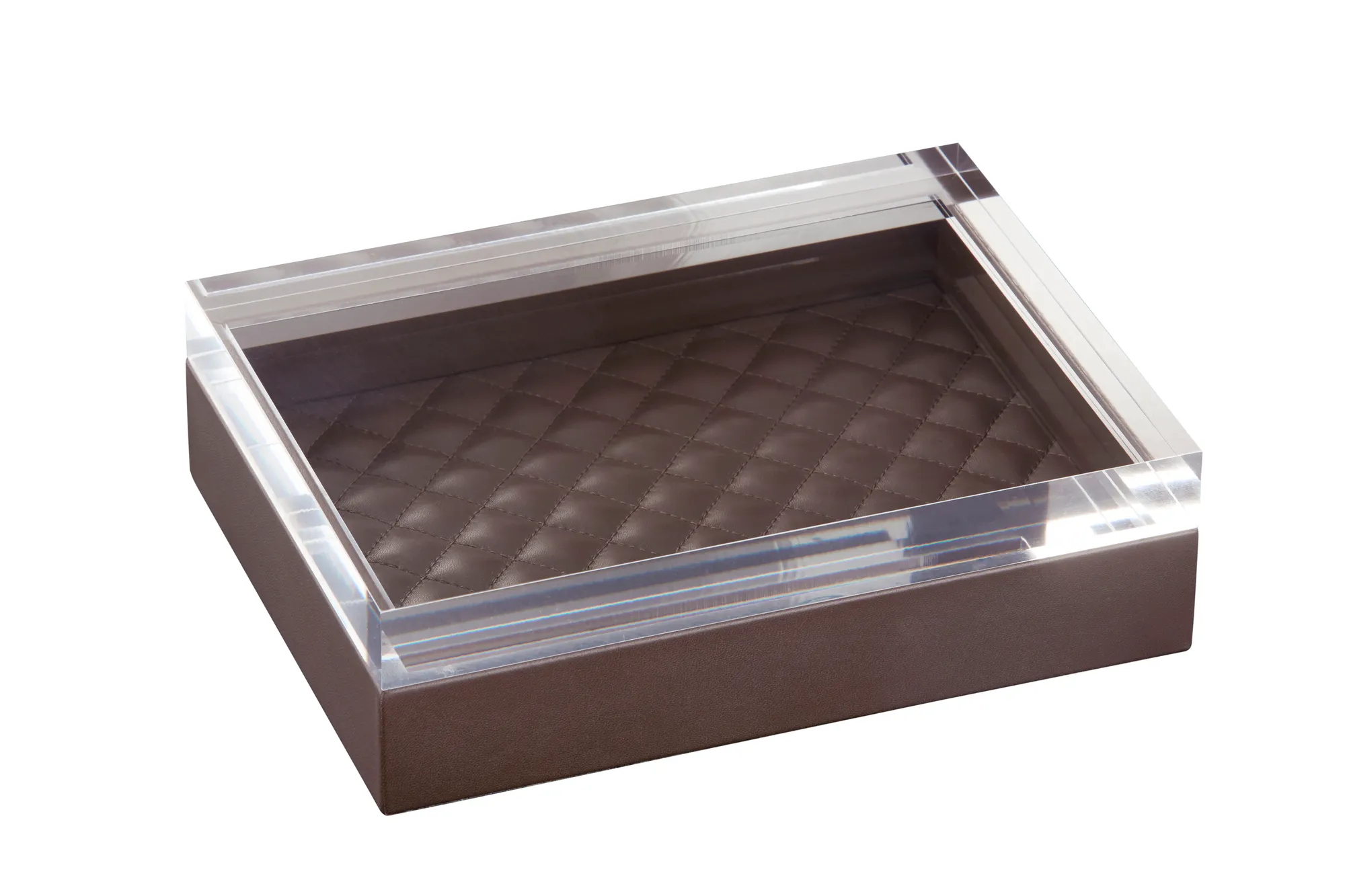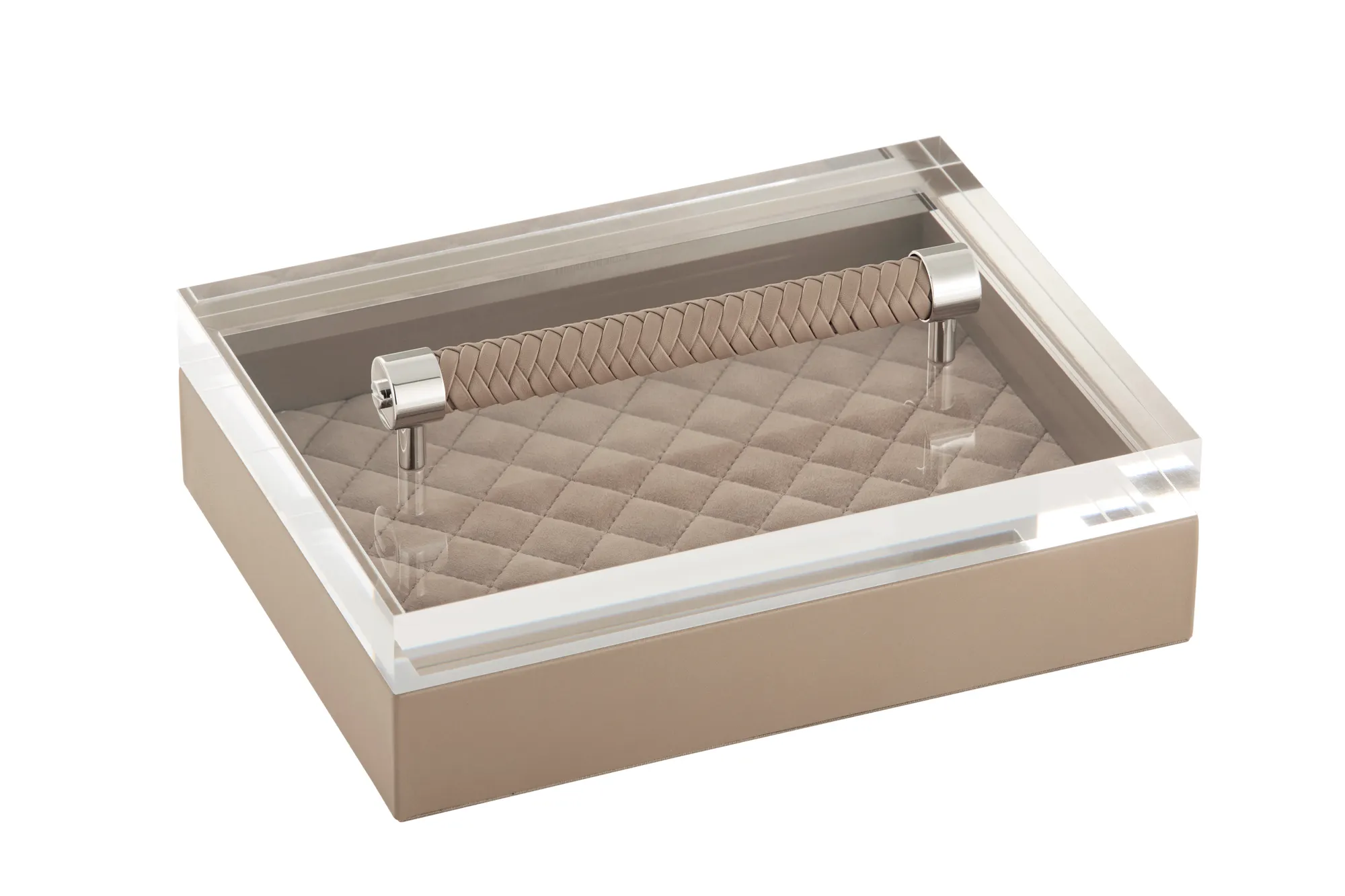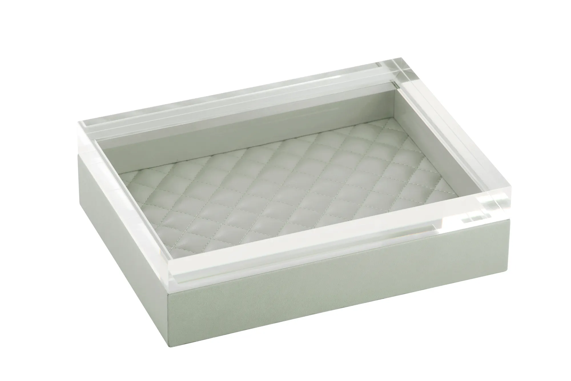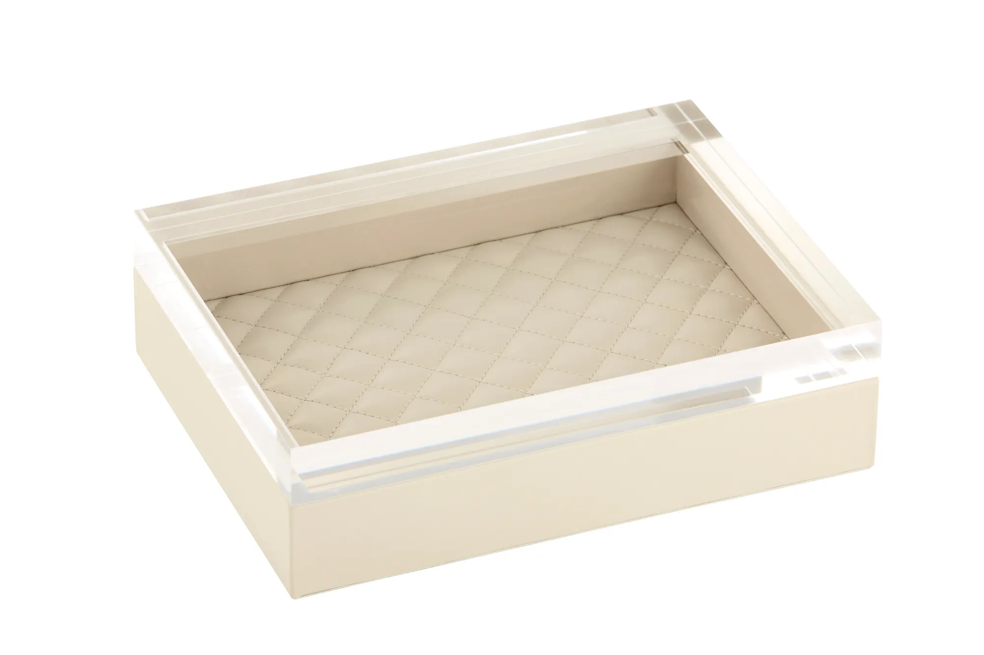 Leather box with acrylic lid, quilted diamonds padded lining.