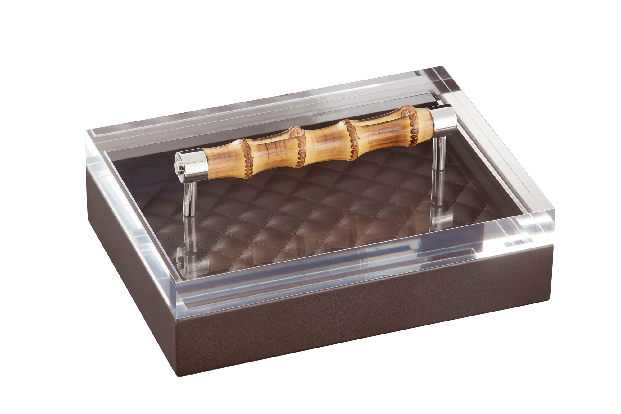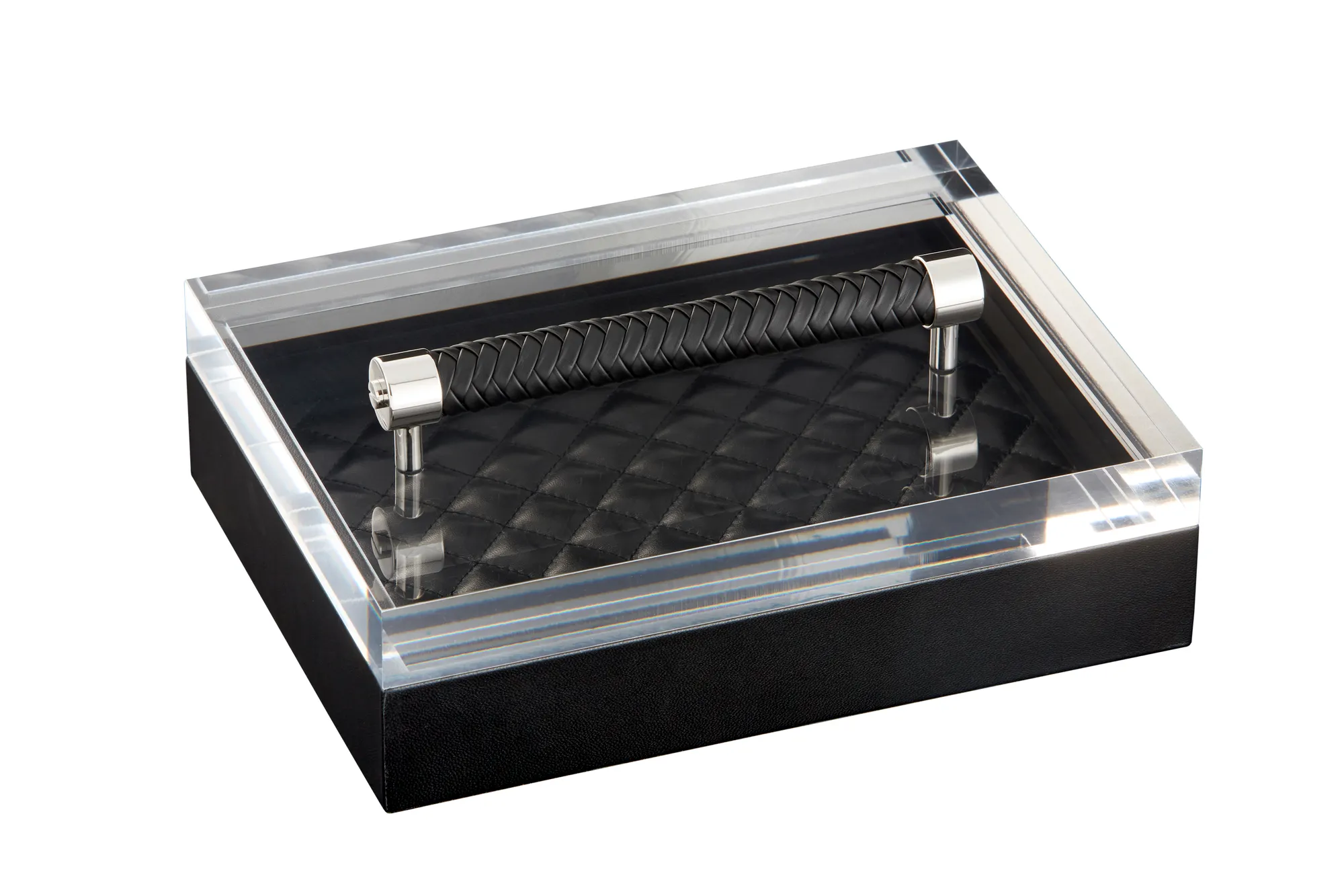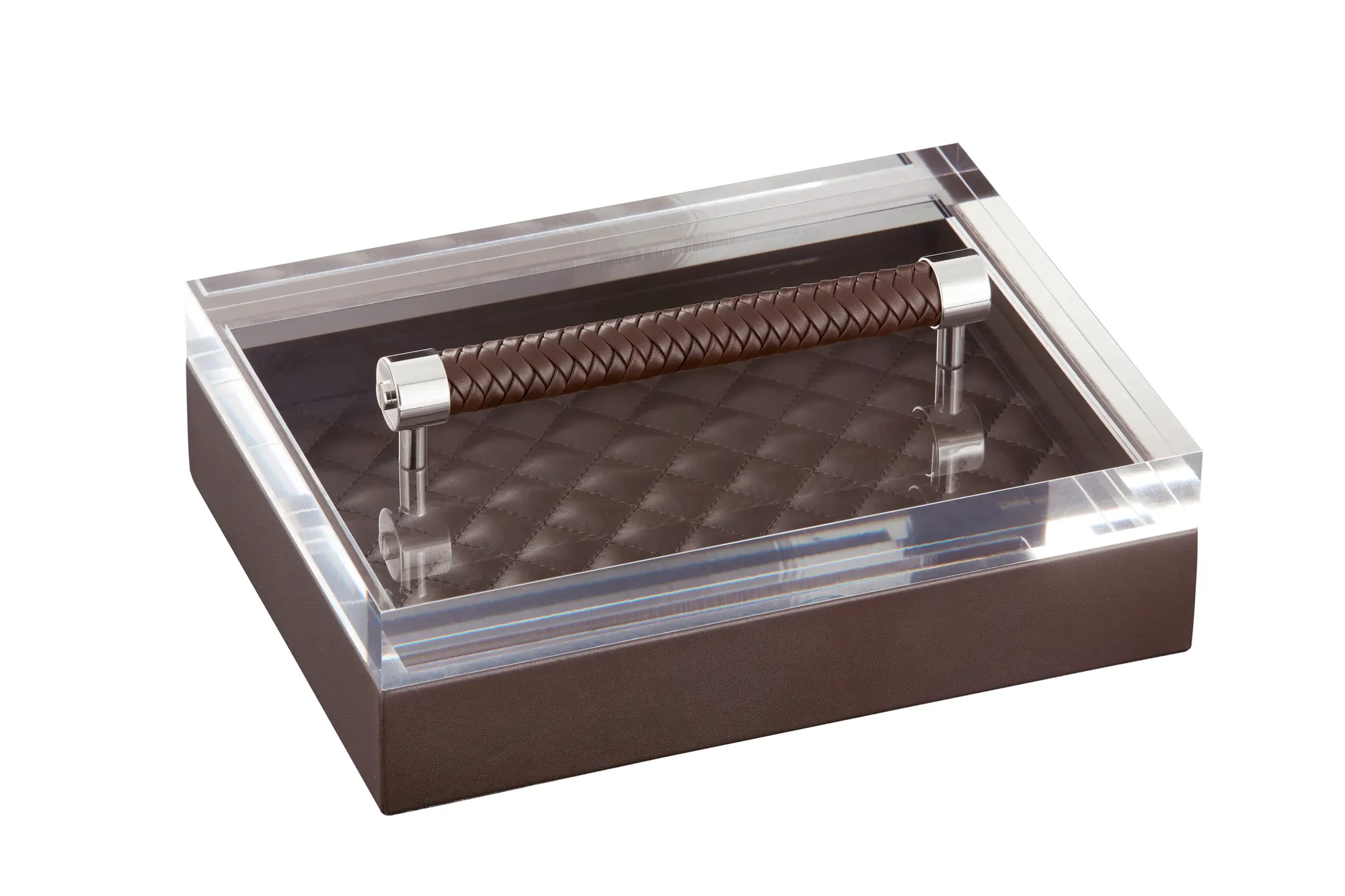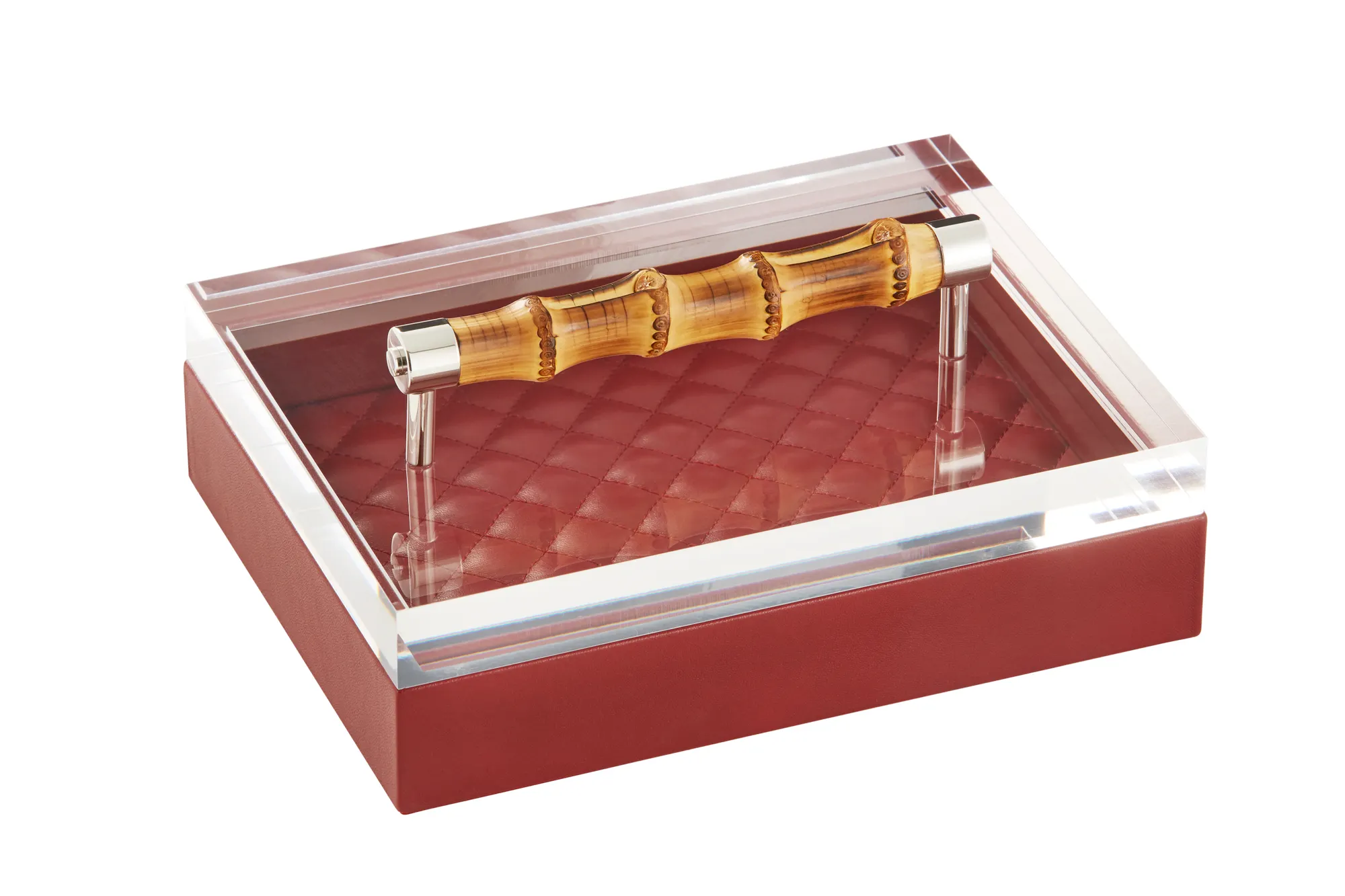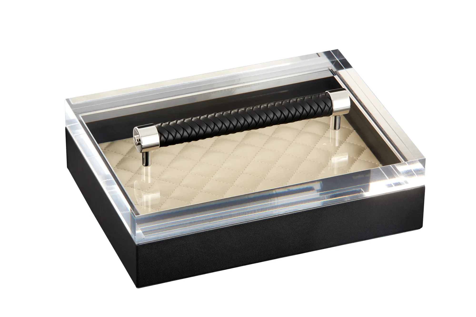 Leather box with acrylic lid, quilted diamonds padded lining.