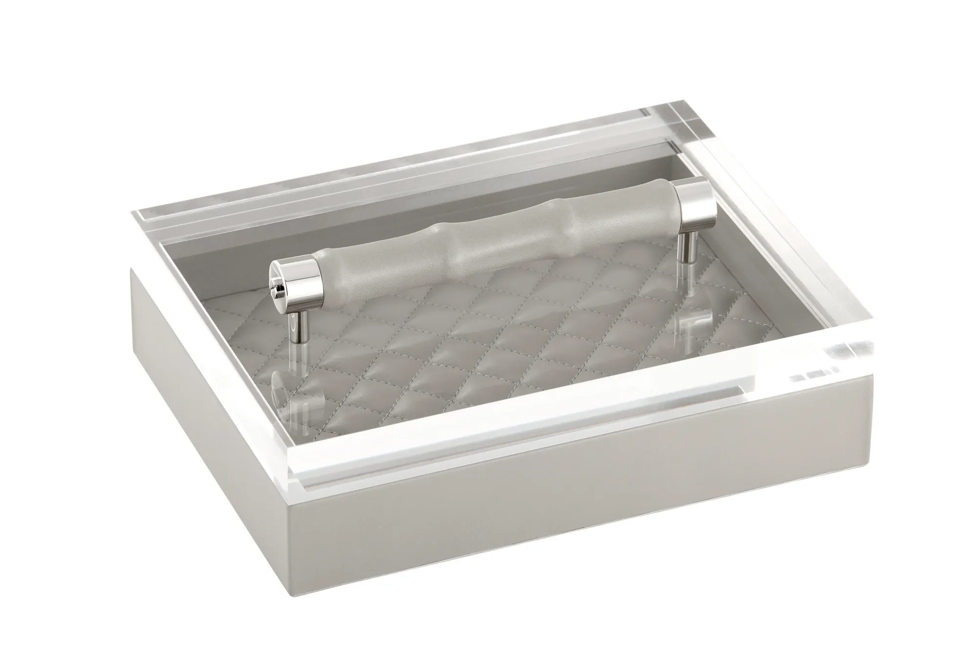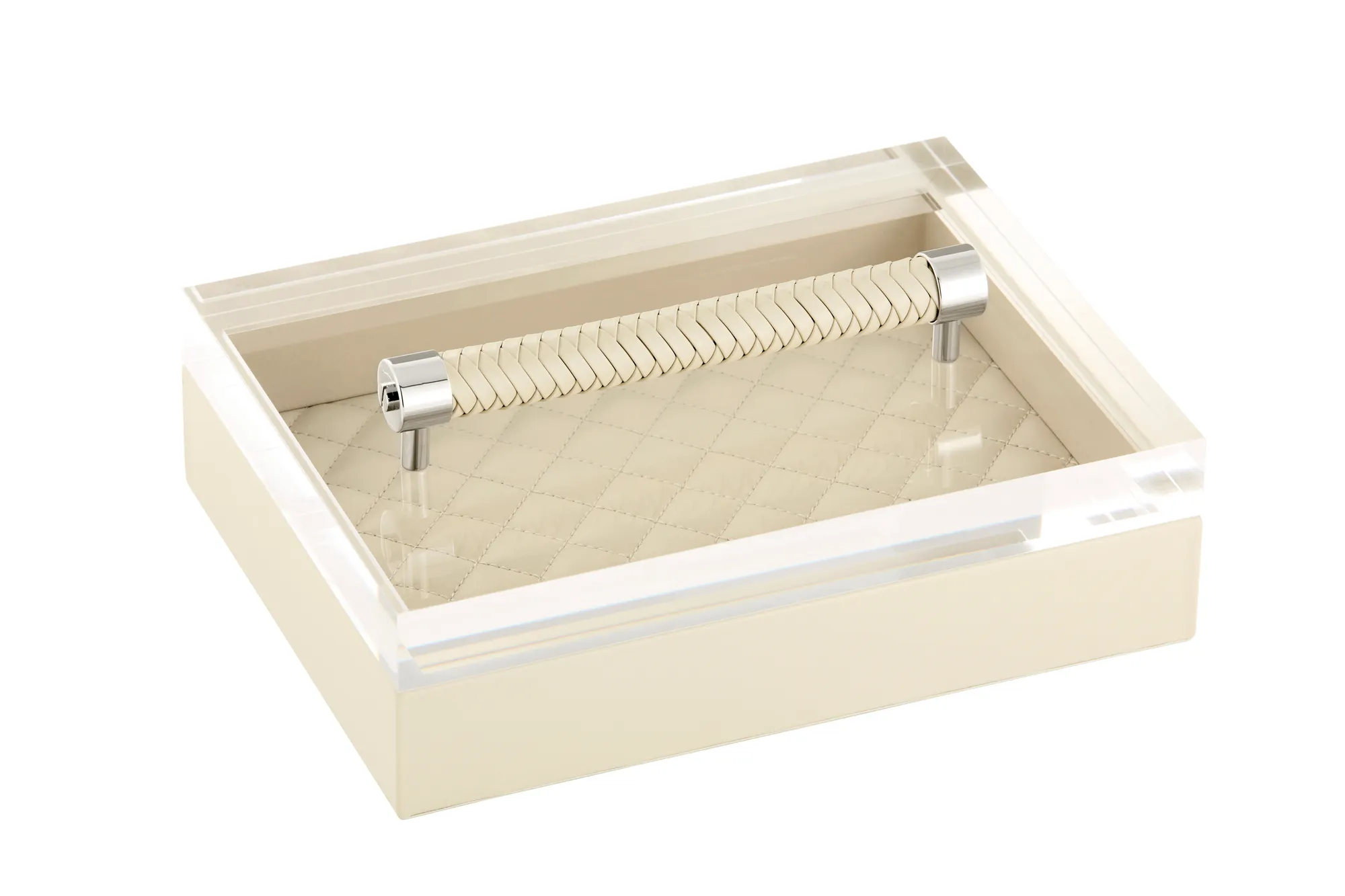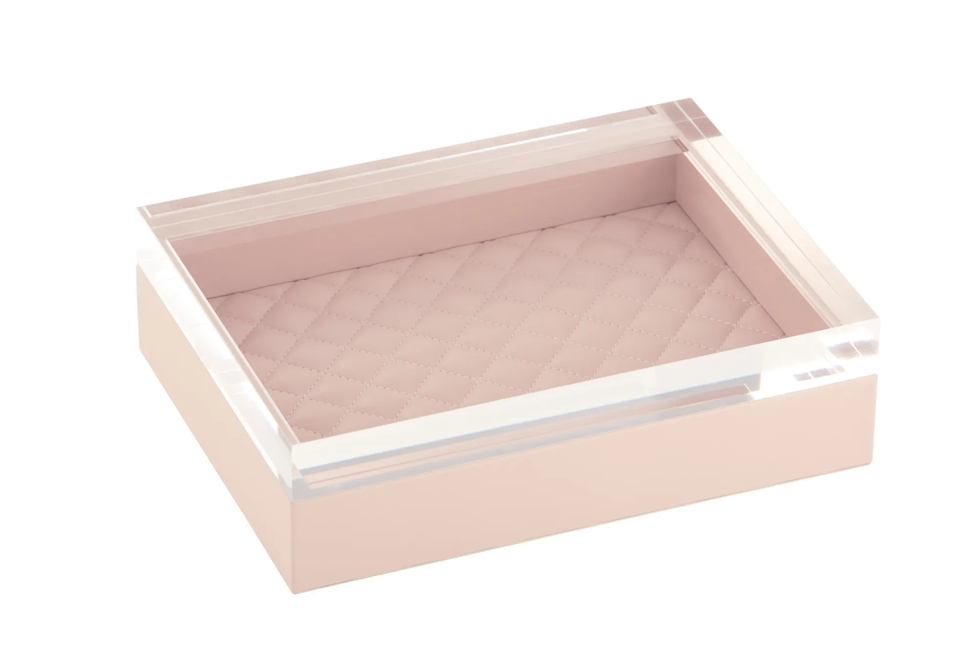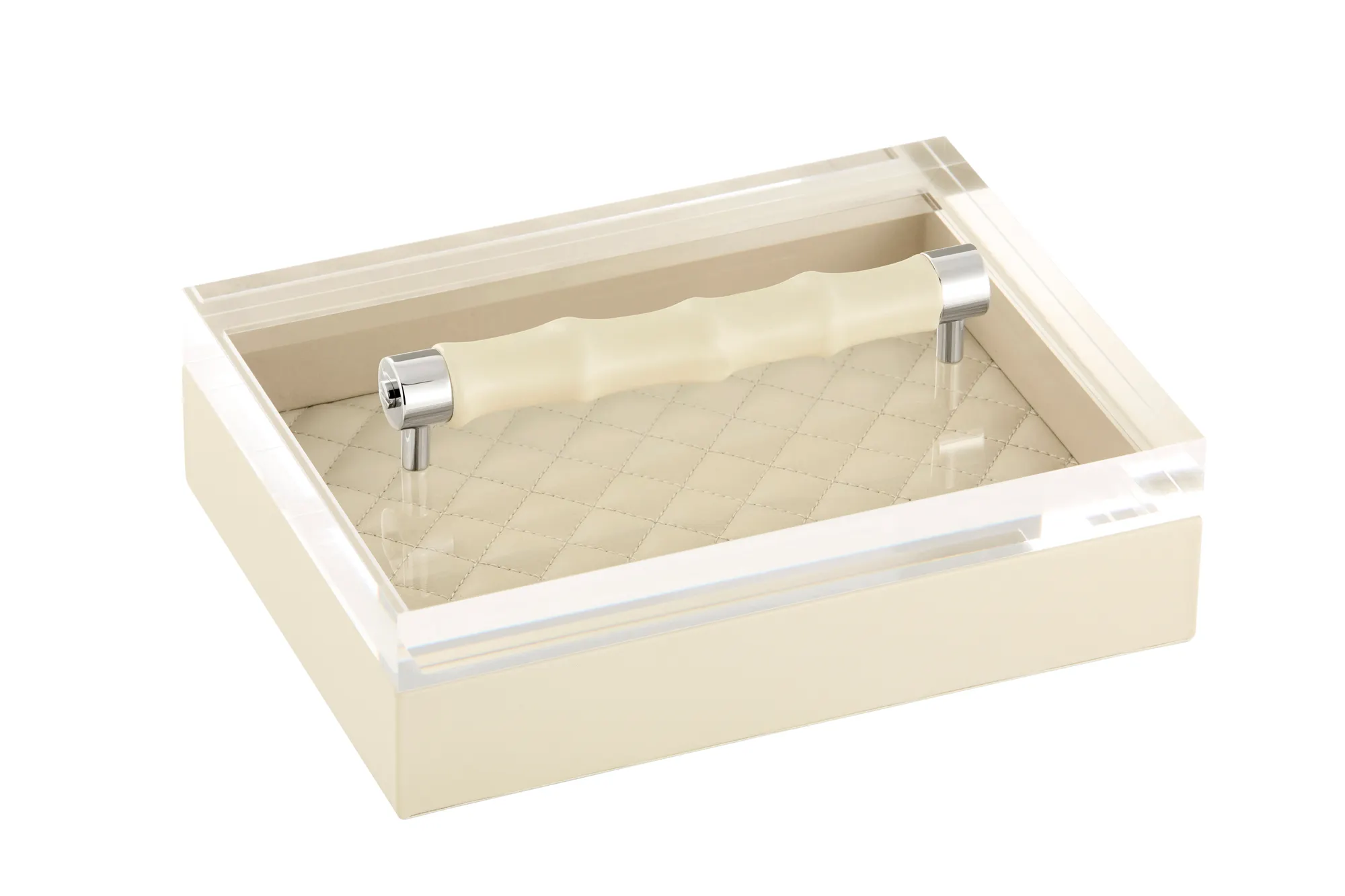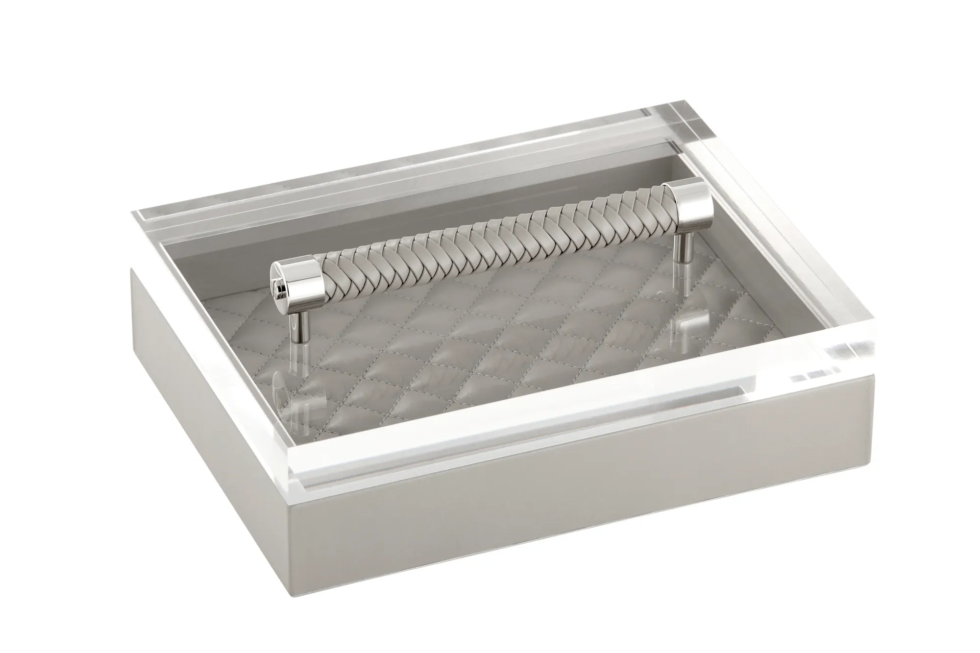 Leather box with acrylic lid, quilted diamonds padded lining.