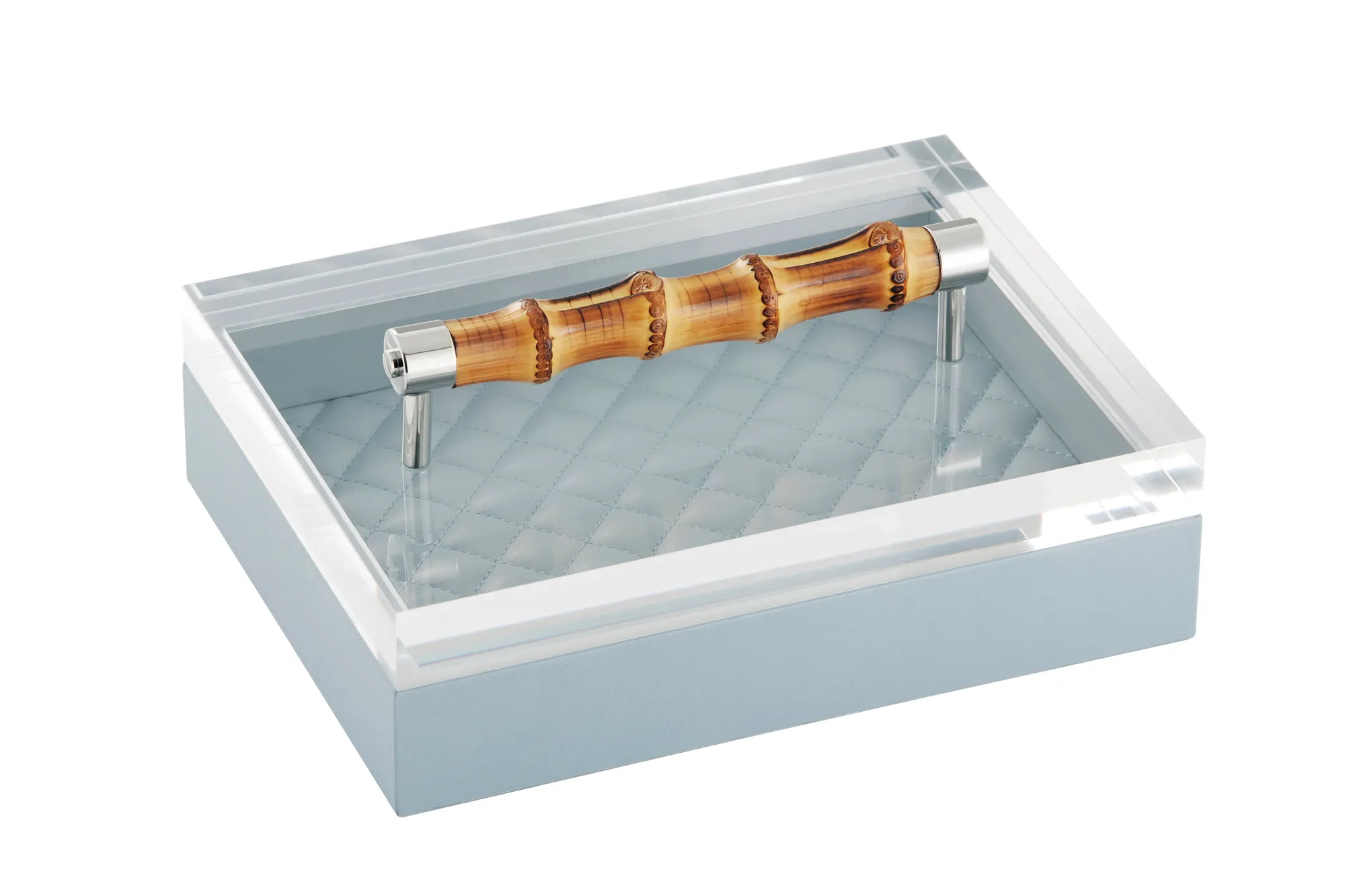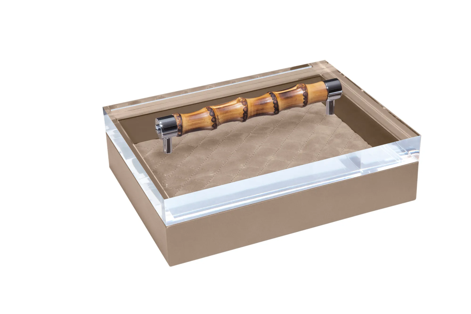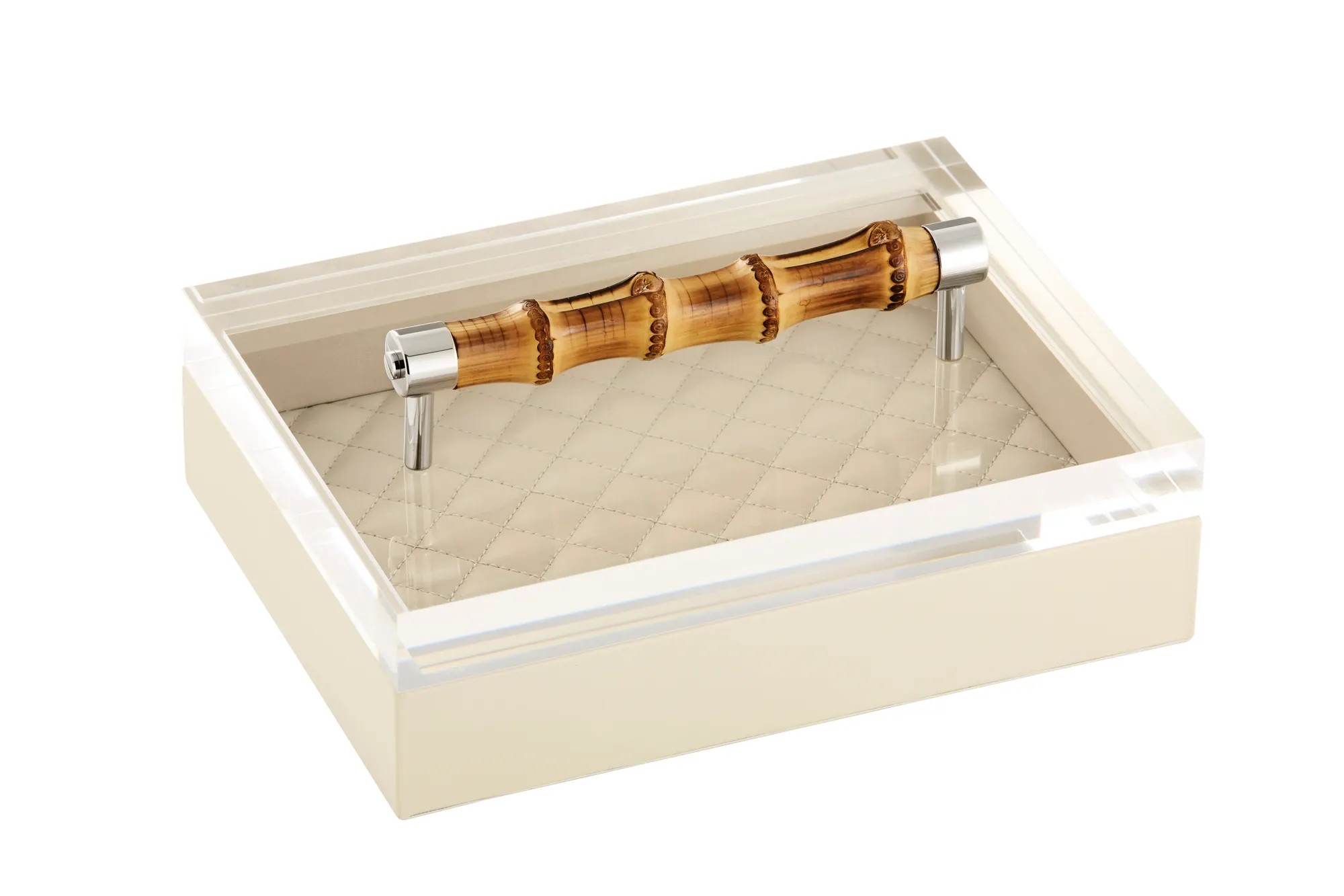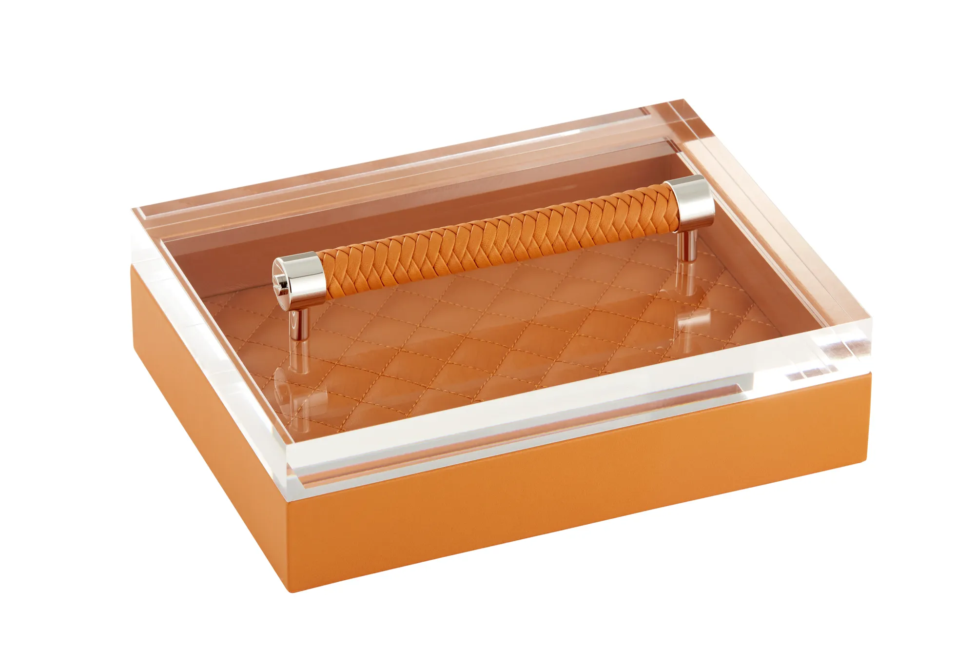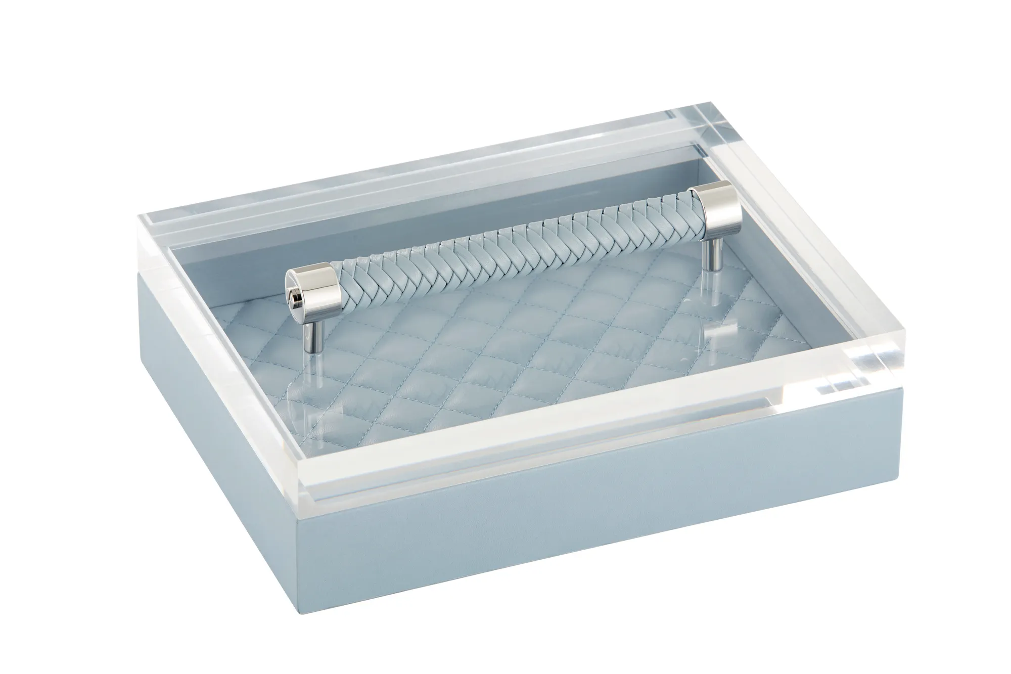 Leather box with acrylic lid, quilted diamonds padded lining.