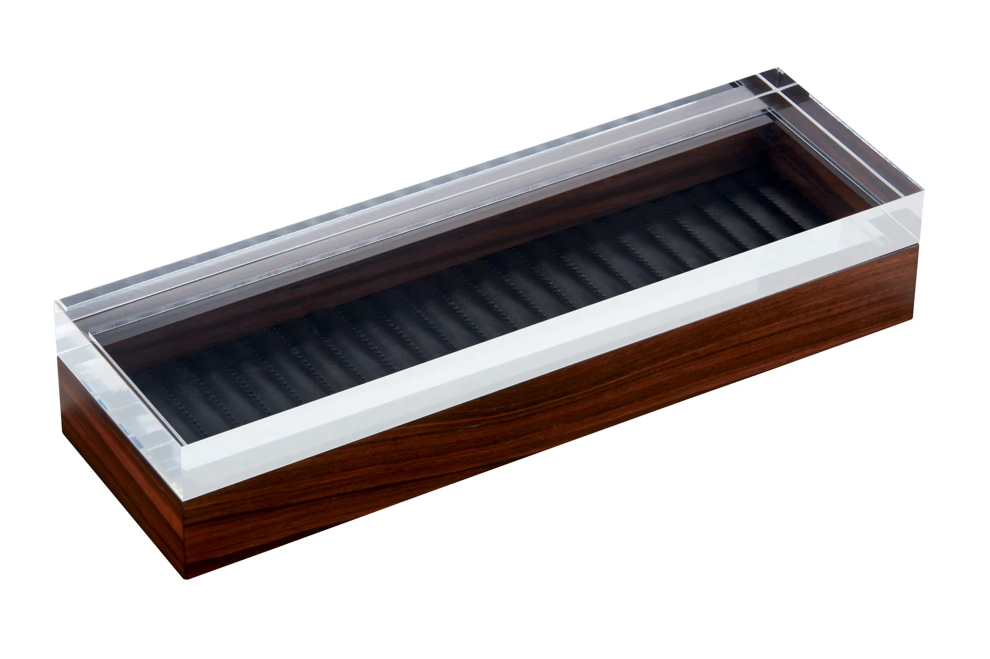 Macassar ebony box with acrylic lid, quilted striped padded lining.