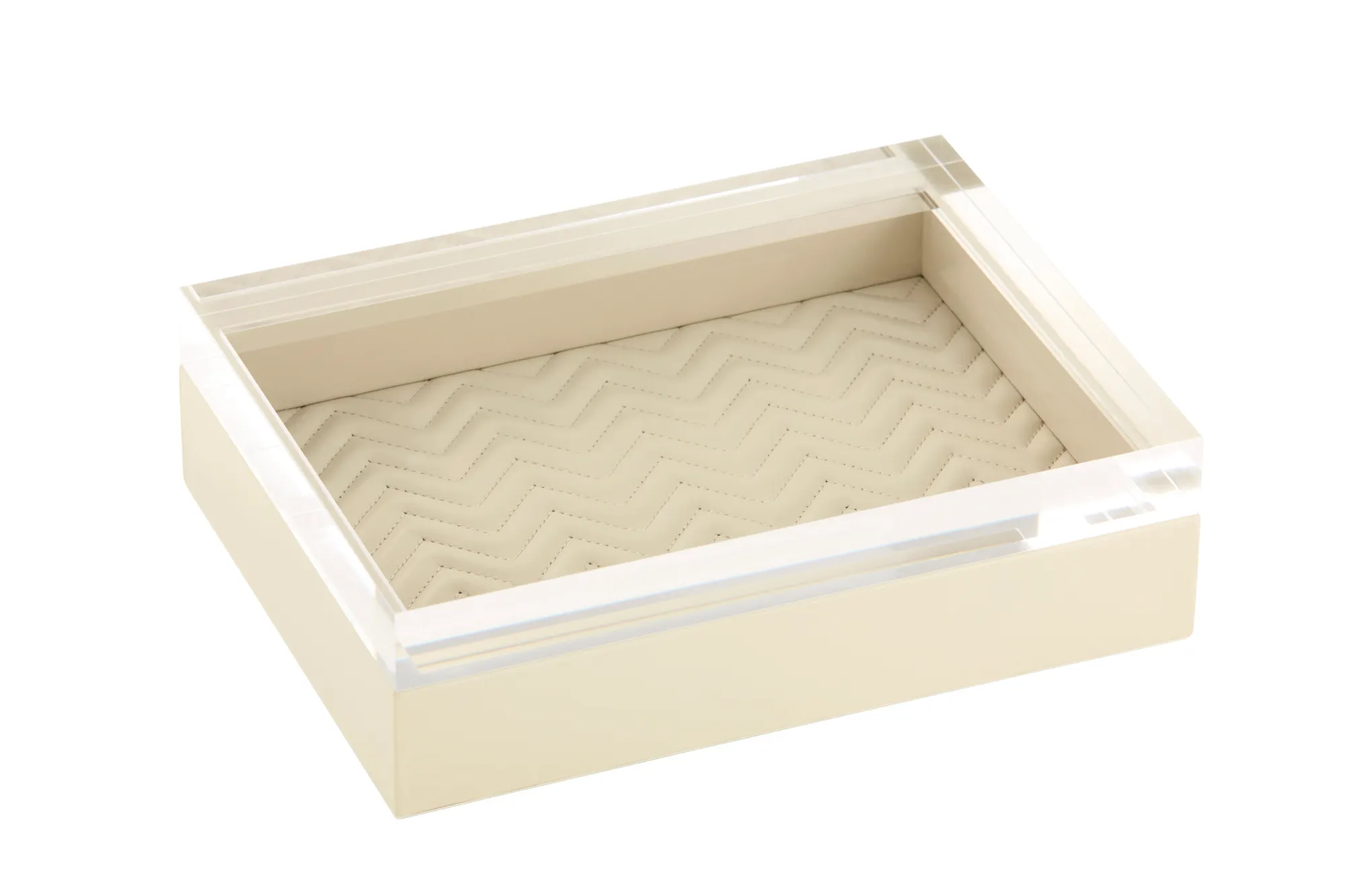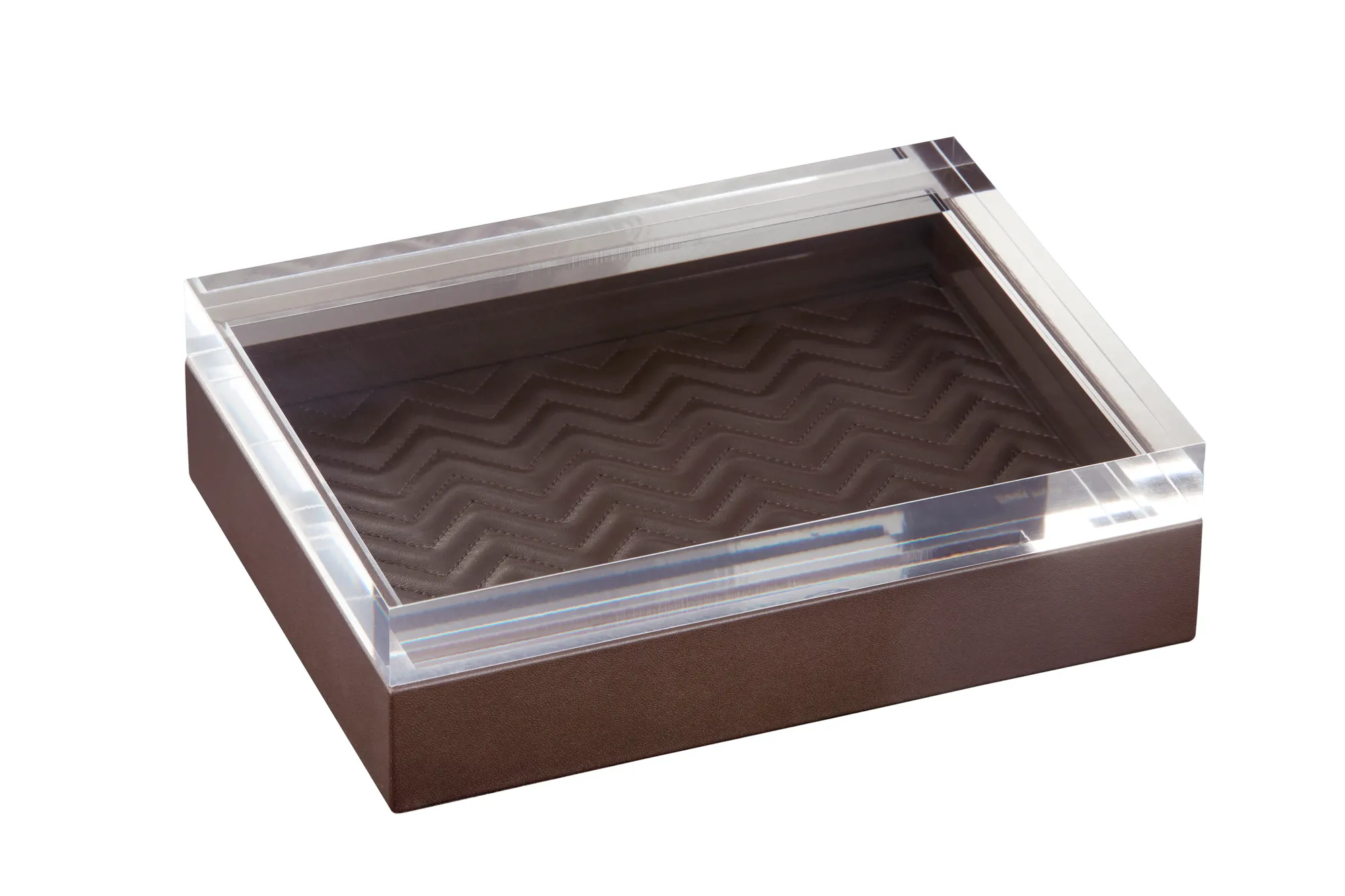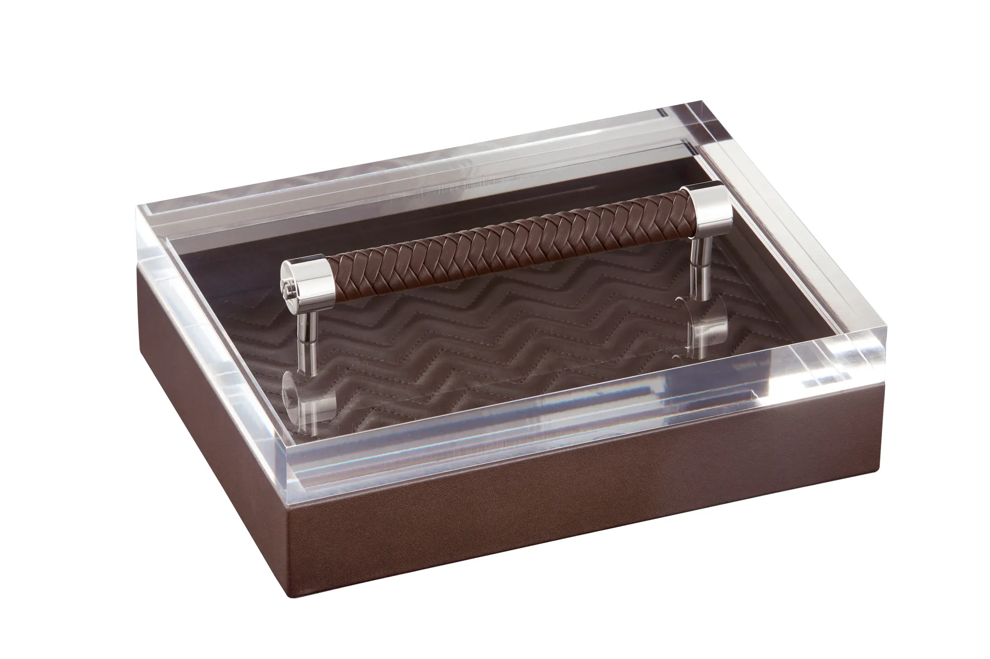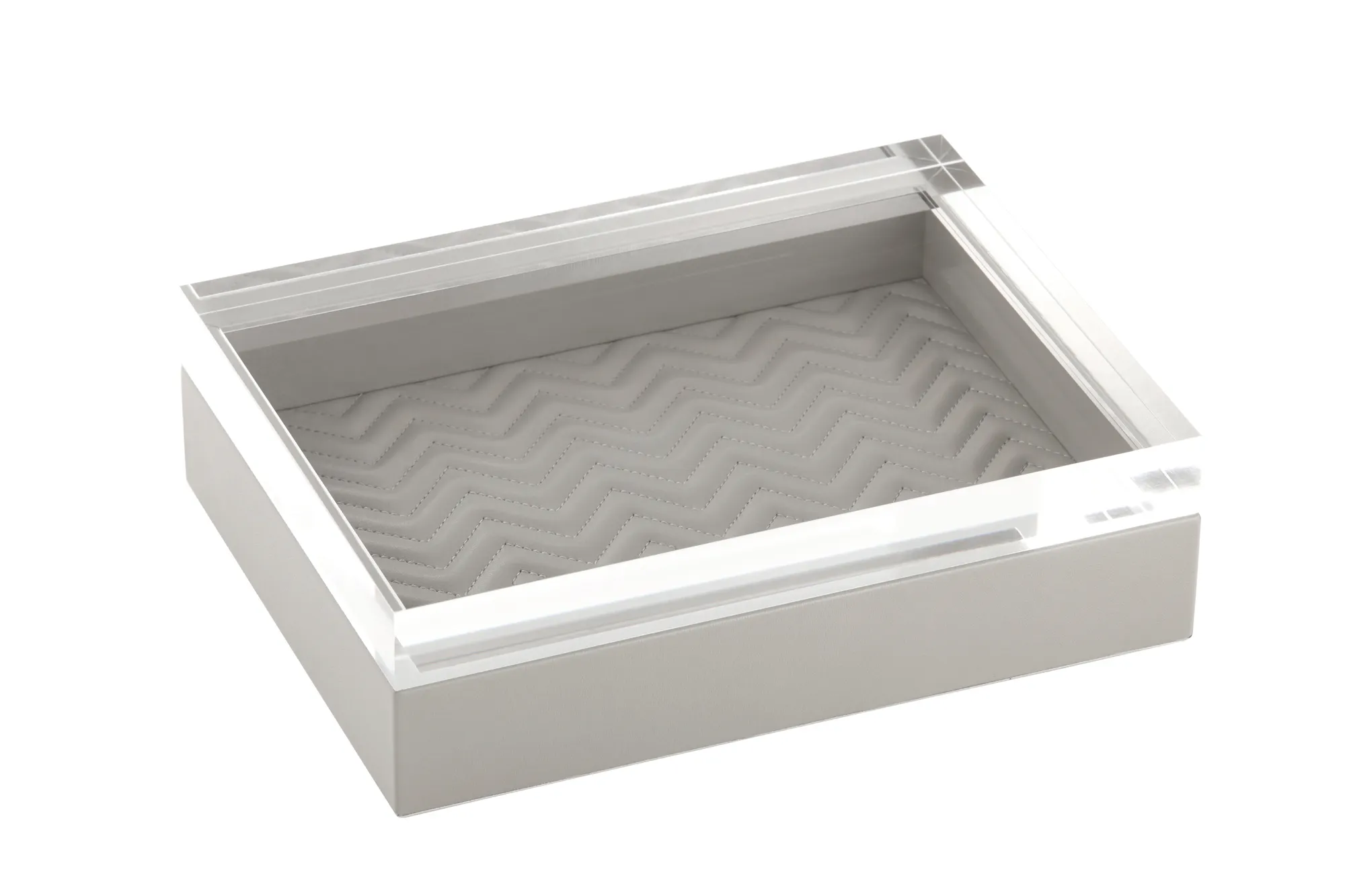 Leather box with acrylic lid, quilted herringbone padded lining.