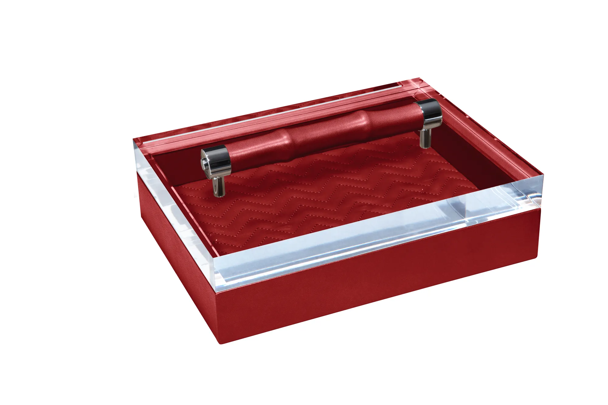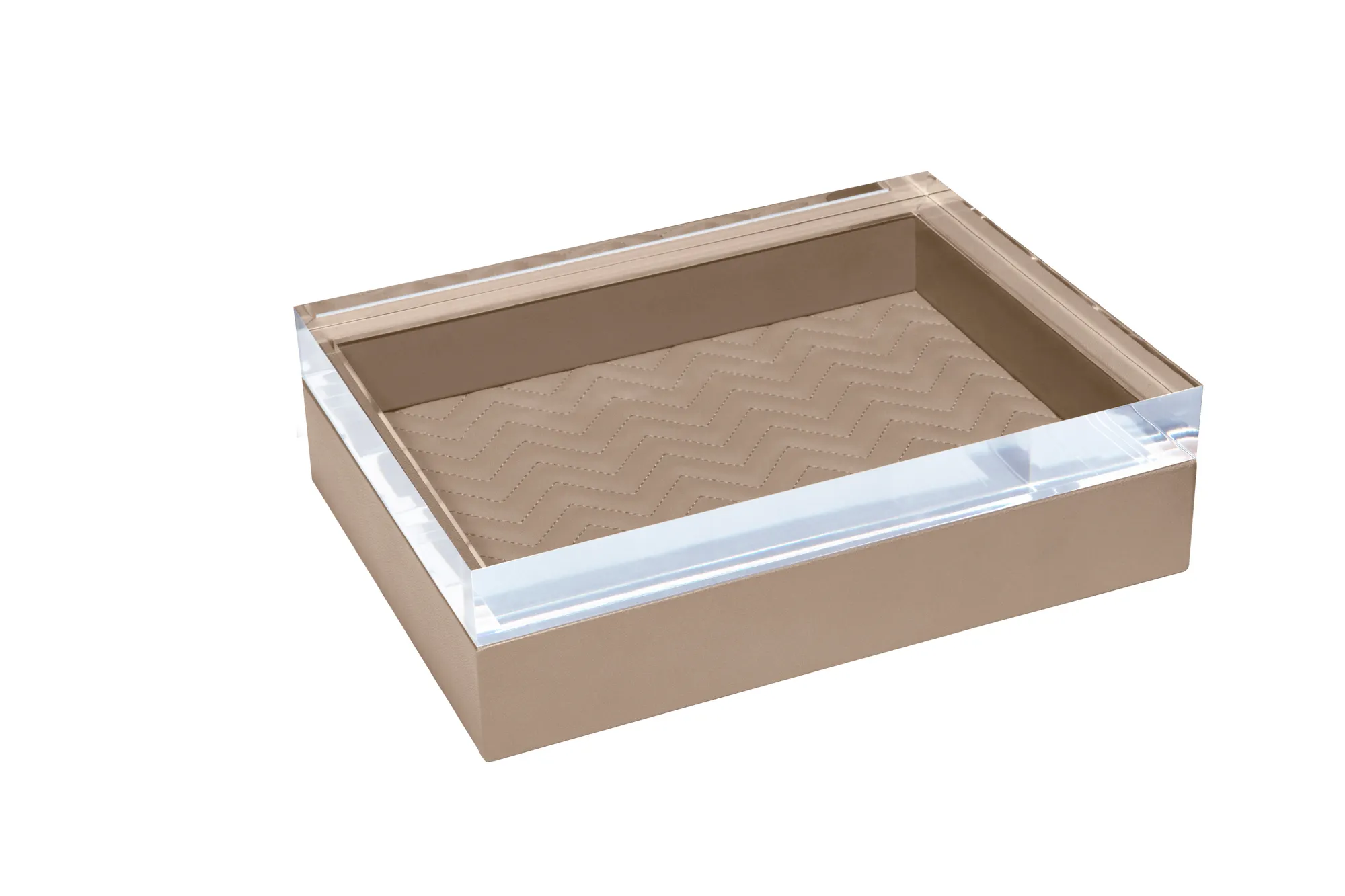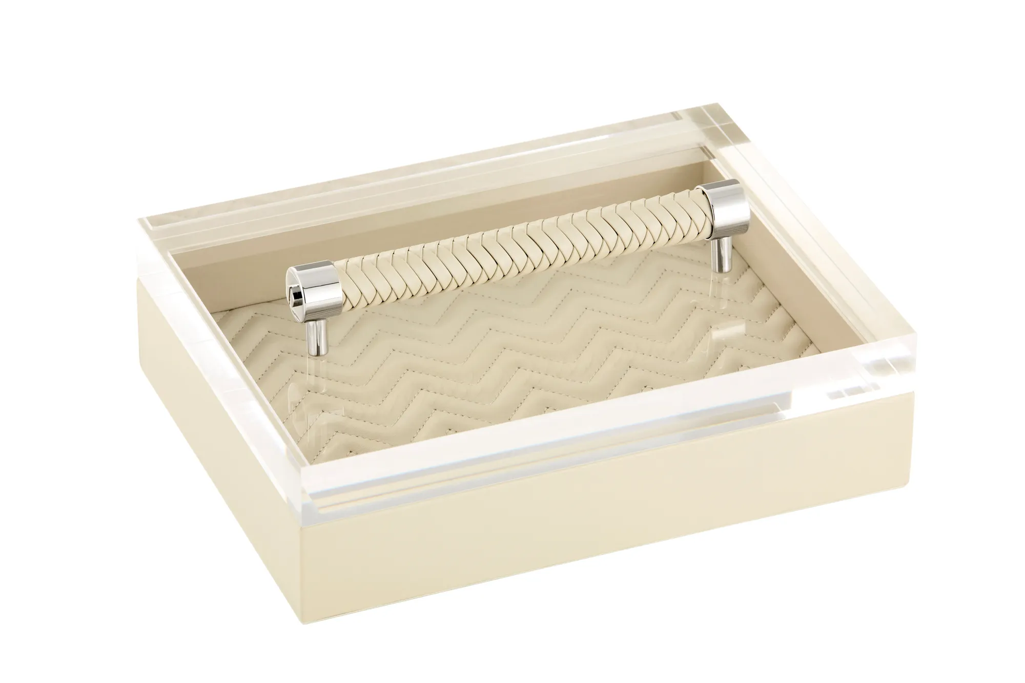 Leather box with acrylic lid, quilted herringbone padded lining.