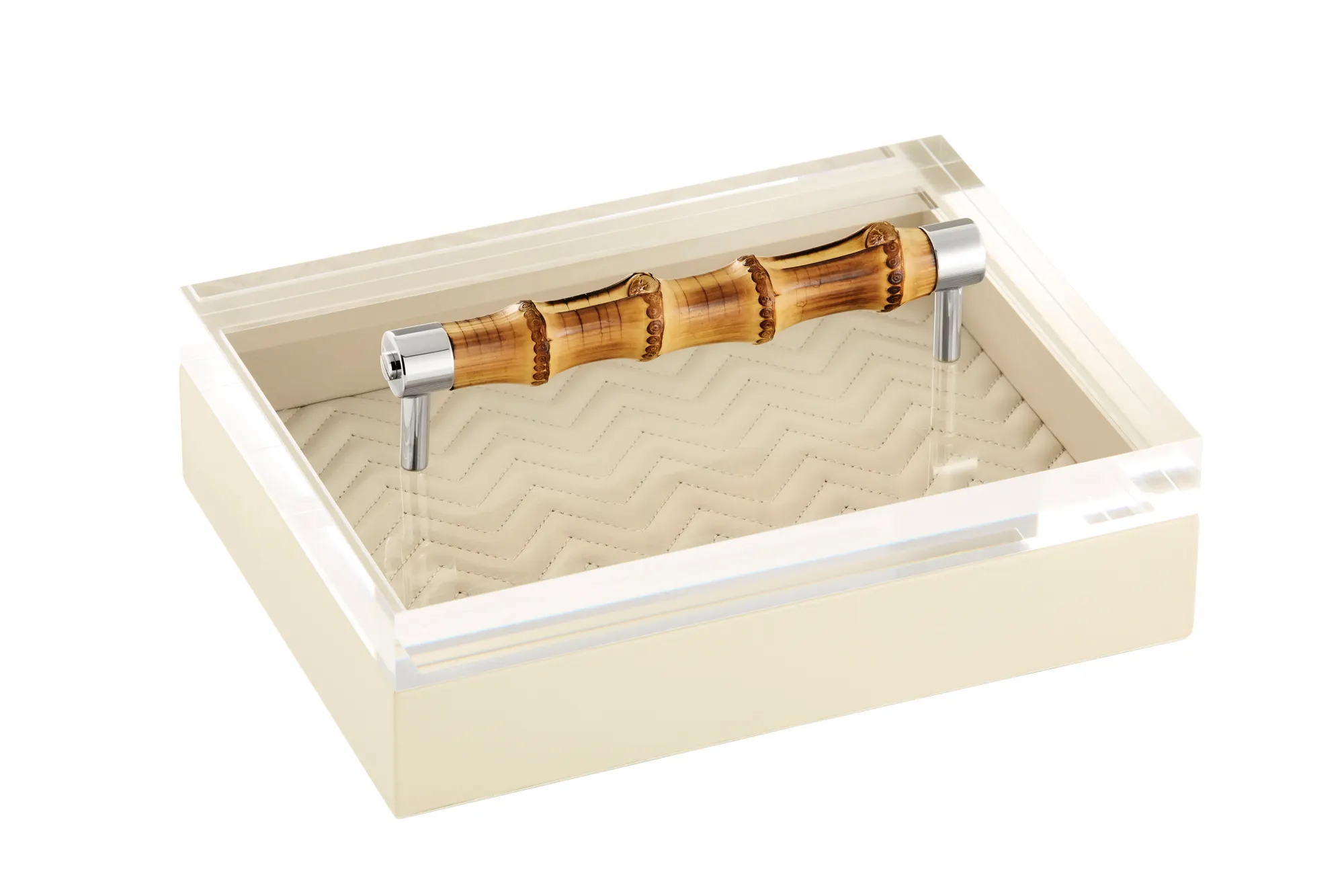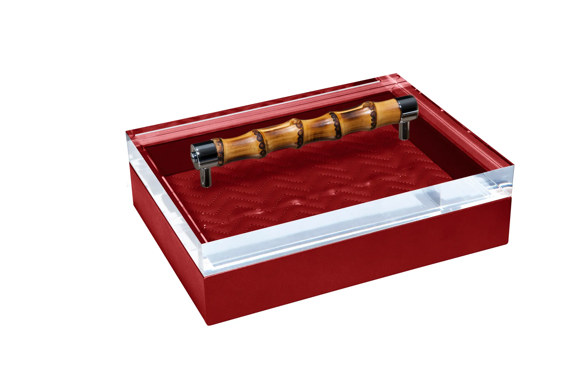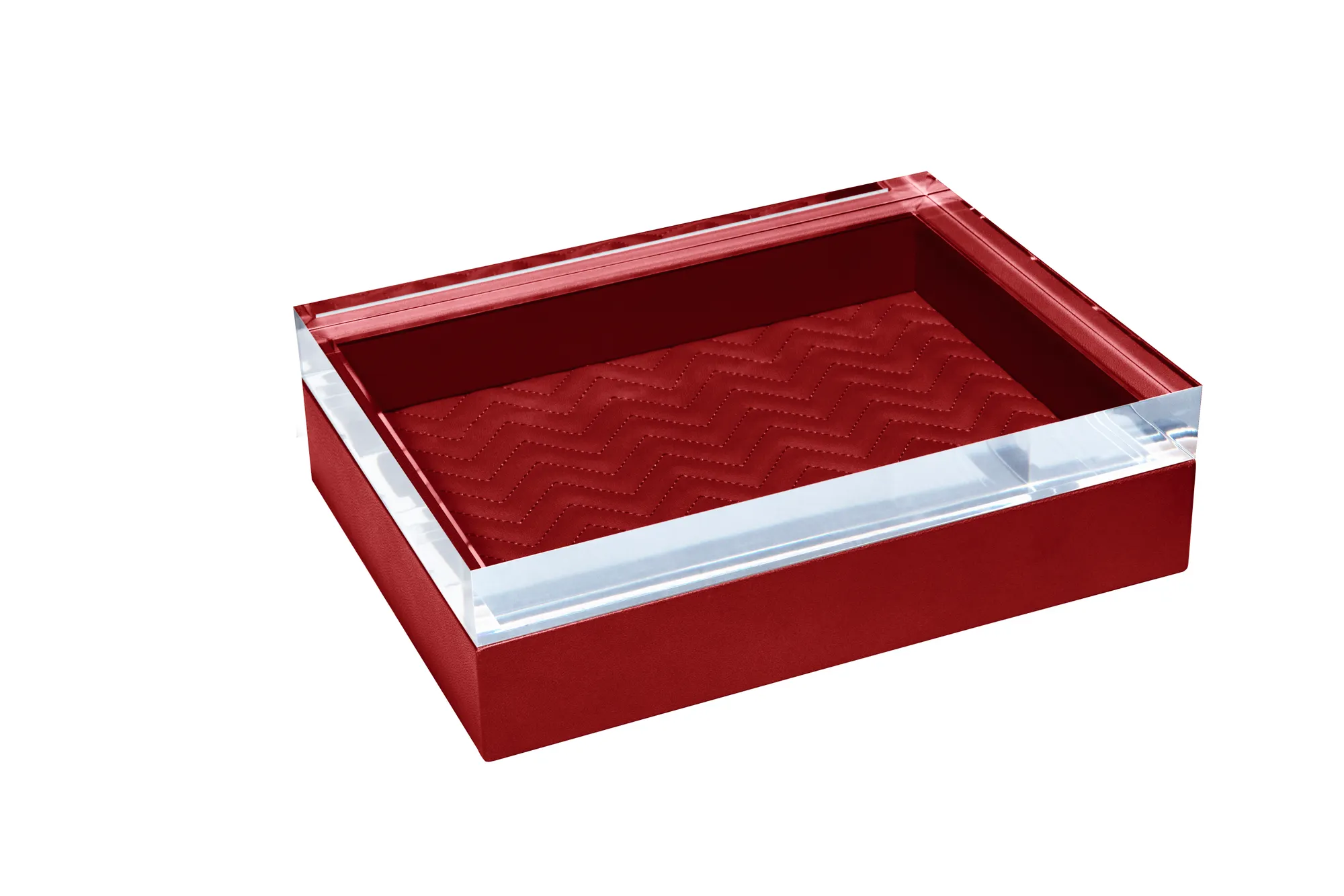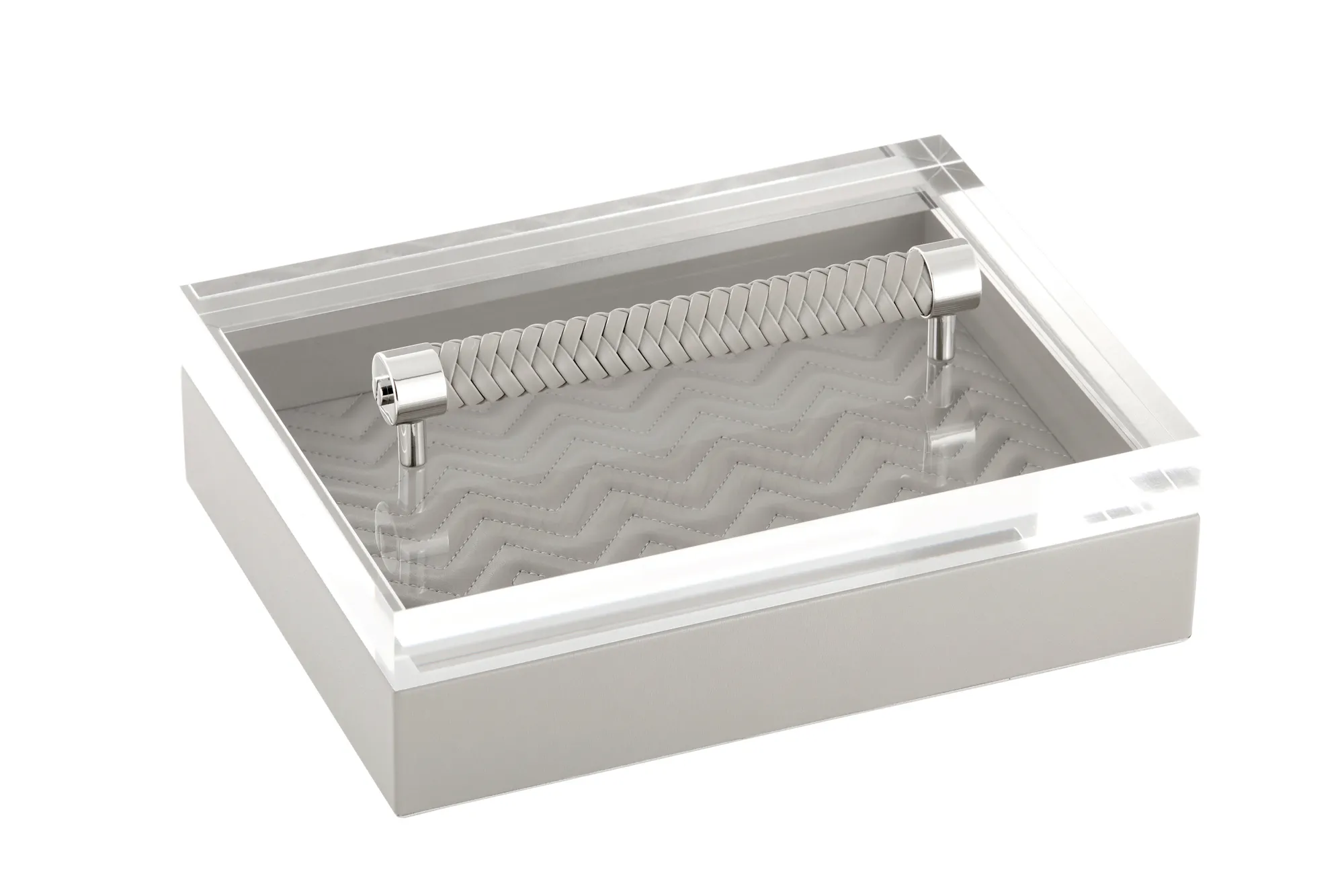 Leather box with acrylic lid, quilted herringbone padded lining.