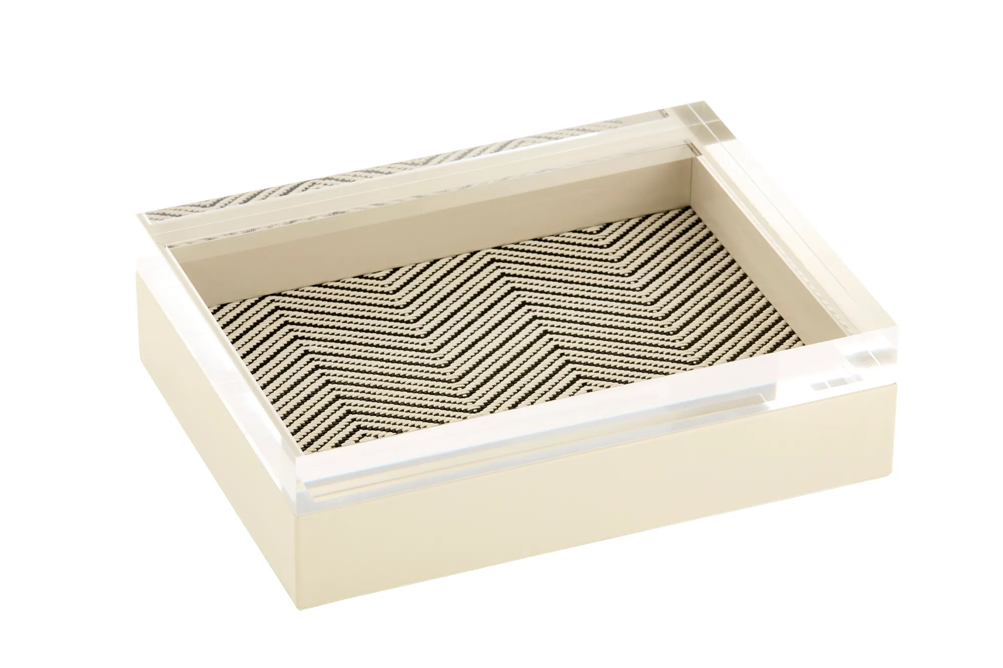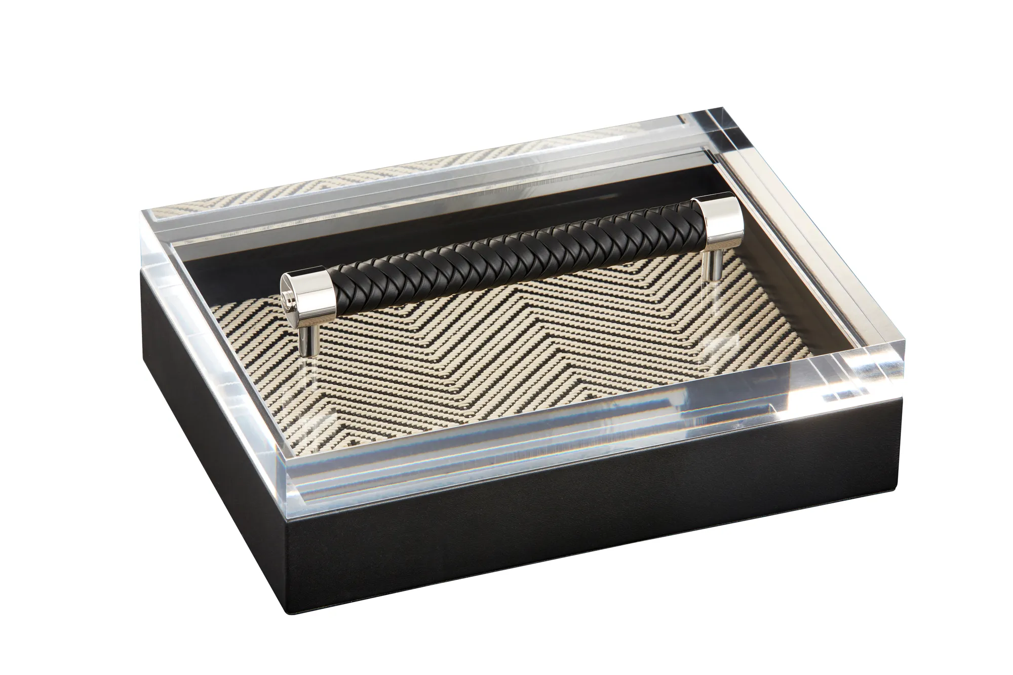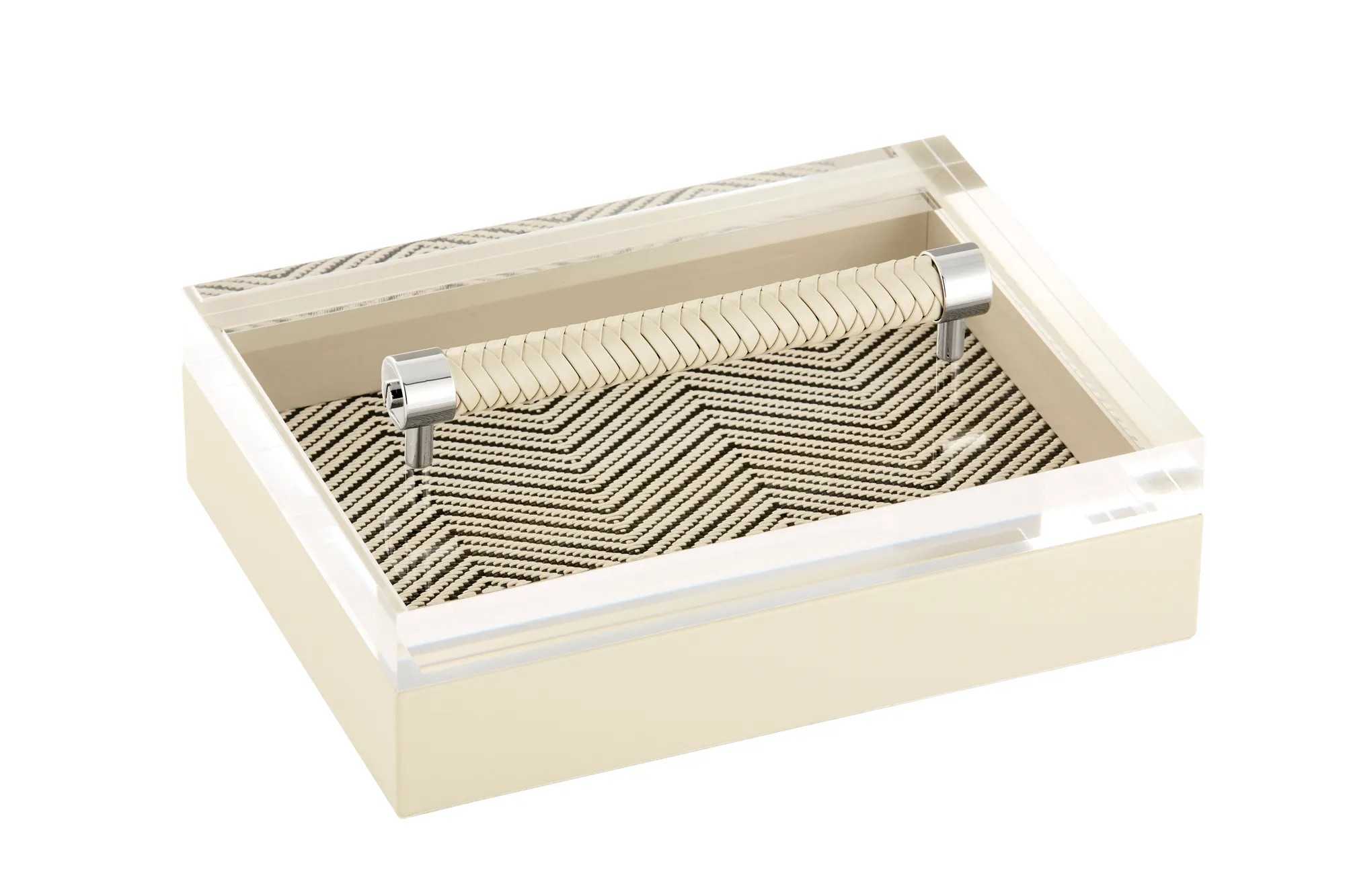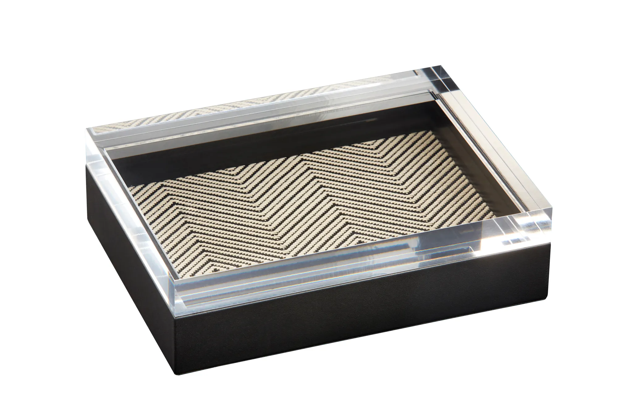 Leather box with acrylic lid, herringbone waxed cotton lining.