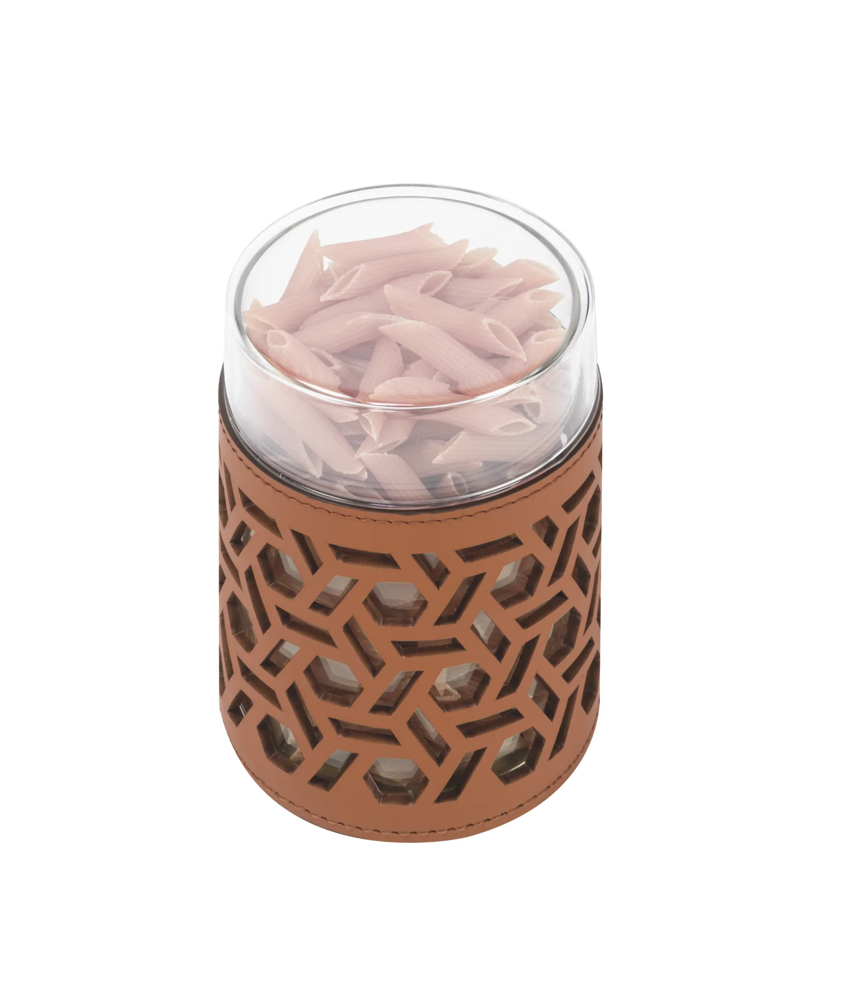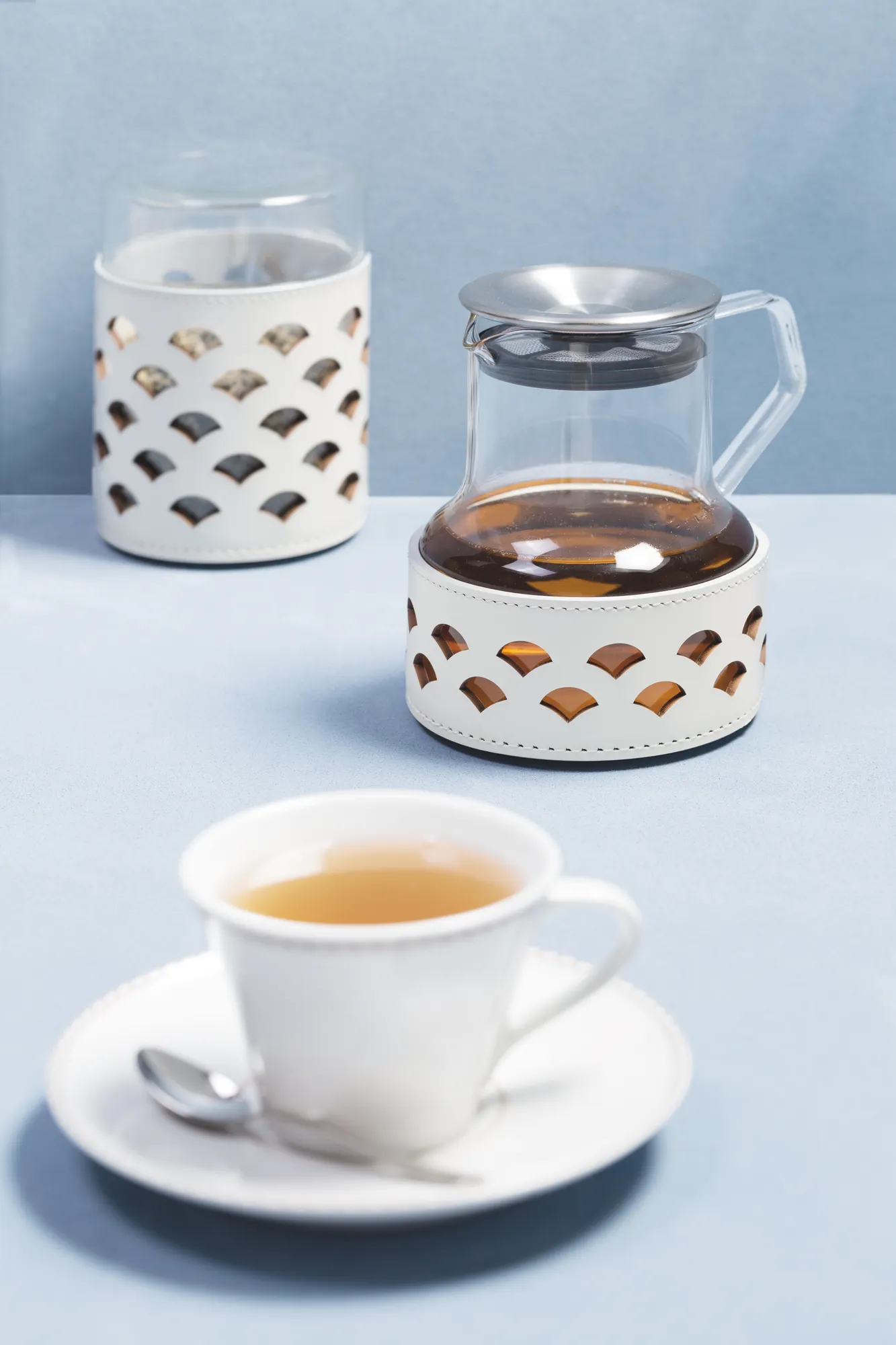 Transparent borosilicate glass partially dressed in finest regenerated leather with water-resistant and UV-resistant finish. It features a glass lid with silicone ring. Non-slip waterproof rubber base underneath. Removable cover for easy cleaning.