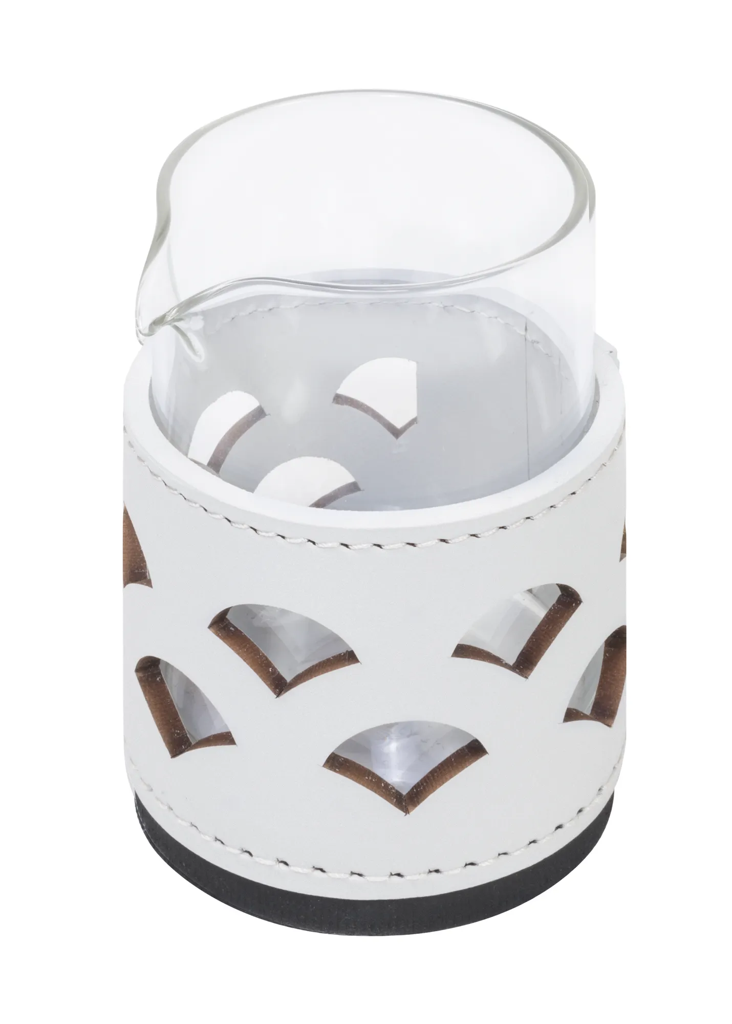 Transparent borosilicate glass partially dressed in finest regenerated leather with water-resistant and UV-resistant finish. Non-slip waterproof rubber base underneath. Removable cover for easy cleaning.