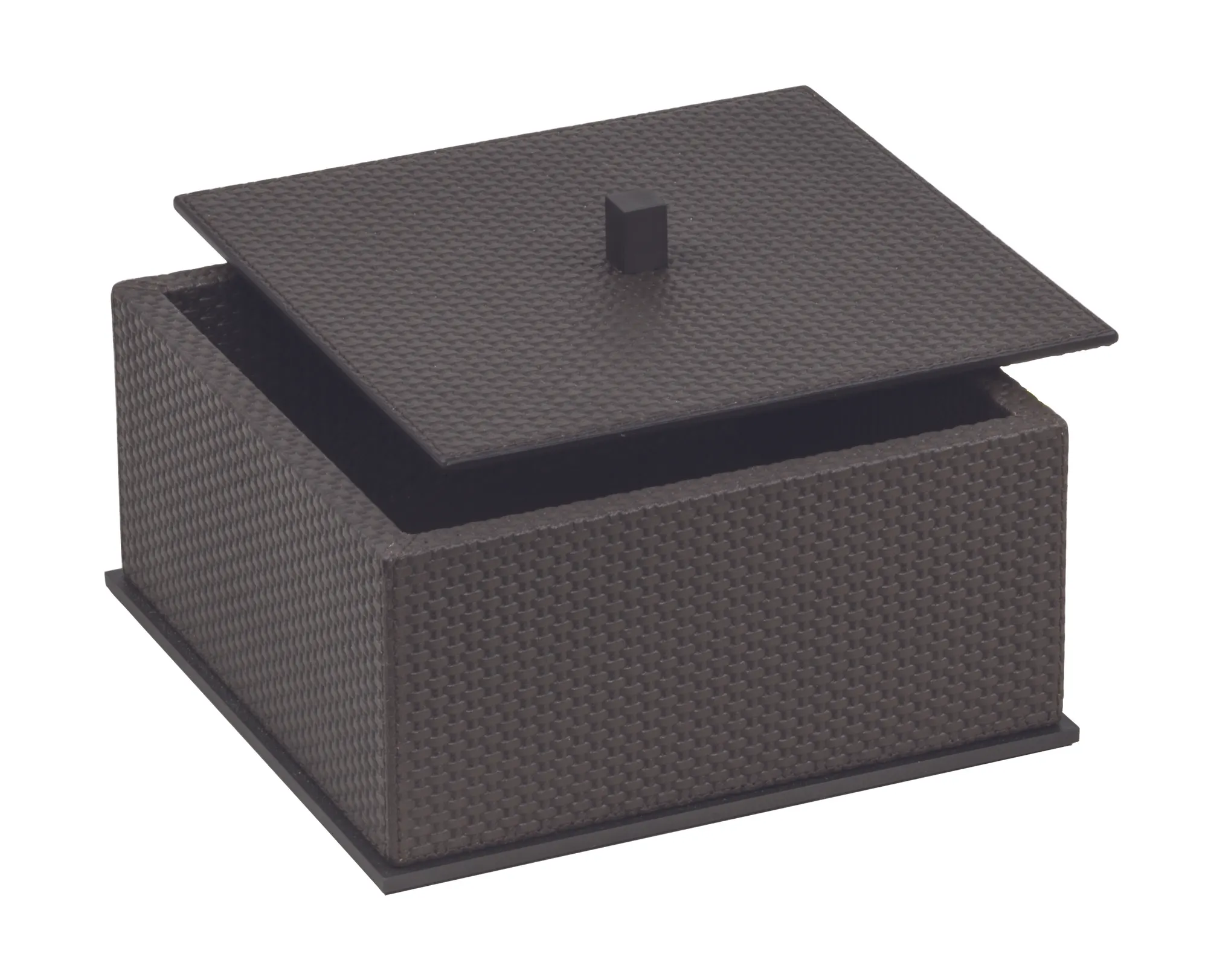 Leather covered wood structure. Metal base frame and metal handle are available in three finishes. Removable lid. Non-slip waterproof rubber base underneath.