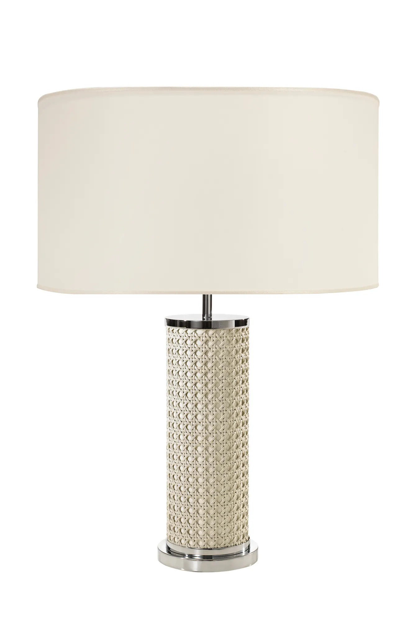 Cylindrical lamp with ivory base covered with hand-braided leather.