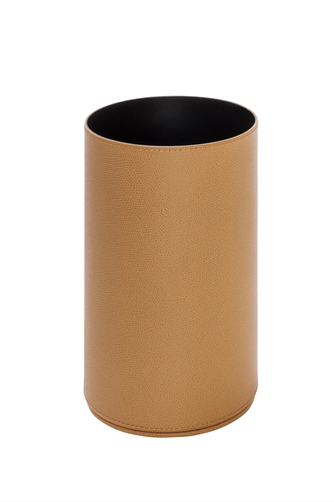 Leather-covered cylindrical floorlamp in lacquered aluminium, 2 meters of cable, plug and foot control dimmer.