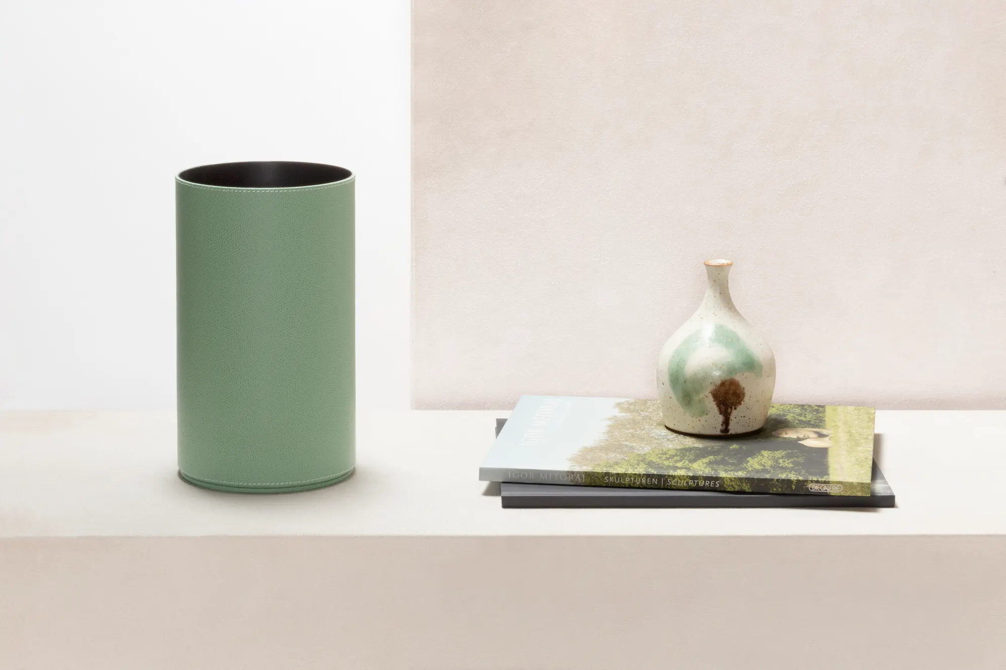 Leather-covered cylindrical floorlamp in lacquered aluminium, 2 meters of cable, plug and foot control dimmer.