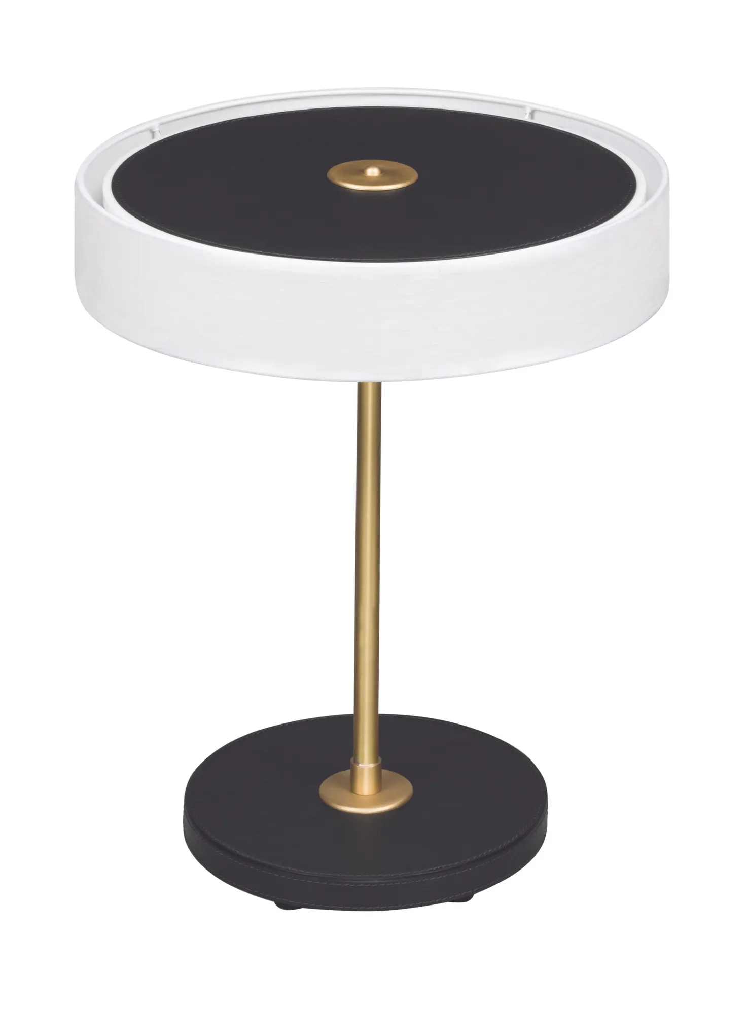 Leather covered wood base with fixed brass stem available in three finishes. White linen lampshade with fireproof opaque plexiglass diffuser.