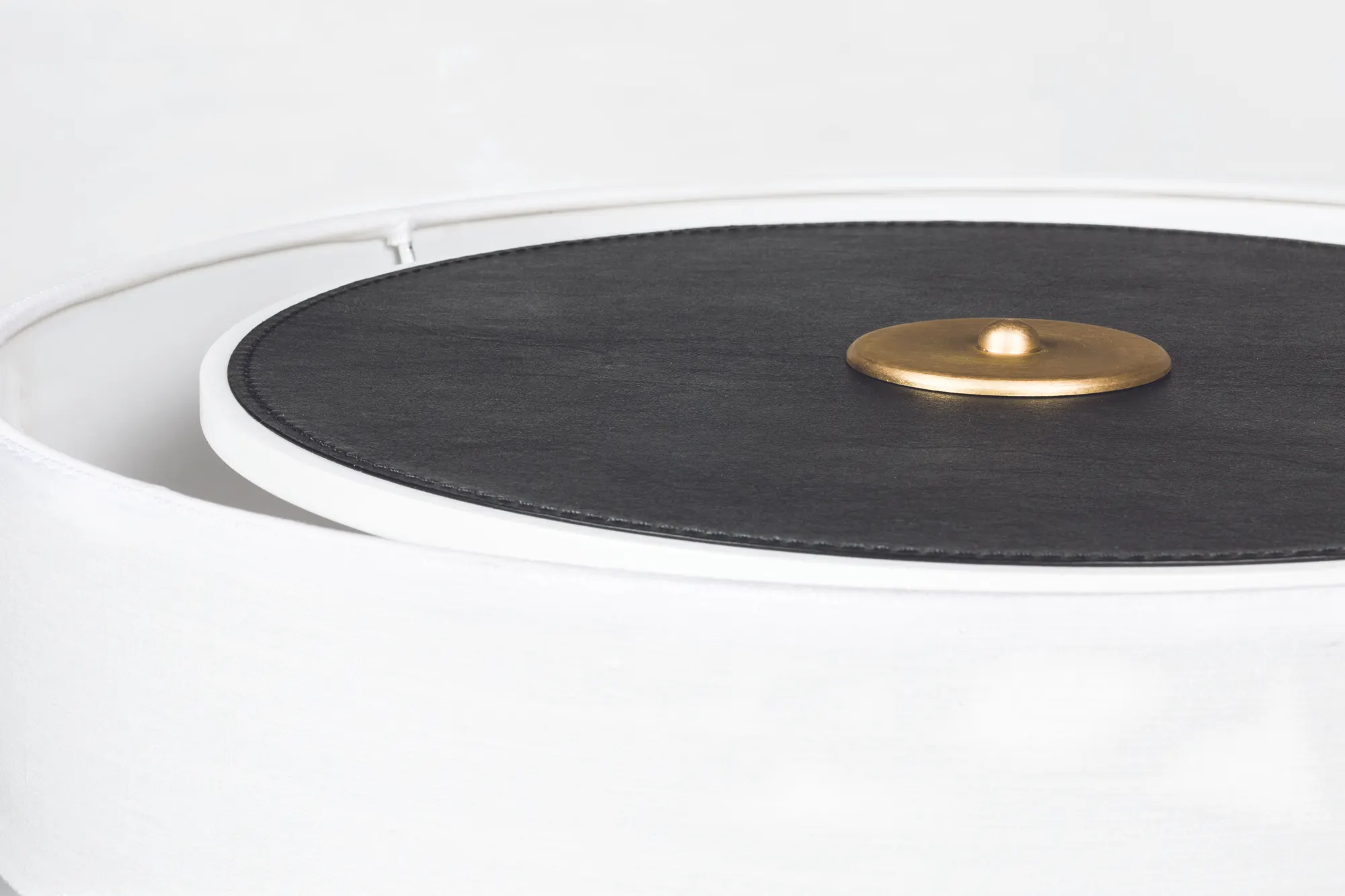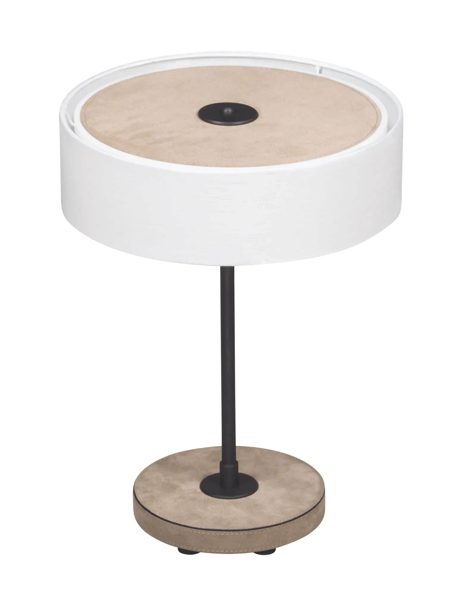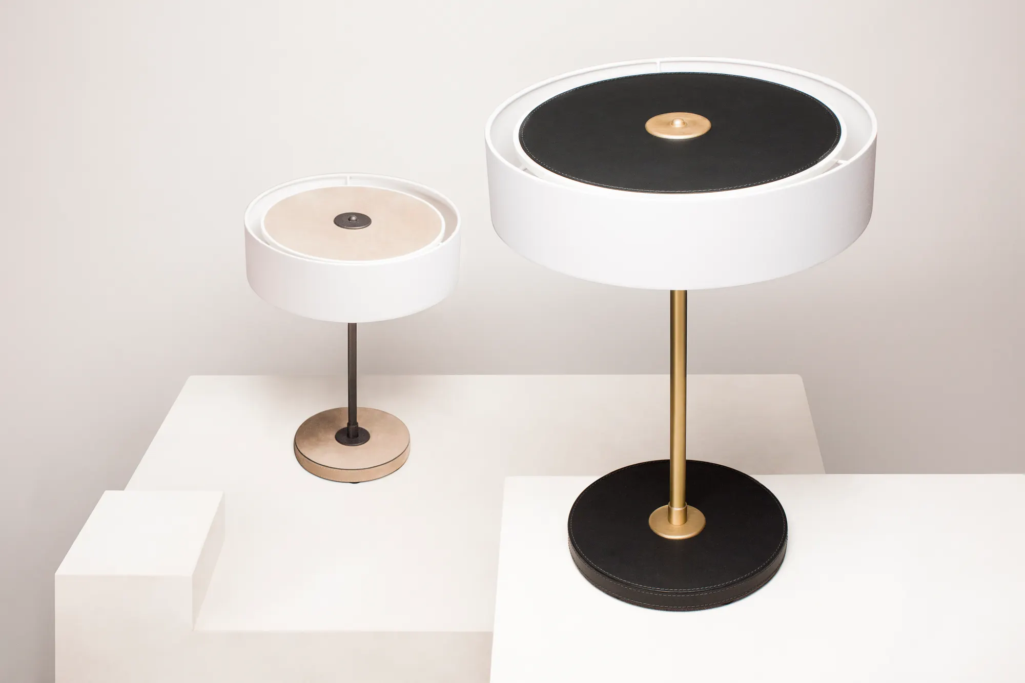 Leather covered wood base with fixed brass stem available in three finishes. White linen lampshade with fireproof opaque plexiglass diffuser.