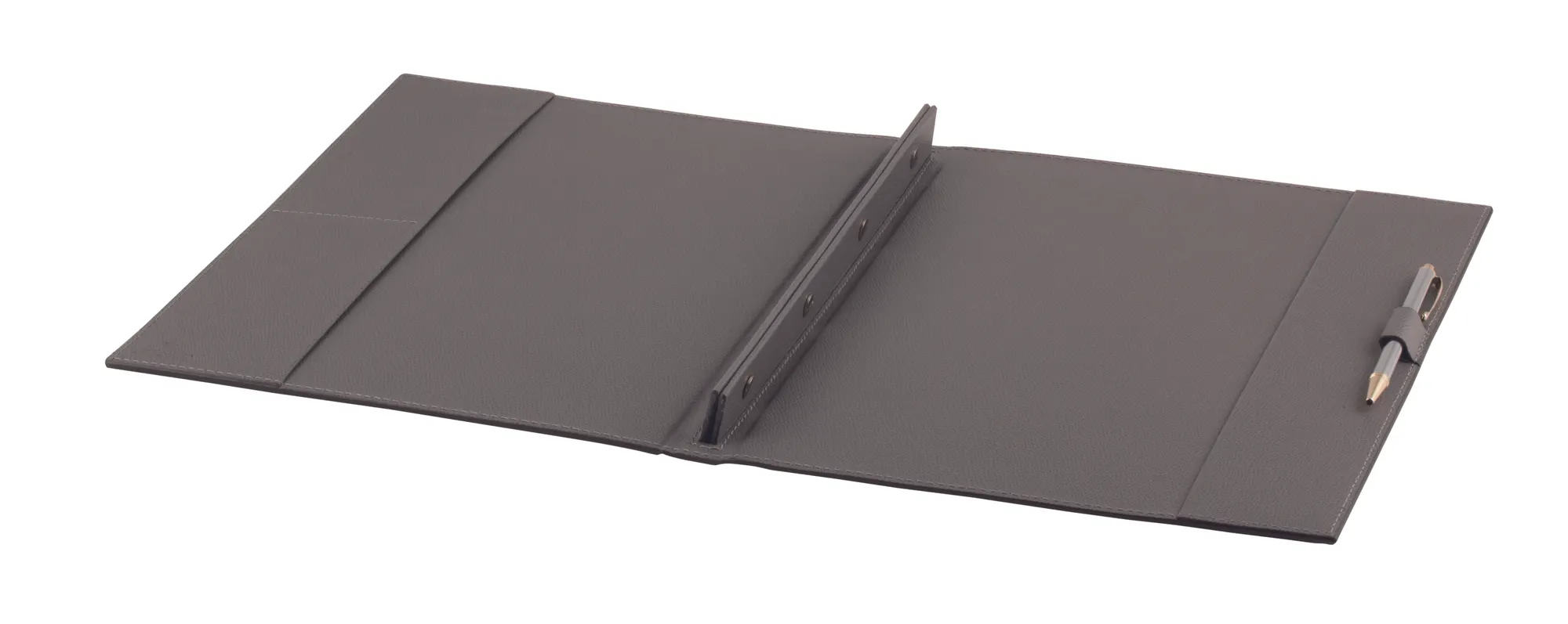 All-leather structure with soft padding on the cover side. Left inner pocket provided with partitions for envelopes or cards. Two right inner pockets for A4 and A5 sheets. Center pen holder.