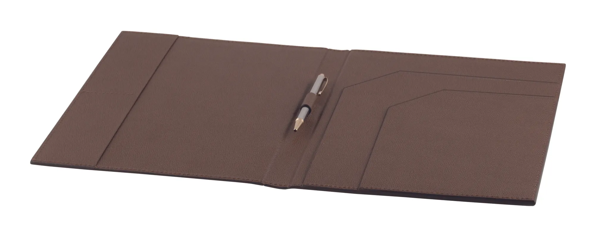 All-leather structure with soft padding on the cover side. Left inner pocket provided with partitions for envelopes or cards. Center with a four-screw system to hold A4 sheets or plastic envelopes. Right inner pocket for A4 sheets and pen holder.