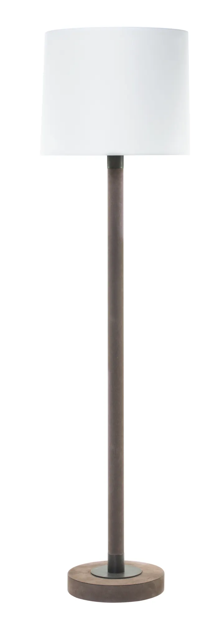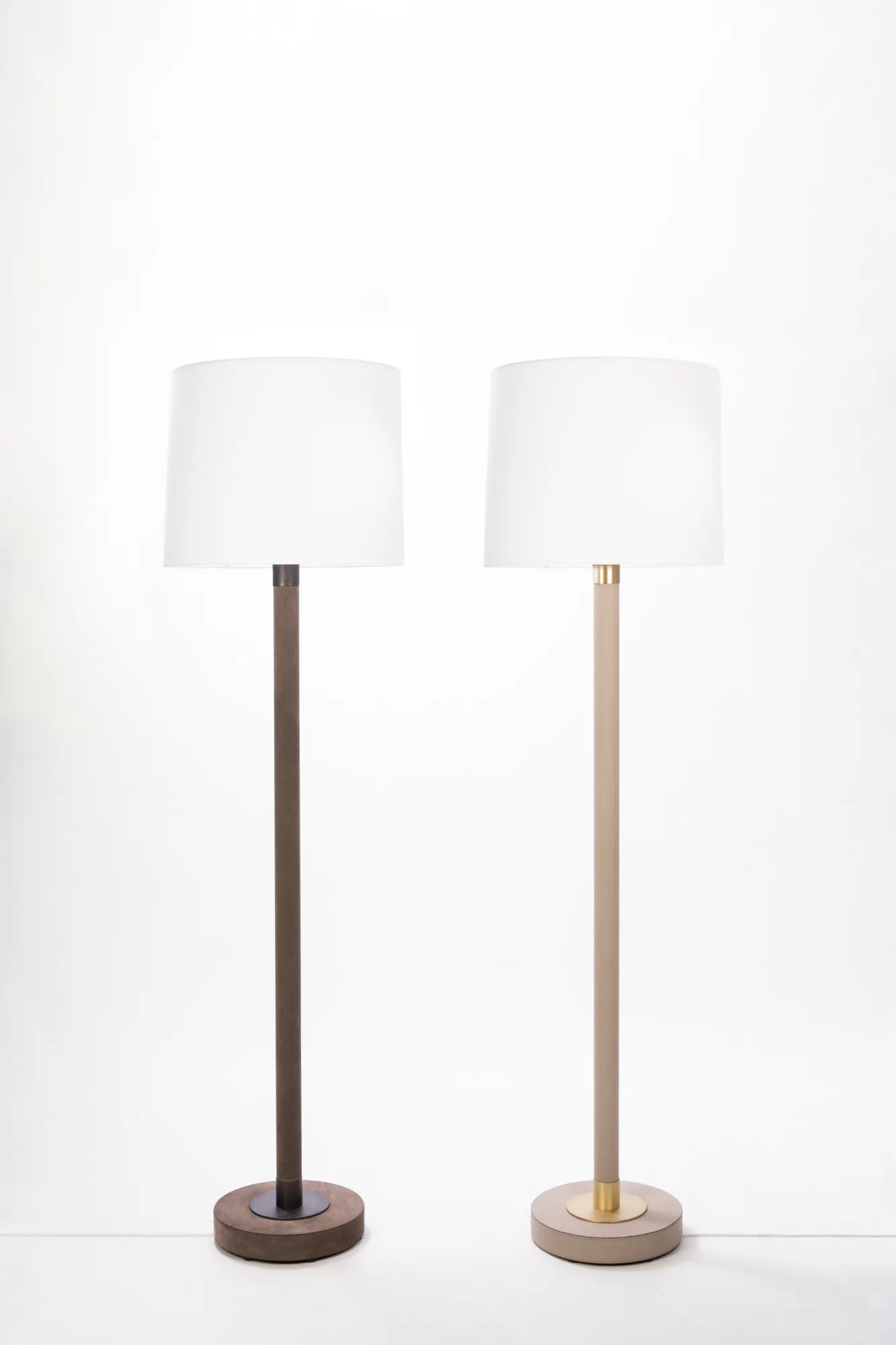 Leather-covered wood structure with metal inserts and fine white cotton lampshade with fireproof diffuser. Provided with In-Line foot switch.