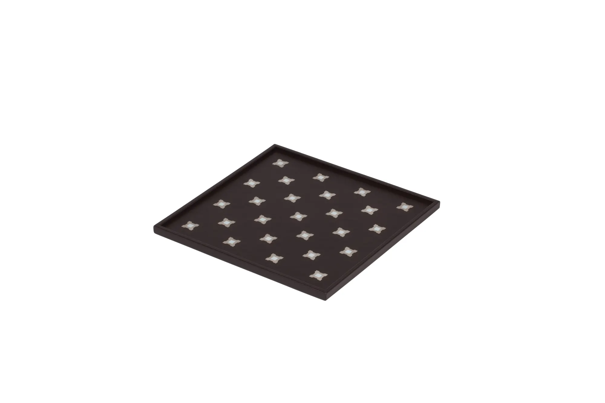This set of four trays in marquetry of nappa leather and suede presents a reinterpretation of various decorative elements and the motto "Venturi non immemor aevi" (=looking to the future without forgetting the past) emblazoned on the façade of the Bagnara family palazzo at Via Garibaldi 12 in Genoa. An architecturally informed vocabulary manifests itself with all the force of timeless elegance.
