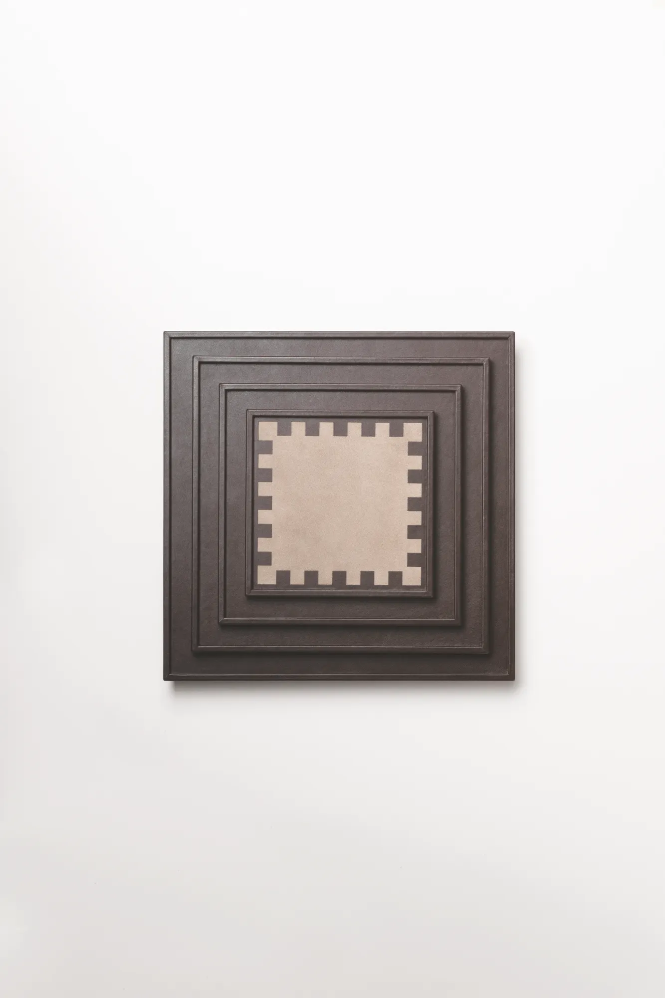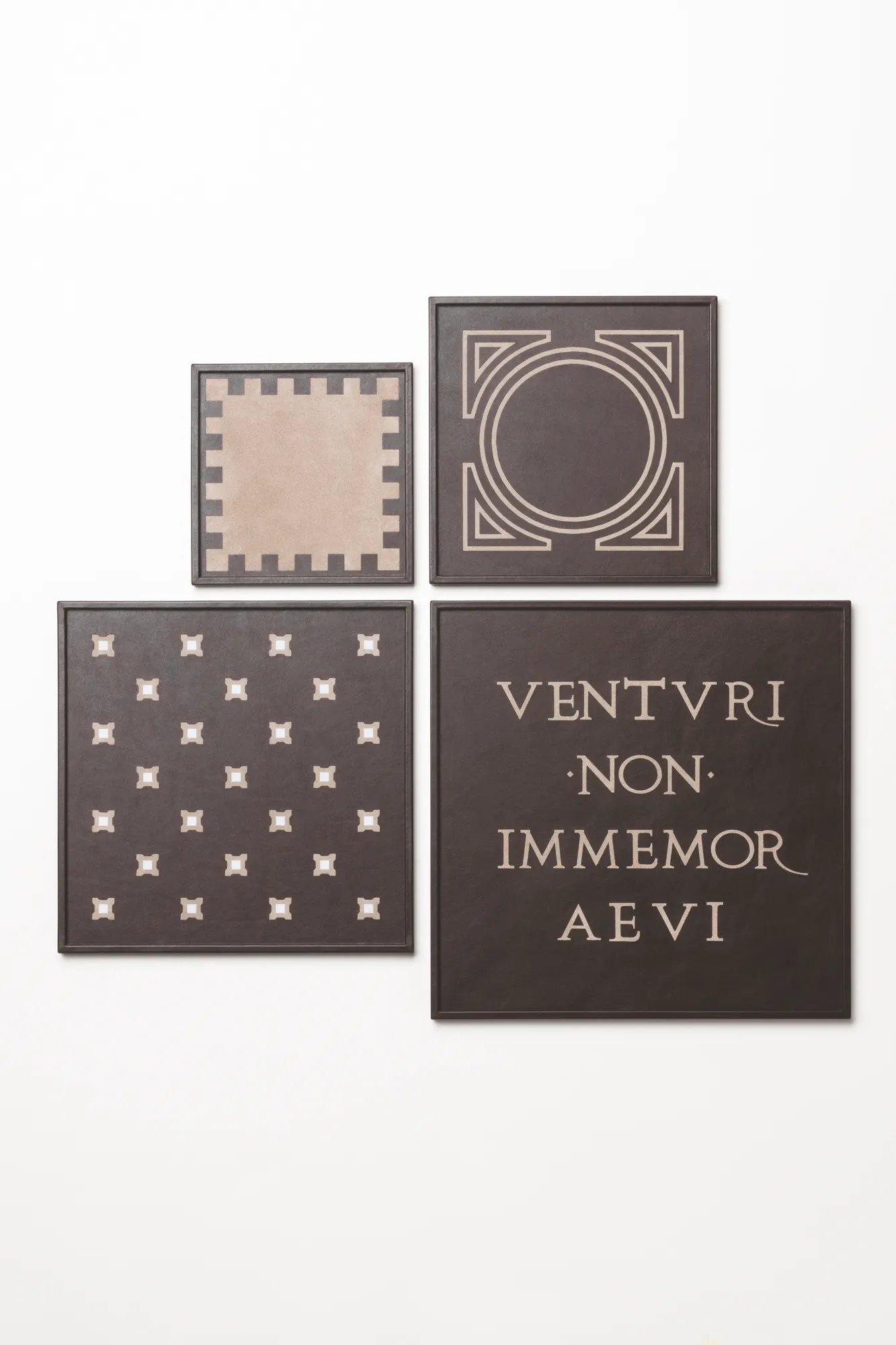 This set of four trays in marquetry of nappa leather and suede presents a reinterpretation of various decorative elements and the motto "Venturi non immemor aevi" (=looking to the future without forgetting the past) emblazoned on the façade of the Bagnara family palazzo at Via Garibaldi 12 in Genoa. An architecturally informed vocabulary manifests itself with all the force of timeless elegance.