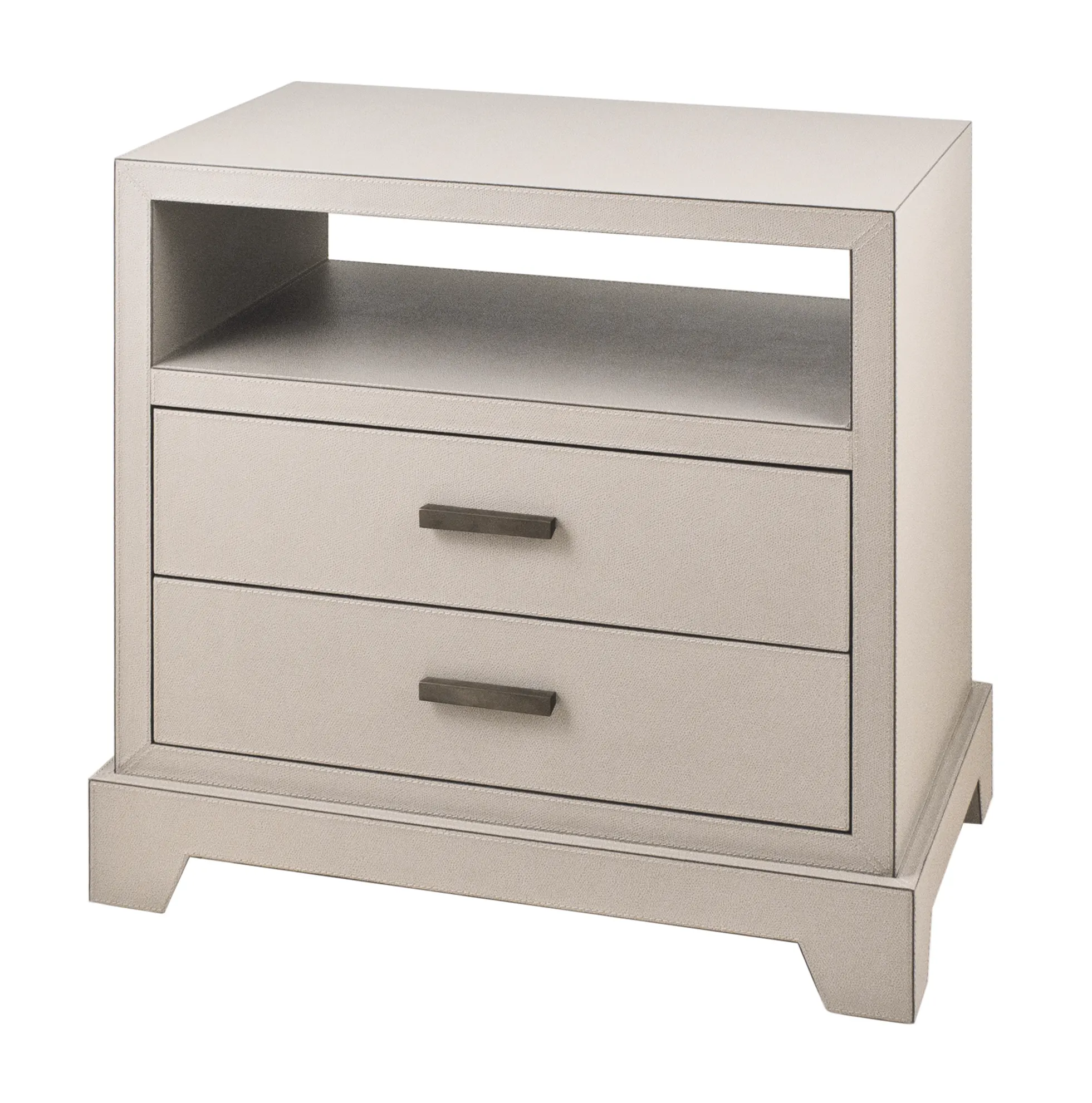 Leather covered wood bedside cabinet. Special soft closing drawers with suede lining. Bronze handles.